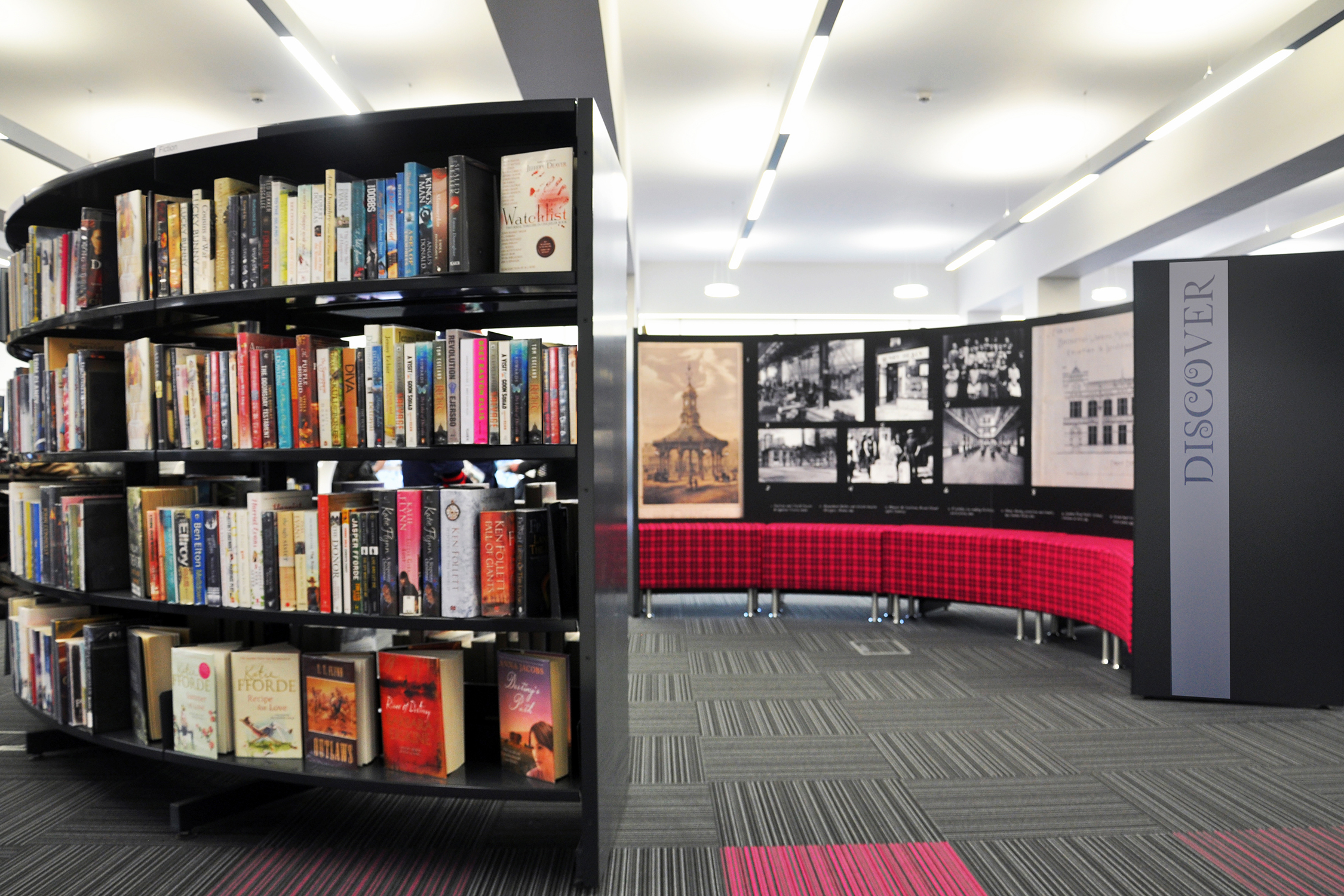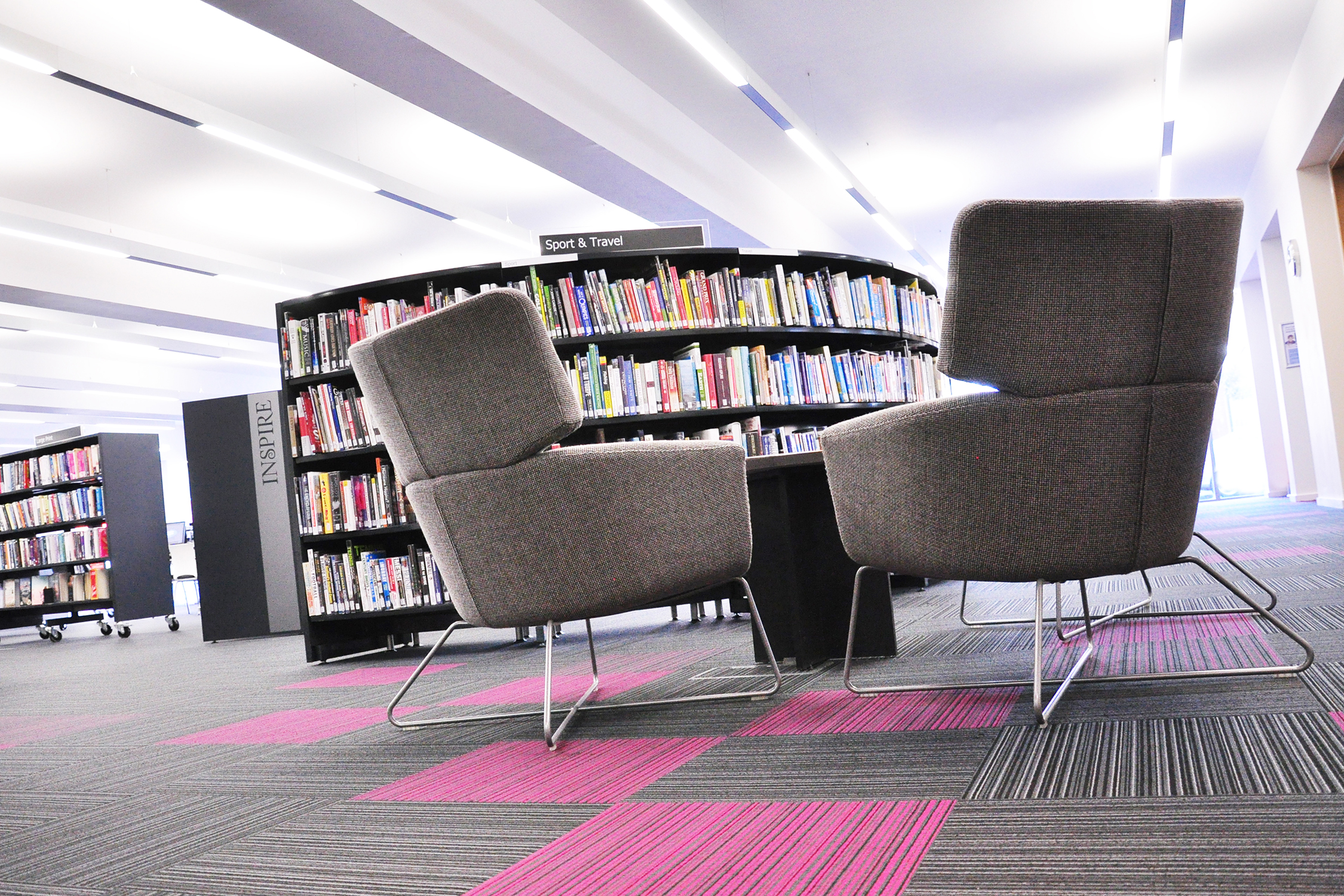 Die Hauptthemen und Bereiche der Bibliothek werden durch Grafiken und Schilder aufgewertet, die mit Genehmigung der Hofdichterin der Kinder, Julia Donaldson, verwendet werden. Dabei setzten wir ihre beliebten Gruffalo-Darstellungen als Wandgrafiken in der Kinderabteilung ein und führten dieses Thema bis hin zu den maßgeschneiderten Minimöbeln weiter.