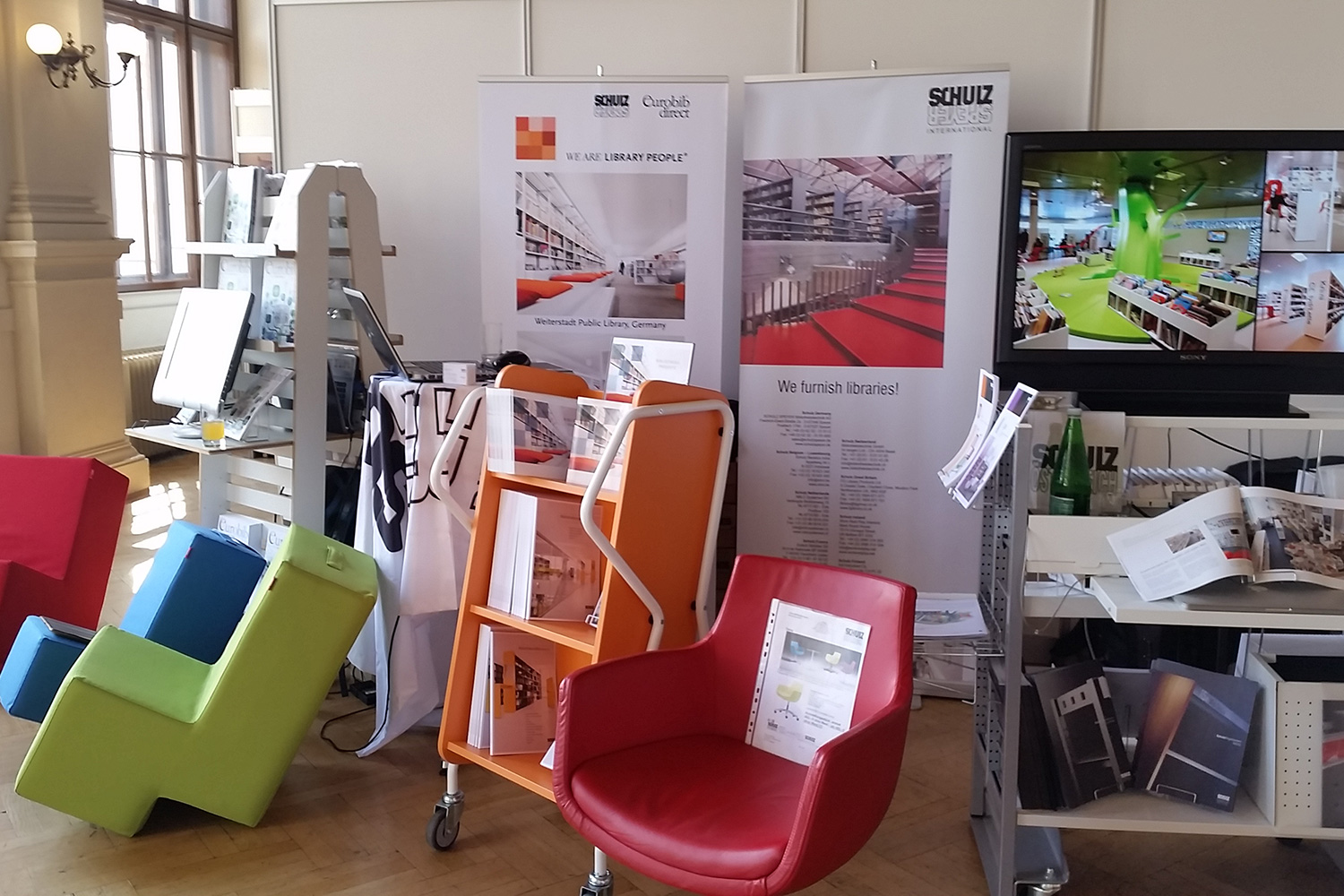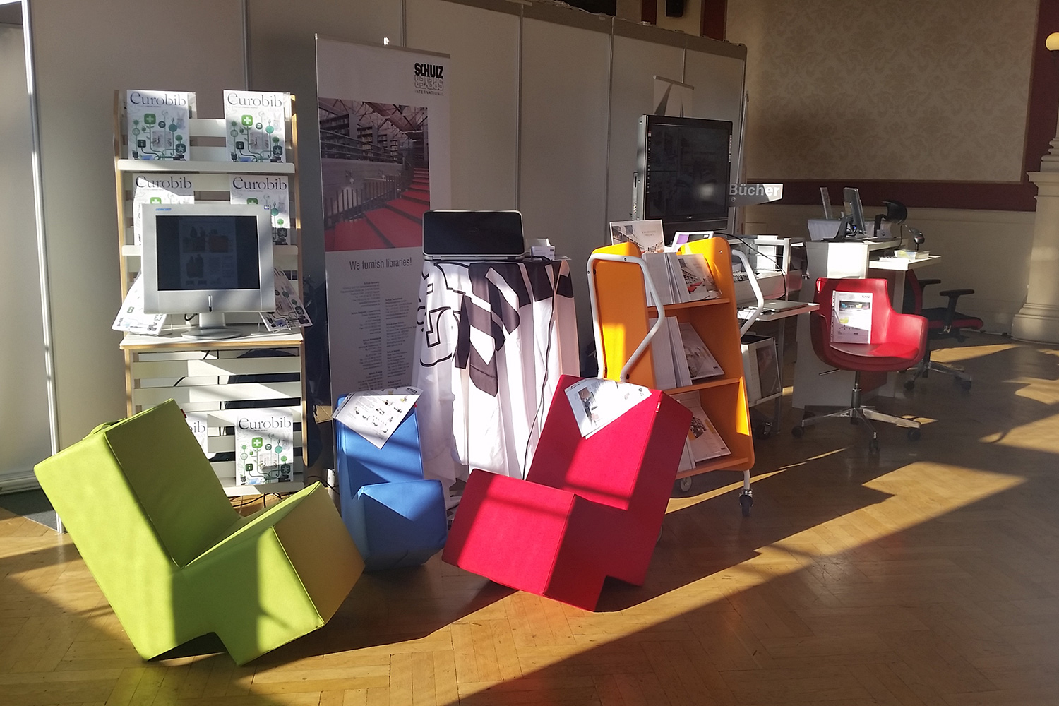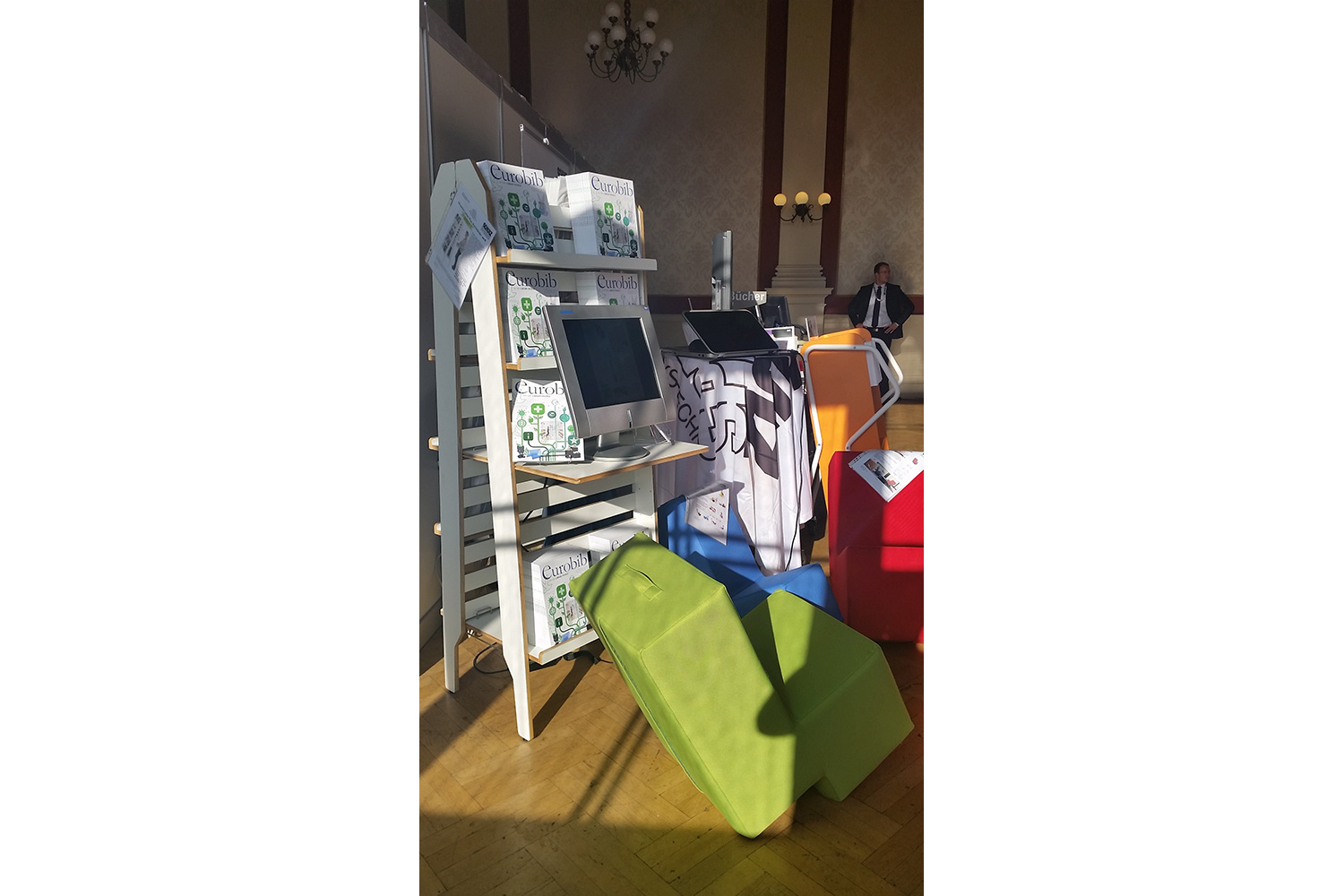 Mit QUERLÄUFER, INFORM Opac (welcher in Kooperation mit unserer Partnerfirma auf Selbstverbuchungsstation aufgerüstet war), sowie Drehstuhl und lounge Sessel, konnten wir vielseitiges Interesse an Besuchern wecken.
