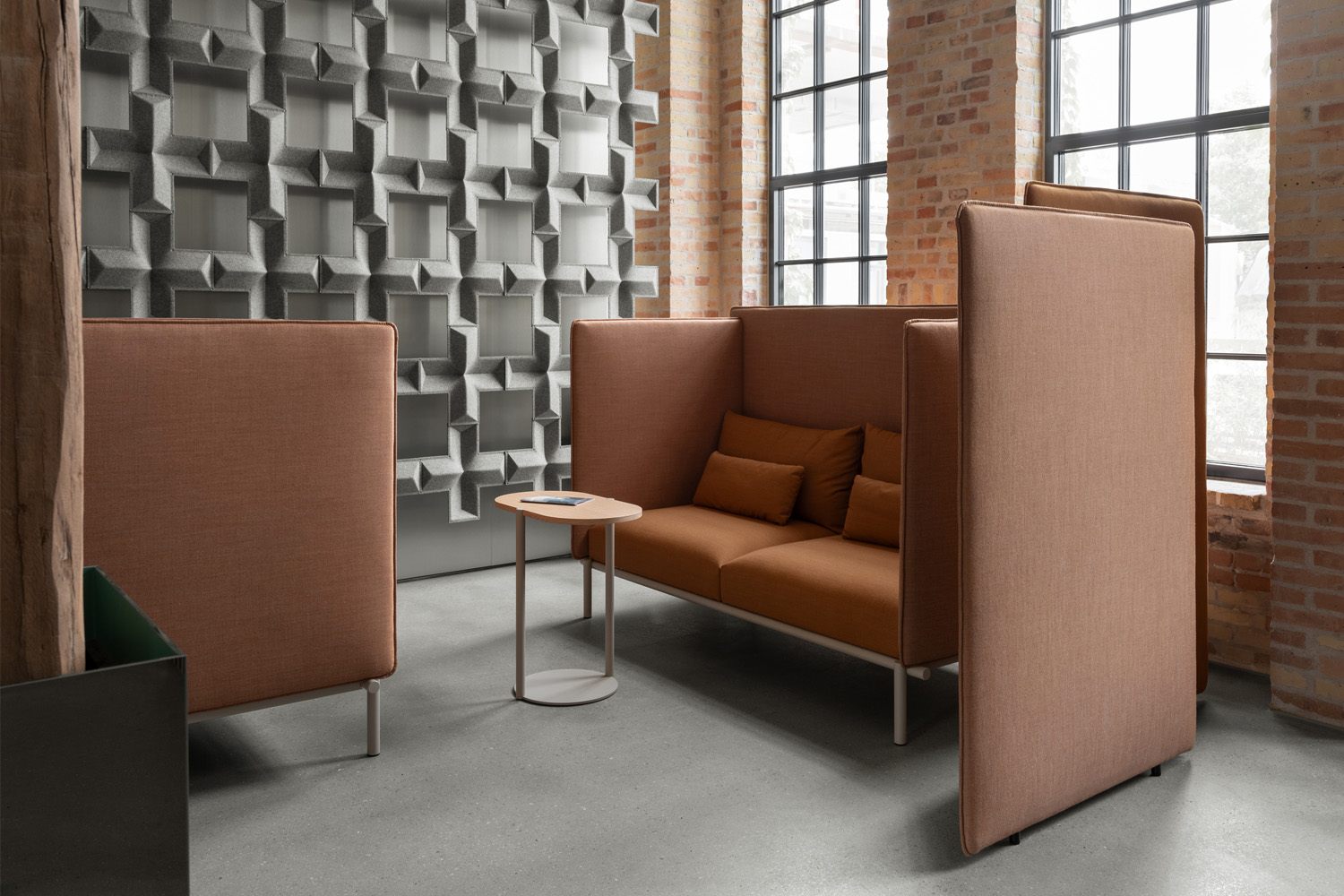 Die Akunok-Kollektion wurde entwickelt, um den Geräuschpegel zu reduzieren und eine ruhigere Atmosphäre zu schaffen. Sie umfasst bequeme Akustik-Sofas und -Sessel, eine innovative Trennwand und leichte Tische.