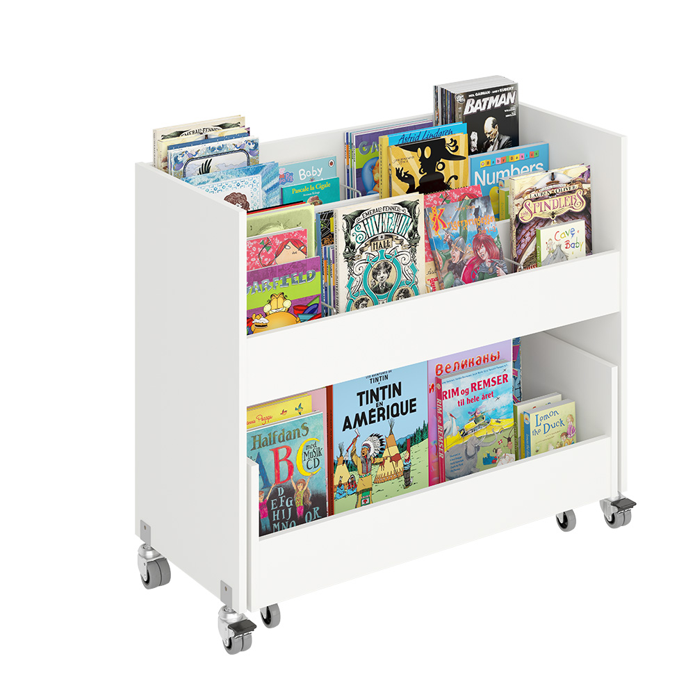Beliebter Bilderbuchtrog mit drei Präsentationsfächern jeweils mit zwei verstellbaren Trennwänden und Aufbewahrungsschubladen mit zwei Fächern auf Rollen im unteren Bereich.