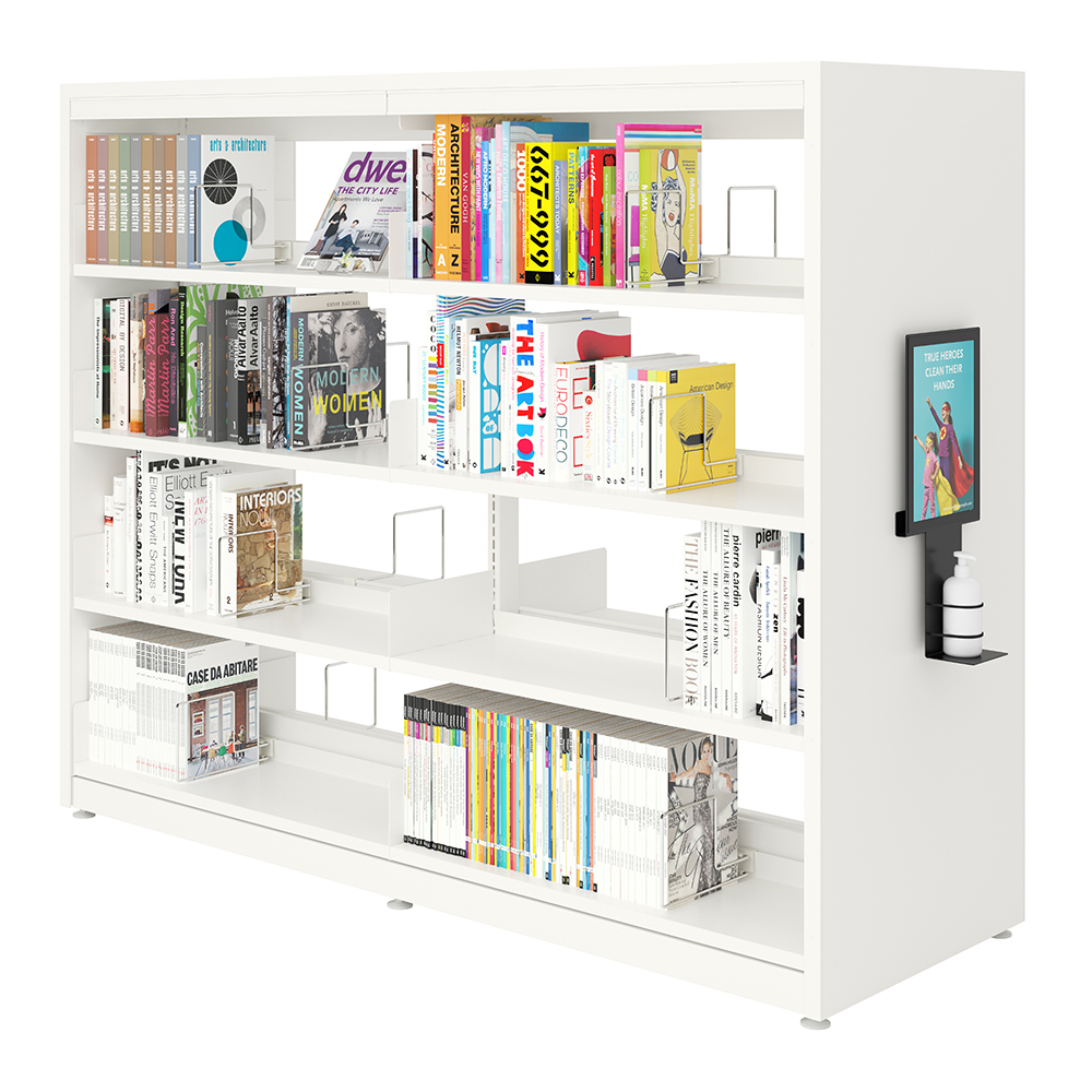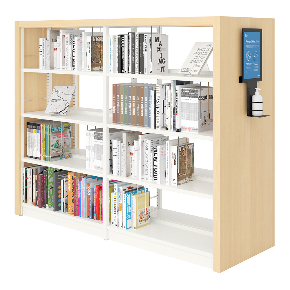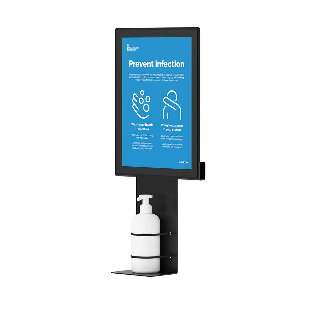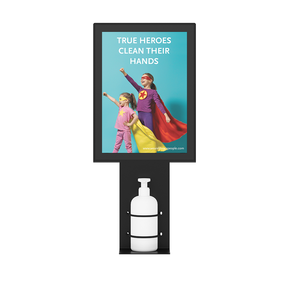 Wandmontierter Spender für Handdesinfektion mit A4 magnetischem Rahmen für einfachen Tausch der Beschriftung.