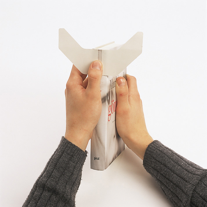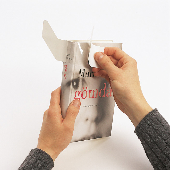 Selbstklebender Buchrückenverstärker mit patentiertem Mitteltrennschnitt.