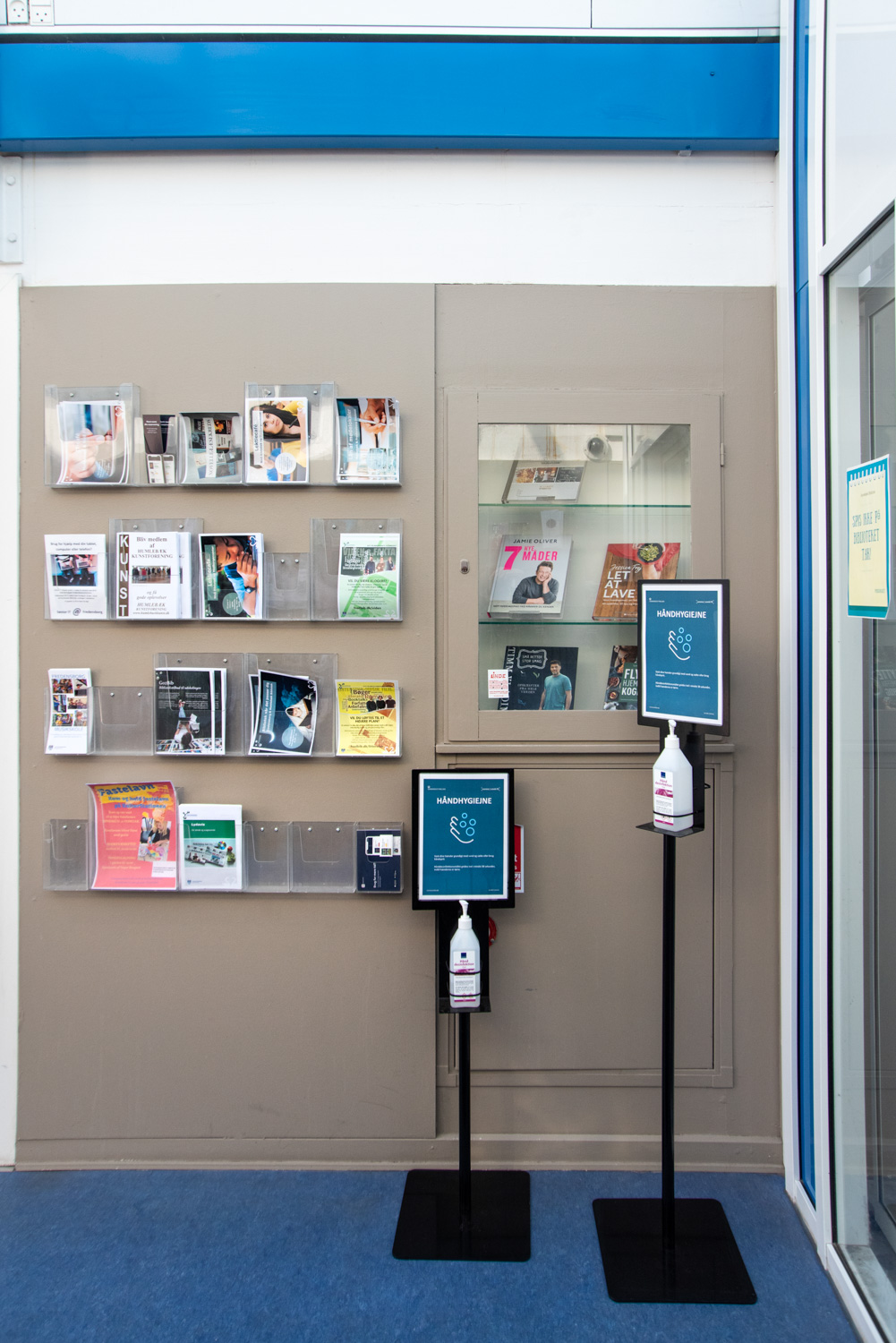 Platzieren Sie den Ständer im Eingangsbereich, Rückgabebereich, Infotheken und Opacs um eine optimale Hygiene in der ganzen Bibliothek sicherzustellen.
