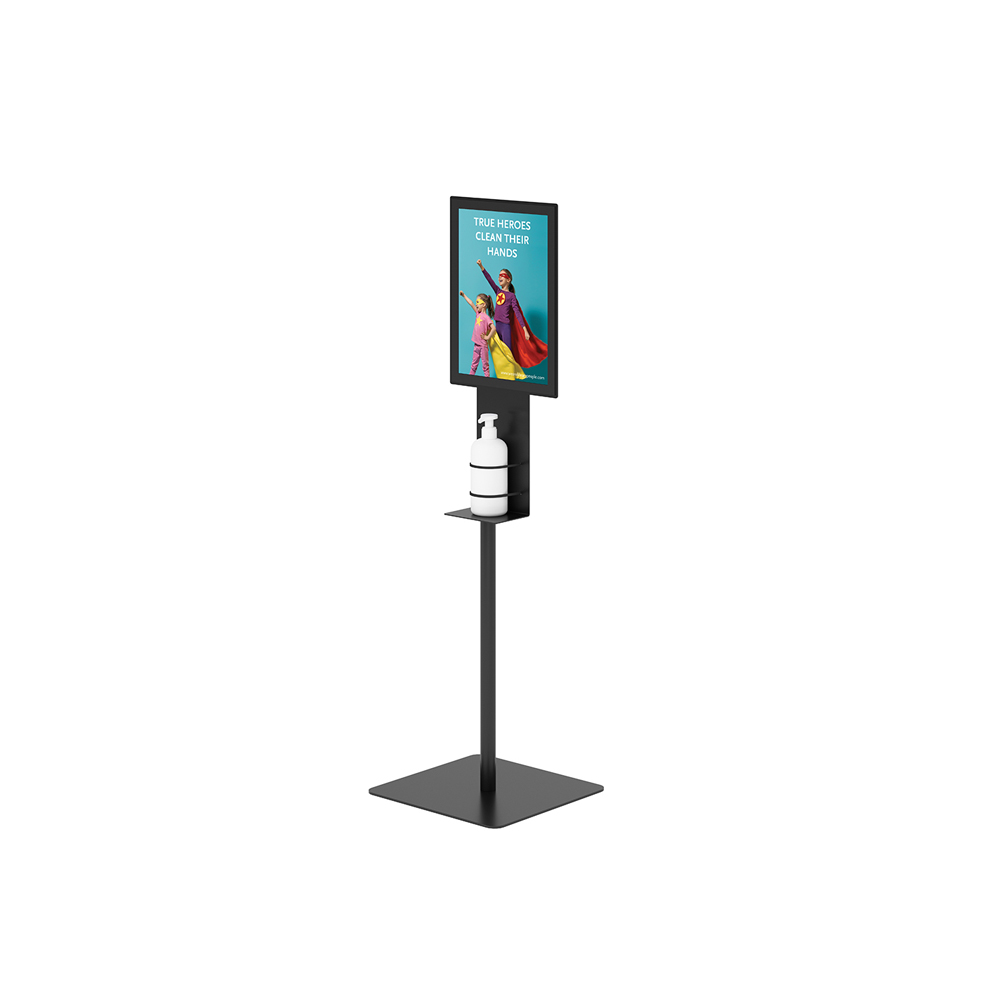 Freistehender stabiler Spender zur Handdesinfektion mit einem A4 Magnetrahmen, welcher mit entsprechender Information versehen werden kann.