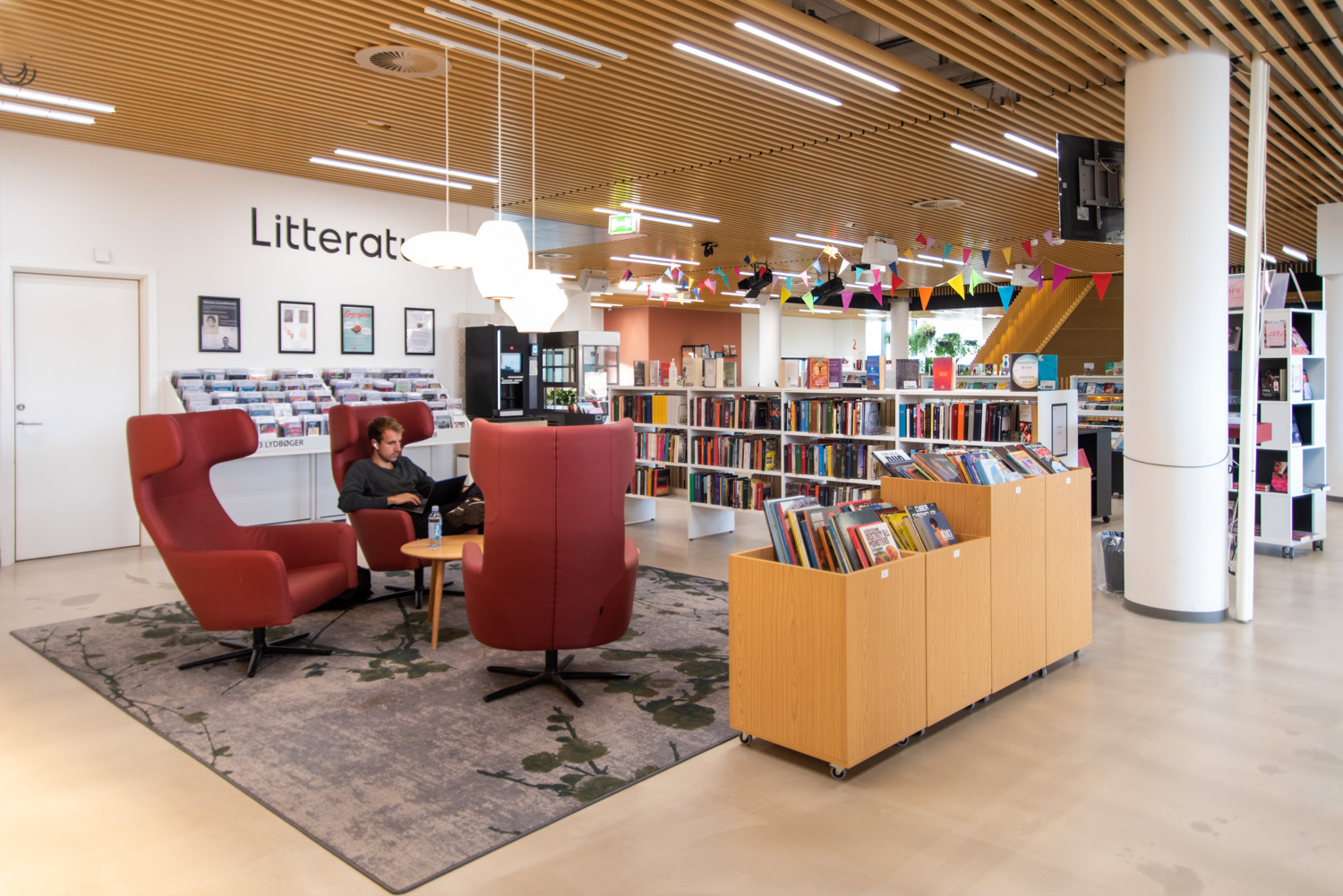 Der Sessel Havana von Softline ist ein zeitloser Klassiker, der dem Bibliotheksinterieur Wärme und Gemütlichkeit verleiht.
