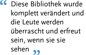 Die Menschen besuchen die Bibliothek aus verschiedenen Gründen: um die Computer zu benutzen, Zeitungen und Zeitschriften zu lesen und natürlich Bücher zu finden! Und ist eine geschätzte Einrichtung innerhalb der Gemeinschaft. Die Bibliothek wurde für Benutzer aller Altersgruppen und Interessen konzipiert und bietet jedem Benutzer einen herzlichen Empfang. Der Kinderbereich macht eine visuelle Wirkung mit atemberaubenden Wandgrafiken, die sich bis zu den Möbeln erstrecken. Eine Bühne wurde eingebaut und ist mit integrierten, bunten Kinderboxen umgeben, so dass die Kinder problemlos in den Büchern blättern können. Um das digitale Thema fortzusetzen, wurde auch ein interaktiver Großbildschirm installiert. Die Bibliothek ist jetzt 7 Tage die Woche geöffnet und verdient sicherlich den Flaggschiff-Status, den sie erhalten hat.
