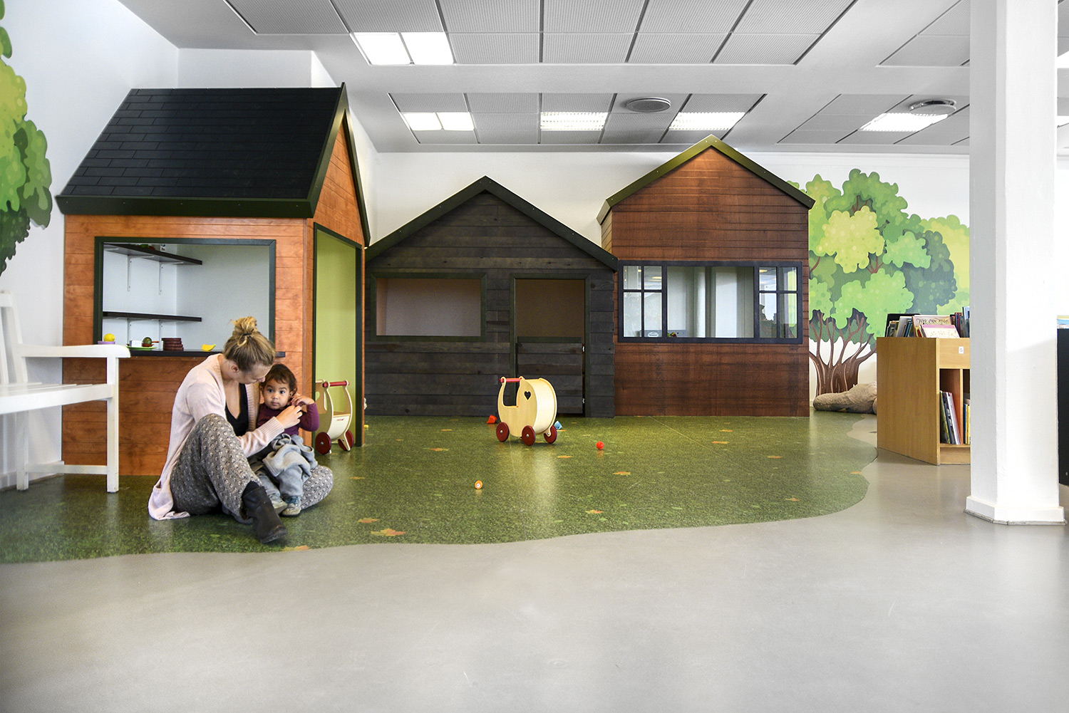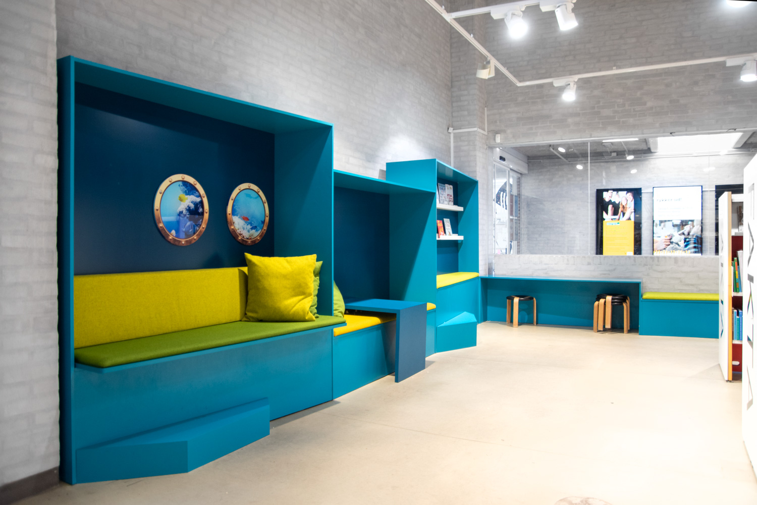 Die Kinderbibliothek ist ein lebendiger Treffpunkt für Familien, in dem Kinder nicht nur lesen, sondern auch spielen und zwischen Bilderbuch-Trögen und speziell entworfenen Höhlenmöbeln auf Entdeckungsreise gehen können. Das maritime Thema entfaltet sich durch Grafiken an den Wänden, und die Kinder tauchen in die Fantasiewelt ein, die durch das Ladby-Schiff in der Umgebung dominiert wird. Am anderen Ende der Bibliothek befindet sich der Zeitungsbereich, in dem Besucher sich beim Lesen entspannen können. Vor allem ältere Menschen kommen hier zusammen, um über lokale Ereignisse zu diskutieren und sich mit anderen Bewohnern der Gemeinde auszutauschen.