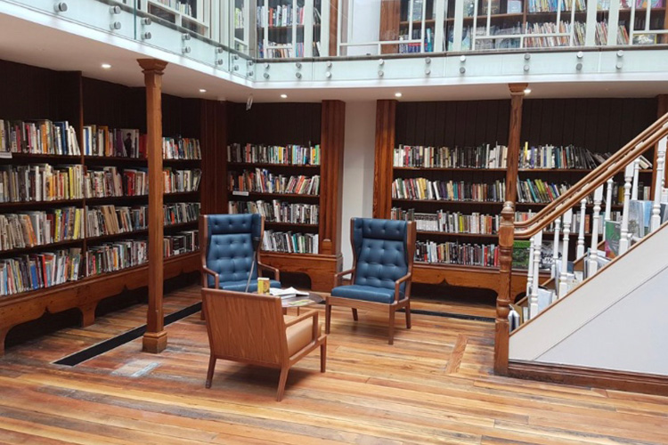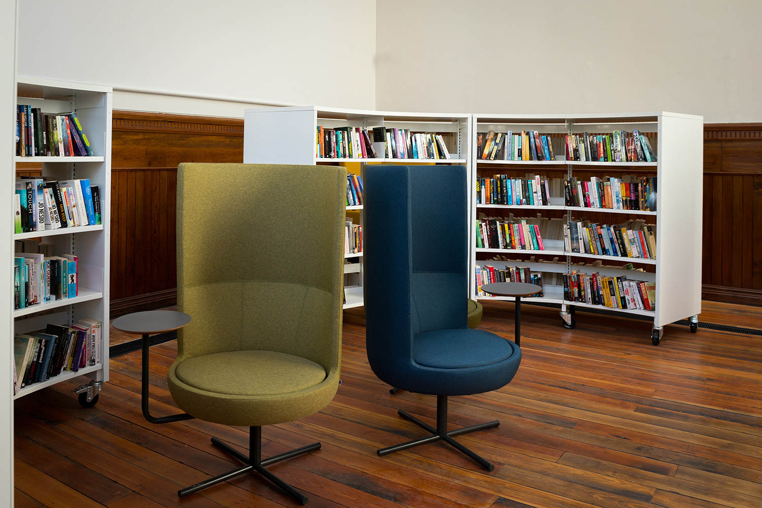 - Eine Bibliothek für Erwachsene, in der moderne Möbel nahtlos mit dem traditionellen Ambiente des Raumes harmonieren. Die Regale sind flexibel und können leicht für öffentliche Veranstaltungen verschoben werden. Hochlehnstühle mit akustischen Eigenschaften und Stehtische geben den Benutzern ein Gefühl der Privatsphäre und einen Ort, an dem sie ihre eigenen Laptops / Geräte verwenden können.