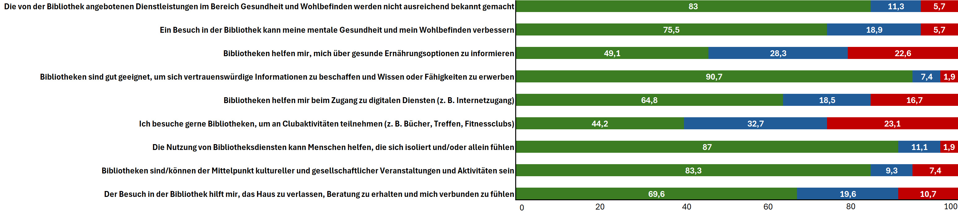 (Grün = Zustimmung; Blau = Weder Zustimmung noch Ablehnung; Rot = Ablehnung).