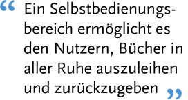 Die LGSS forderte die Bibliothek auf, "autark" zu sein, da in dem Raum möglicherweise nicht immer Mitarbeiter zur Verfügung stehen. Ein Selbstbedienungsbereich ermöglicht es den Nutzern, Bücher nach Belieben auszuleihen und zurückzugeben.