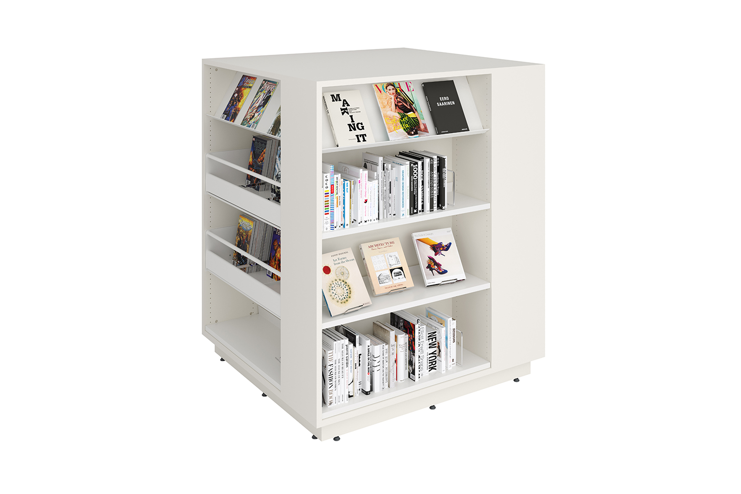 Setzen Sie das quadratische Regalsystem zur Unterbringung einer großen Büchermenge ein – oder als Display unter Verwendung einer Kombination sowohl von flach- als auch schräggestellten Fachböden. Der Abdeckboden des Lingo Square ermöglicht verschiedene Nutzungen – z. B. als Arbeitstisch, Display oder Spielzone.