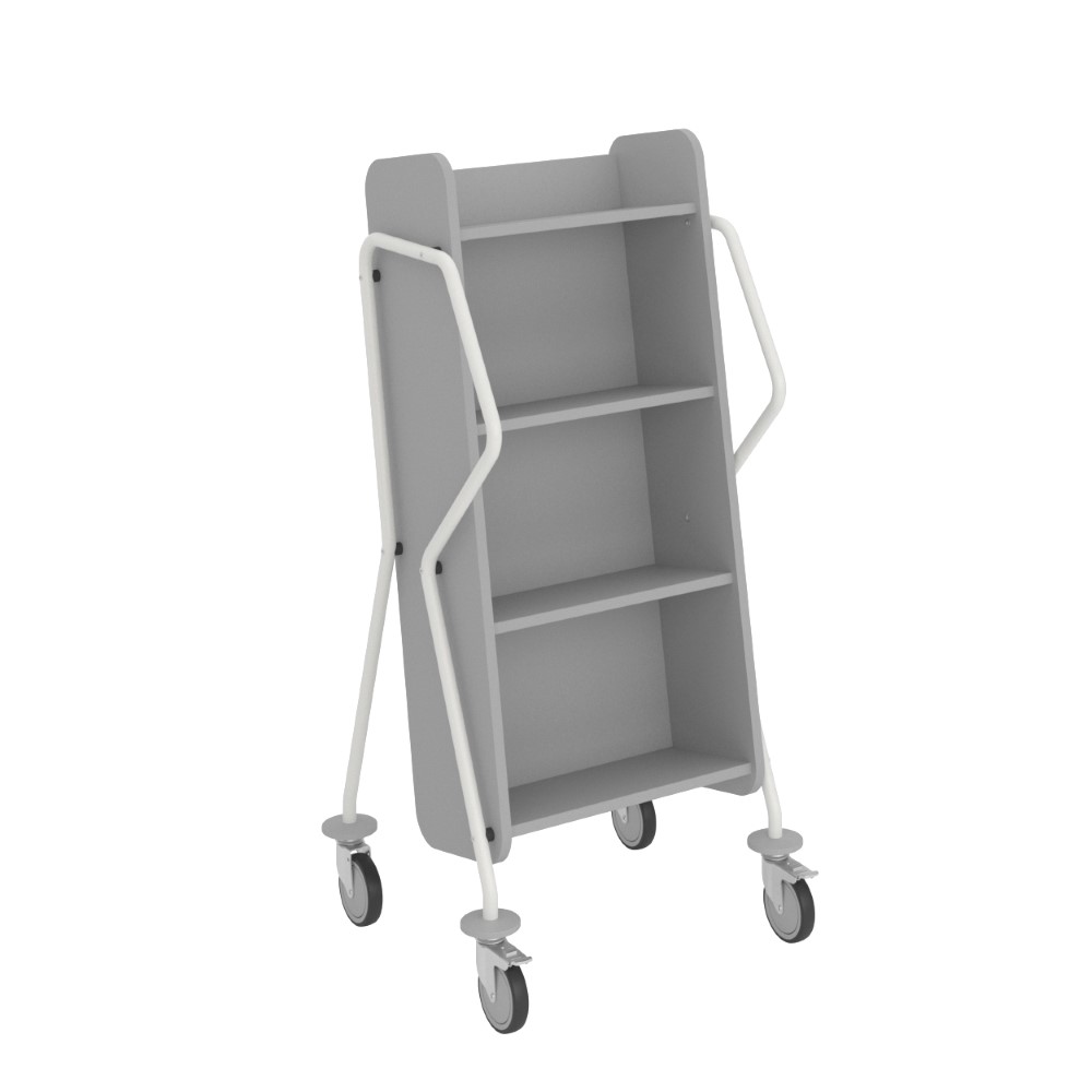 Einseitiger, abgeschrägter Bücherwagen mit vier Fachböden. Großzügiger Platz zwischen den Fachböden um größere Medien untzerzubringen.