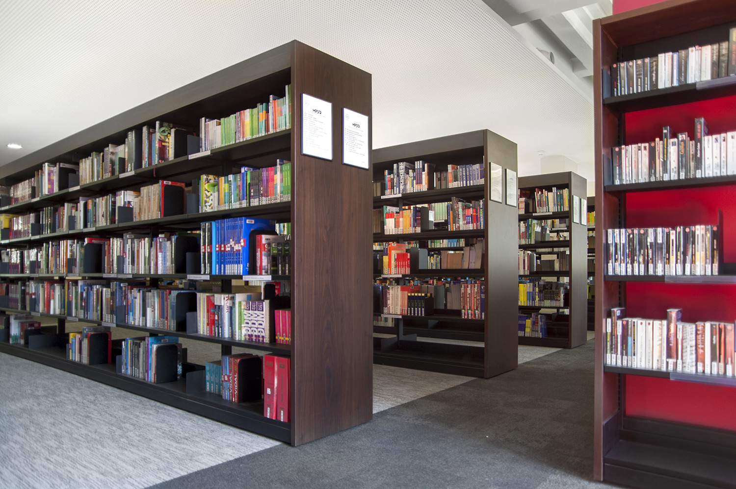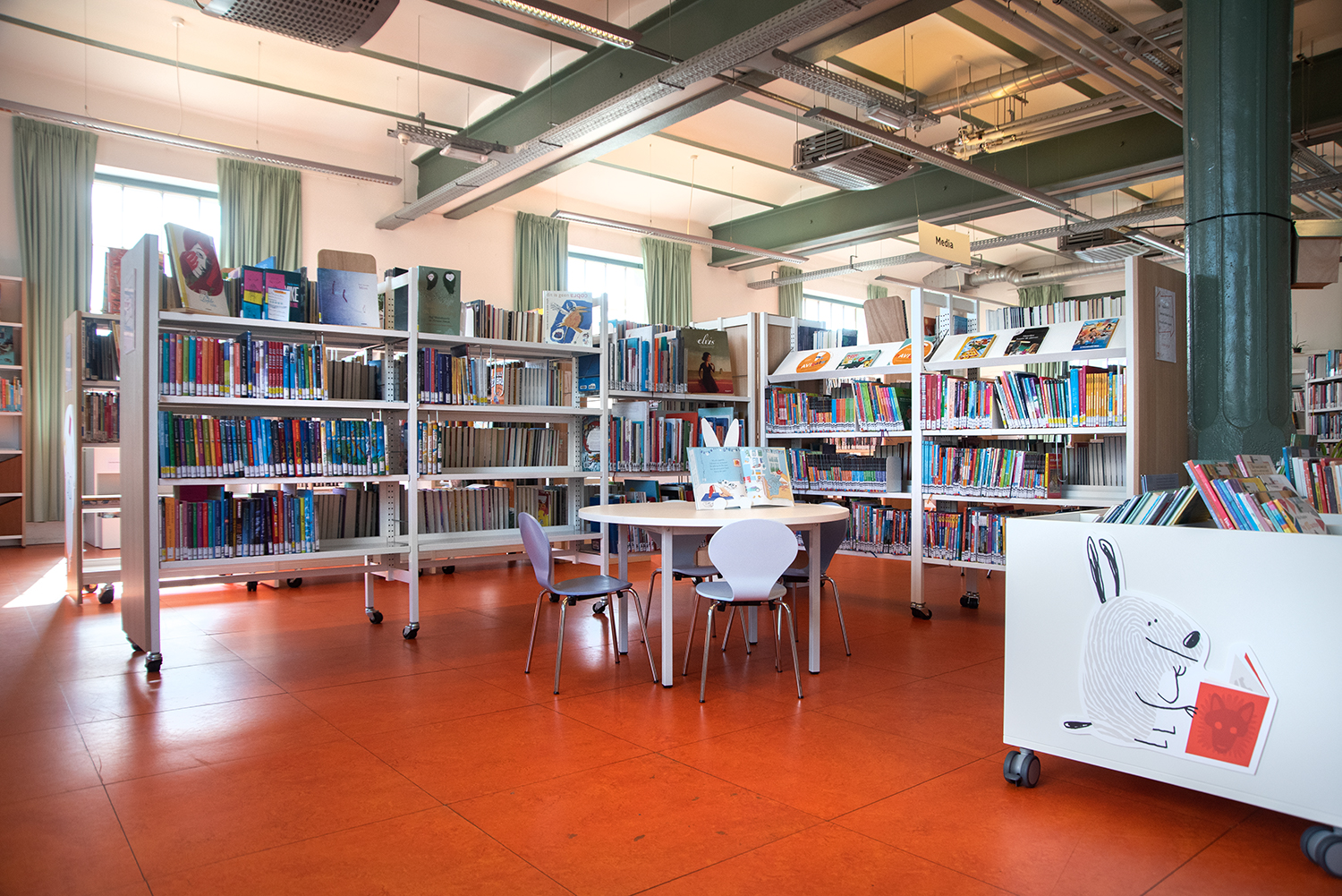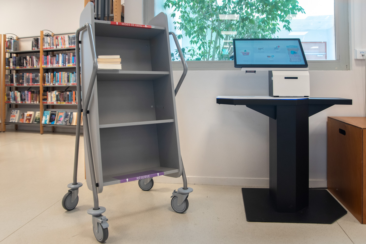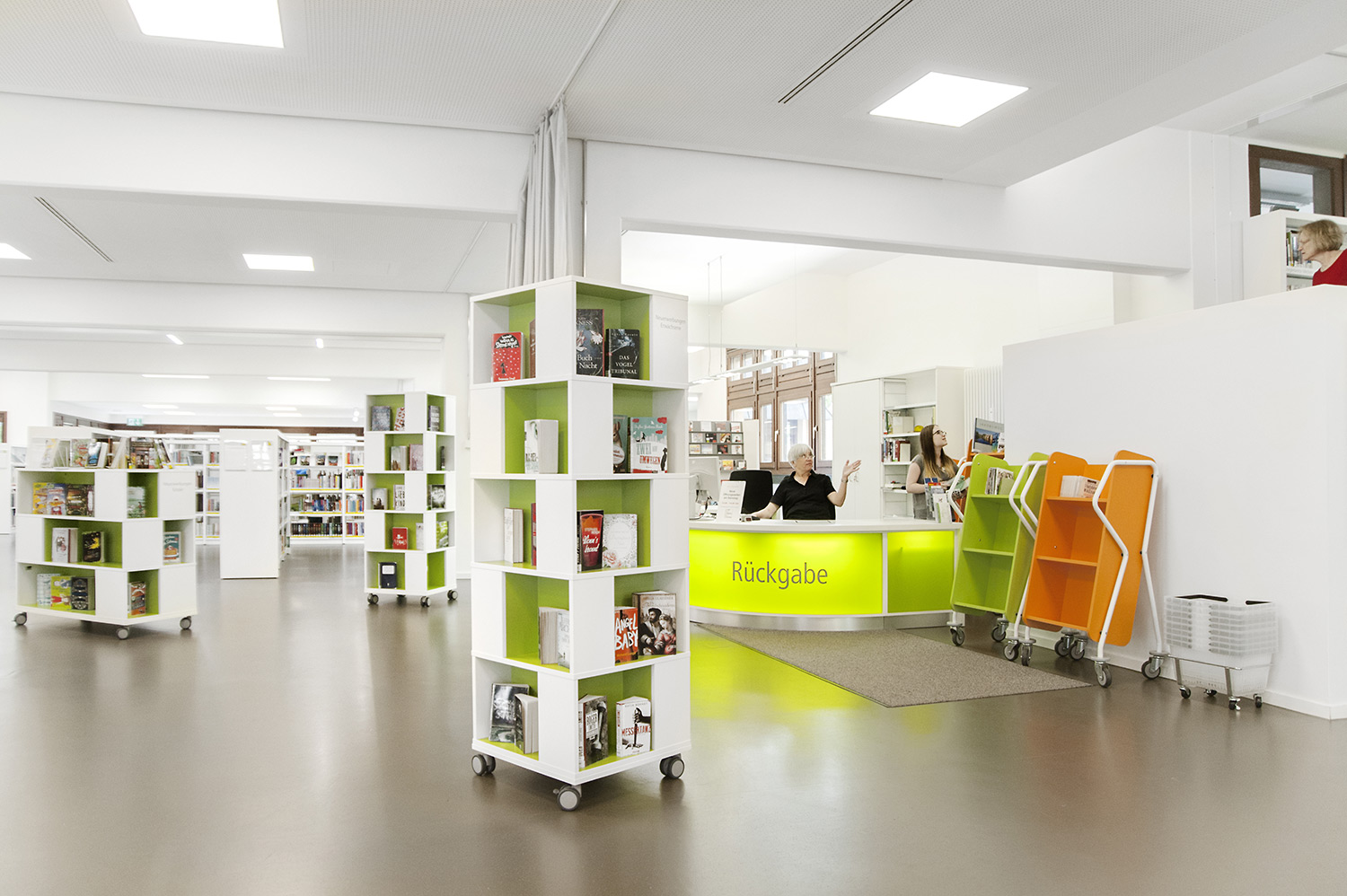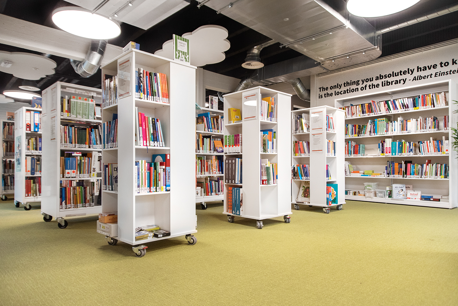 Die Neigung des Bücherwagens sorgt für eine sichere Medienunterbringung und bietet eine gute Übersicht über die jeweiligen Bücher.