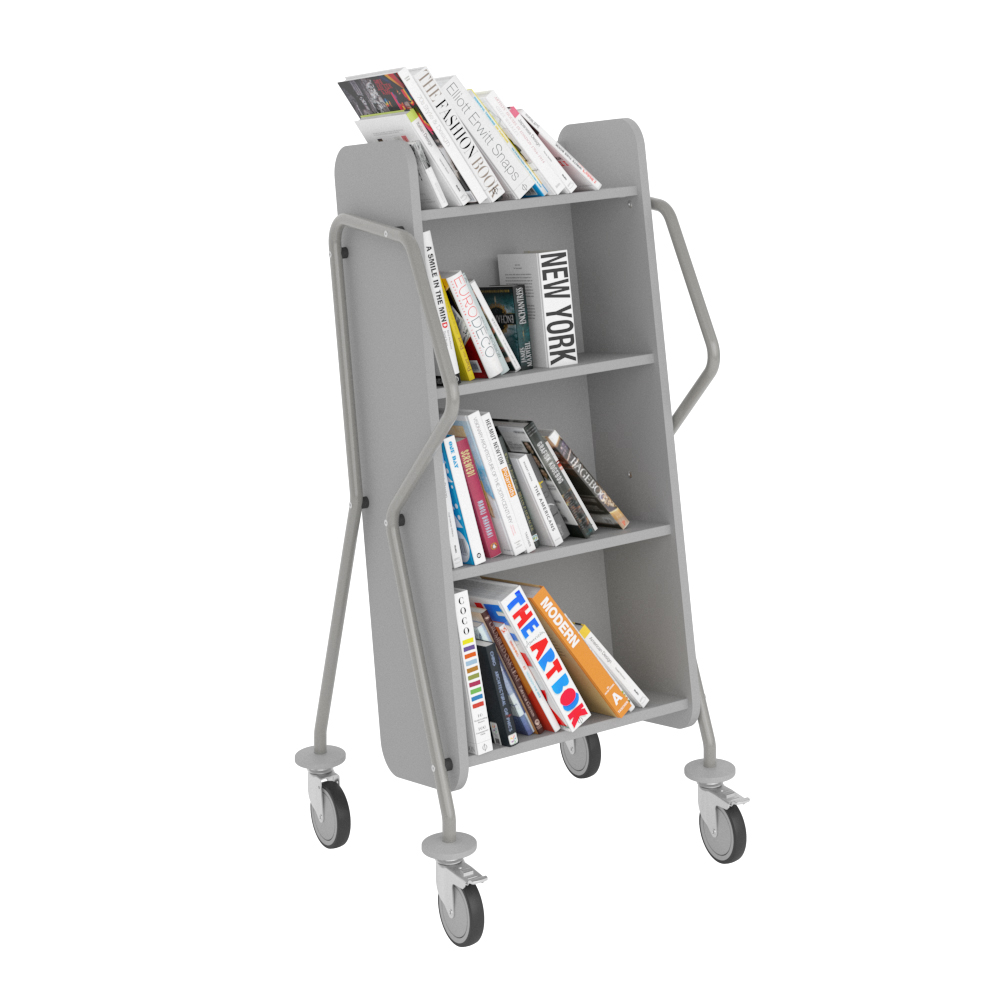 Einseitiger, abgeschrägter Bücherwagen mit vier Fachböden. Großzügiger Platz zwischen den Fachböden um größere Medien untzerzubringen.
