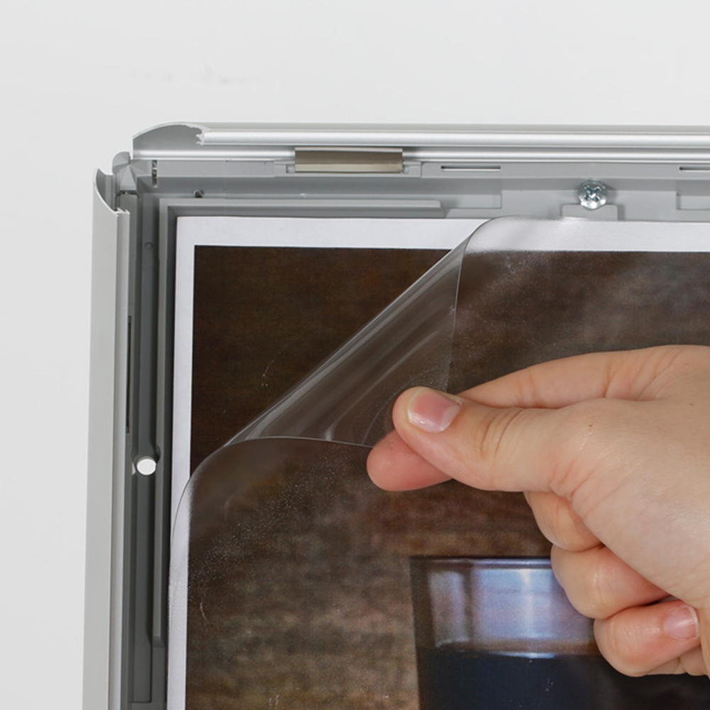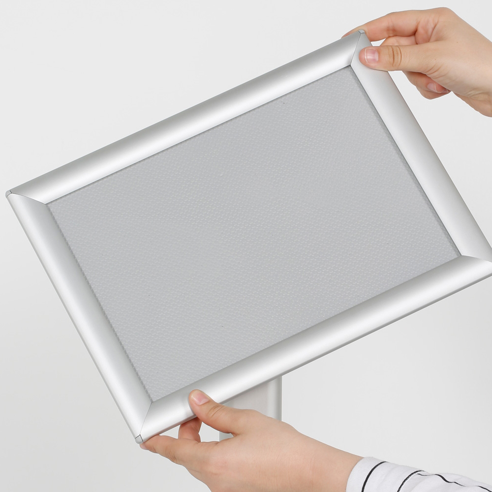 Klemmrahmenständer mit 25 mm Profil. Ein stabiler Fuß und eine nichtreflektierende Folie machen diesen Ständer unabdingbar in der ganzen Bibliothek und im Eingangsbereich.