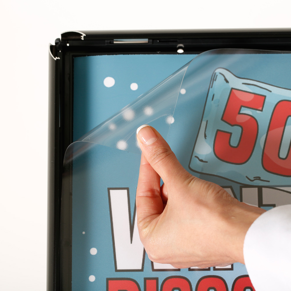 Klemmrahmenständer mit 25 mm Profil. Ein stabiler Fuß und eine nichtreflektierende Folie machen diesen Ständer unabdingbar in der ganzen Bibliothek und im Eingangsbereich.