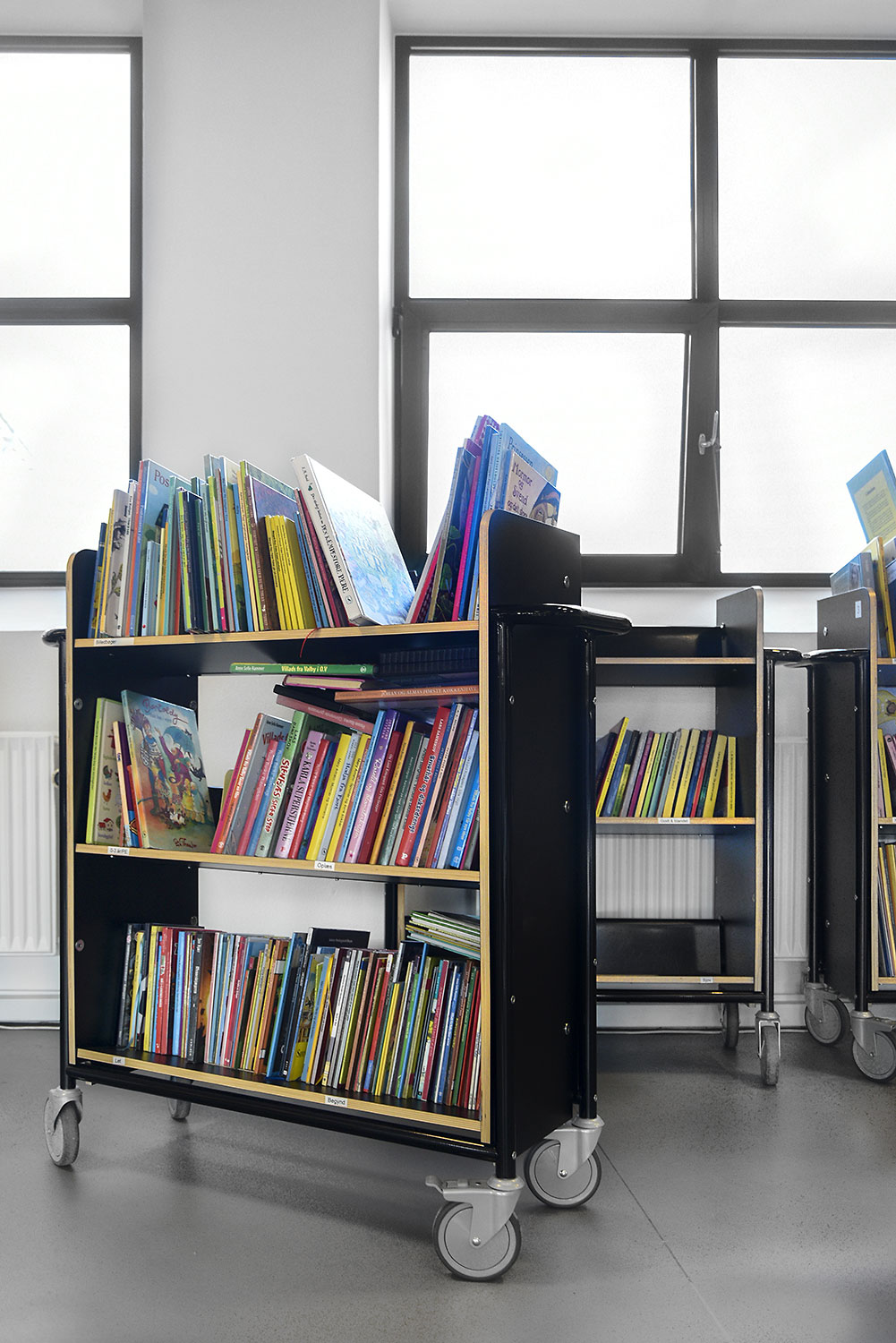 Diesen Bücherwagen kann man als fahrbares Miniregalsystem einsetzen - überall in der Bibliothek, wo es gerade gebraucht wird.