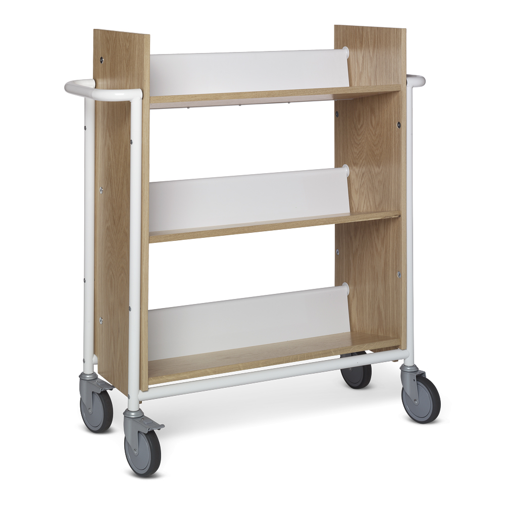 Einseitiger Wagen mit drei festen, rückwärts geneigten Fachböden. Die Neigung sorgt für eine sichere Medienunterbringung.