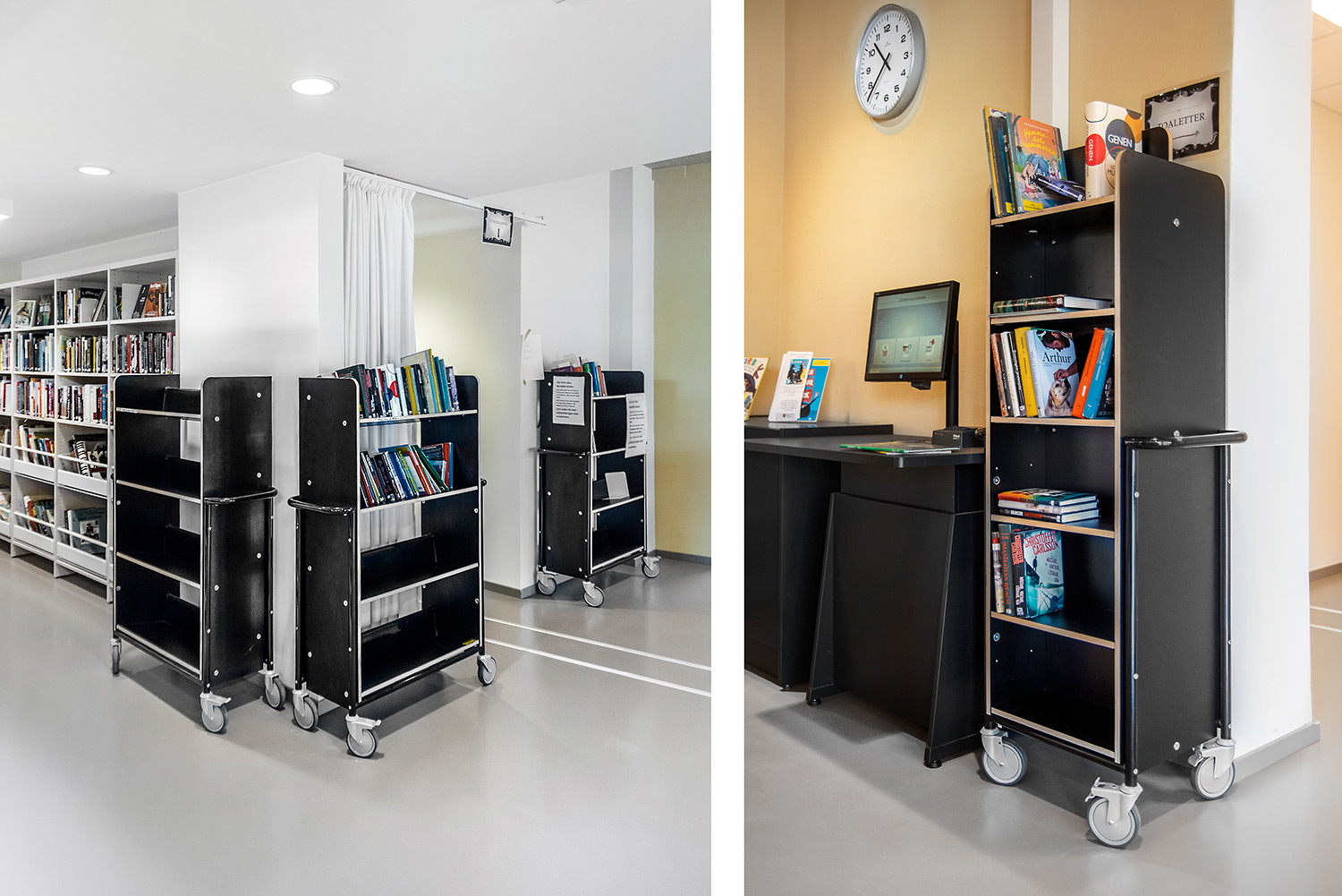 Diesen Bücherwagen kann man als fahrbares Miniregalsystem einsetzen - überall in der Bibliothek, wo es gerade gebraucht wird.