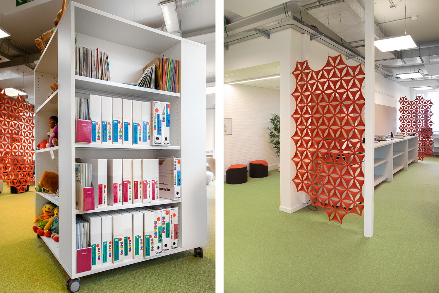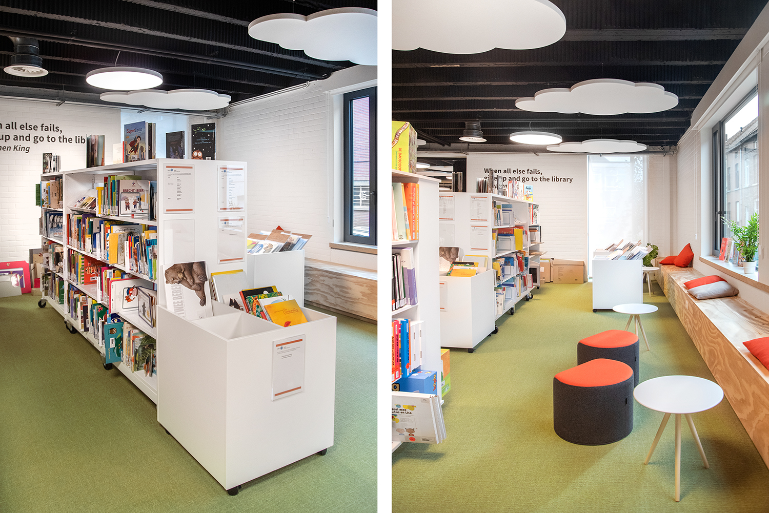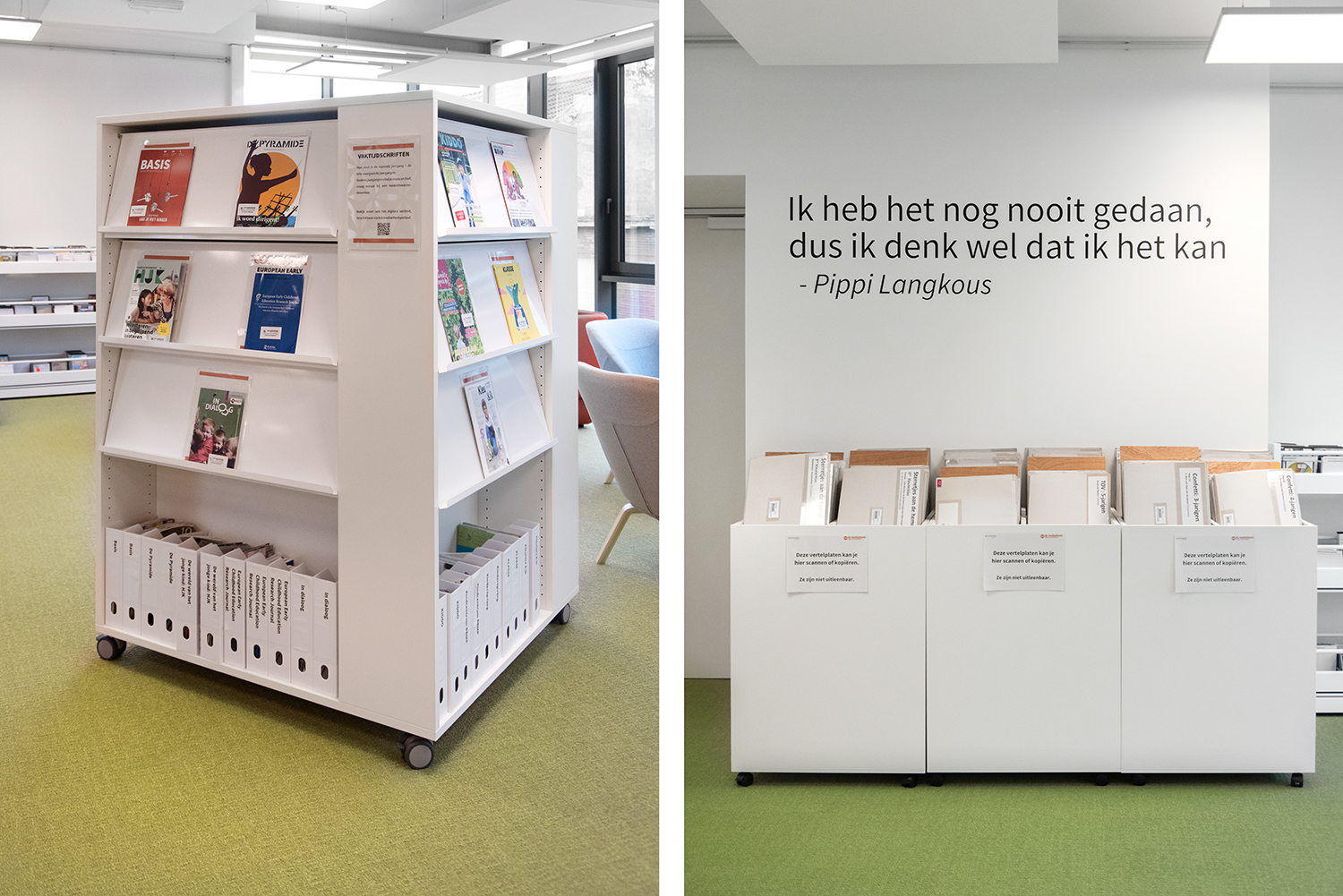 Die renovierte Mediathek verfügt über ein warmes und einladendes Interieur und bietet ausreichend Platz für Meetings und längere Aufenthalte. Die Regalsysteme bestehen aus niedrigen, weißen Regalen, die die Bibliothek leicht und überschaubar machen. Gleichzeitig ermöglicht das mobile Regal eine austauschbare Inneneinrichtung, die es einfach macht, die Platzierung der Bücher und das allgemeine Erscheinungsbild zu ändern.