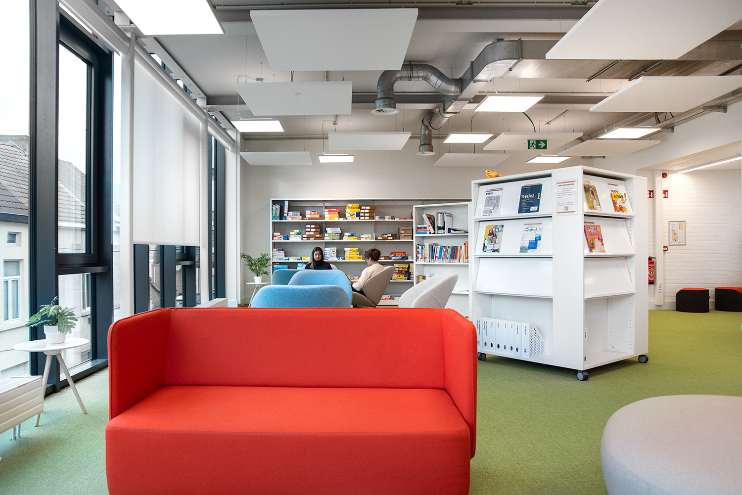 Wie der Rest des Campus wurde auch die Mediathek der Fachhochschule Artevelde in Gent im Jahr 2021 renoviert. Die bestehende Bibliothek wurde komplett renoviert, vergrößert und in eine inspirierende Lernumgebung umgewandelt.