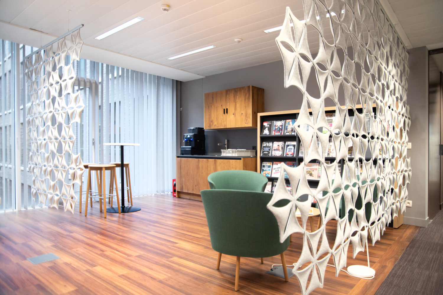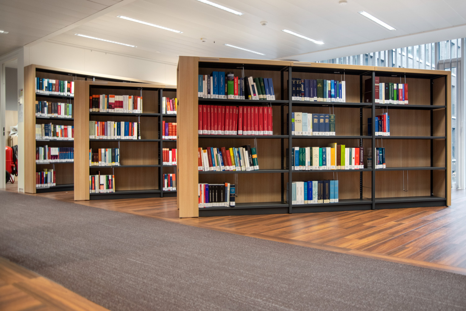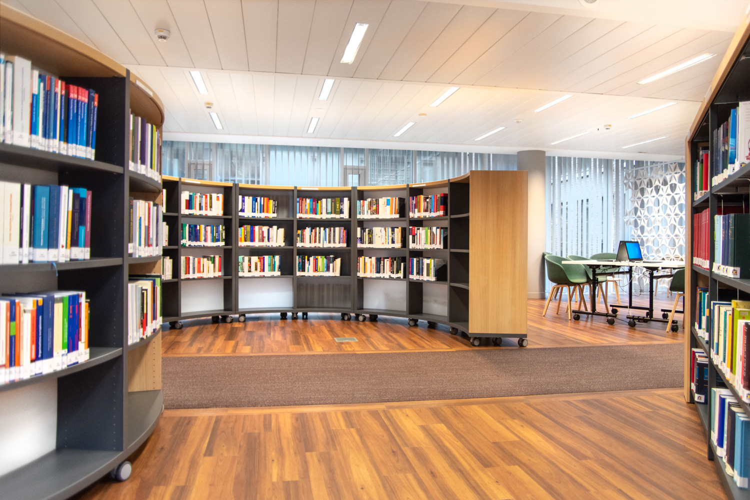 Die runden Regalsysteme verleihen der Inneneinrichtung einen weichen und lässigen Charakter. Verschiedene Arten von Stühlen und Sesseln ermöglichen es dem Leser, seinen Lieblingsplatz zu wählen. Die Farbe des Interieurs ist schön warm. Die Kombination der gewählten Bibliotheksmöbel und Farben macht den Lesesaal zu einem komfortablen Ruhepunkt inmitten der geschäftigen, umliegenden Umgebung.