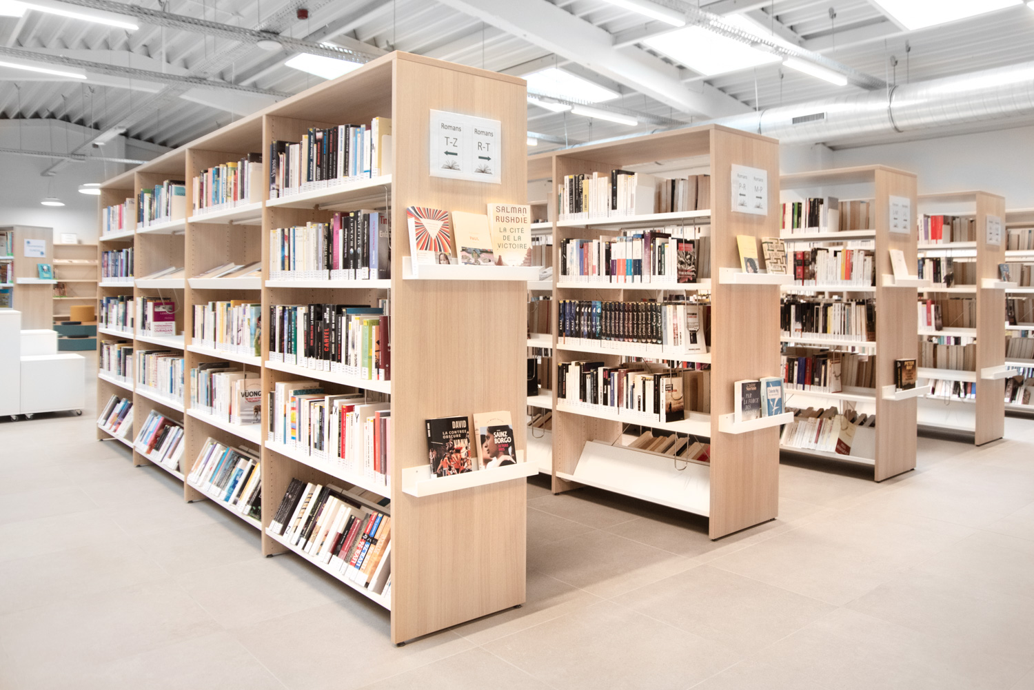 • Strategisch integrierte Ausstellungsbereiche, in denen Neuerwerbungen präsentiert werden, die in die Regale integriert sind, um die neuen Titel nahtlos in die bestehende Sammlung einzufügen;