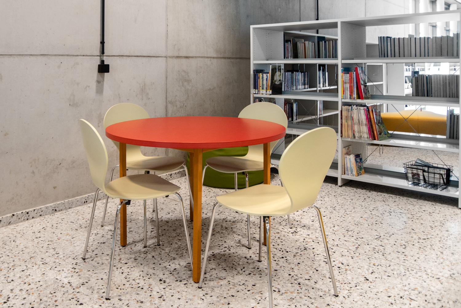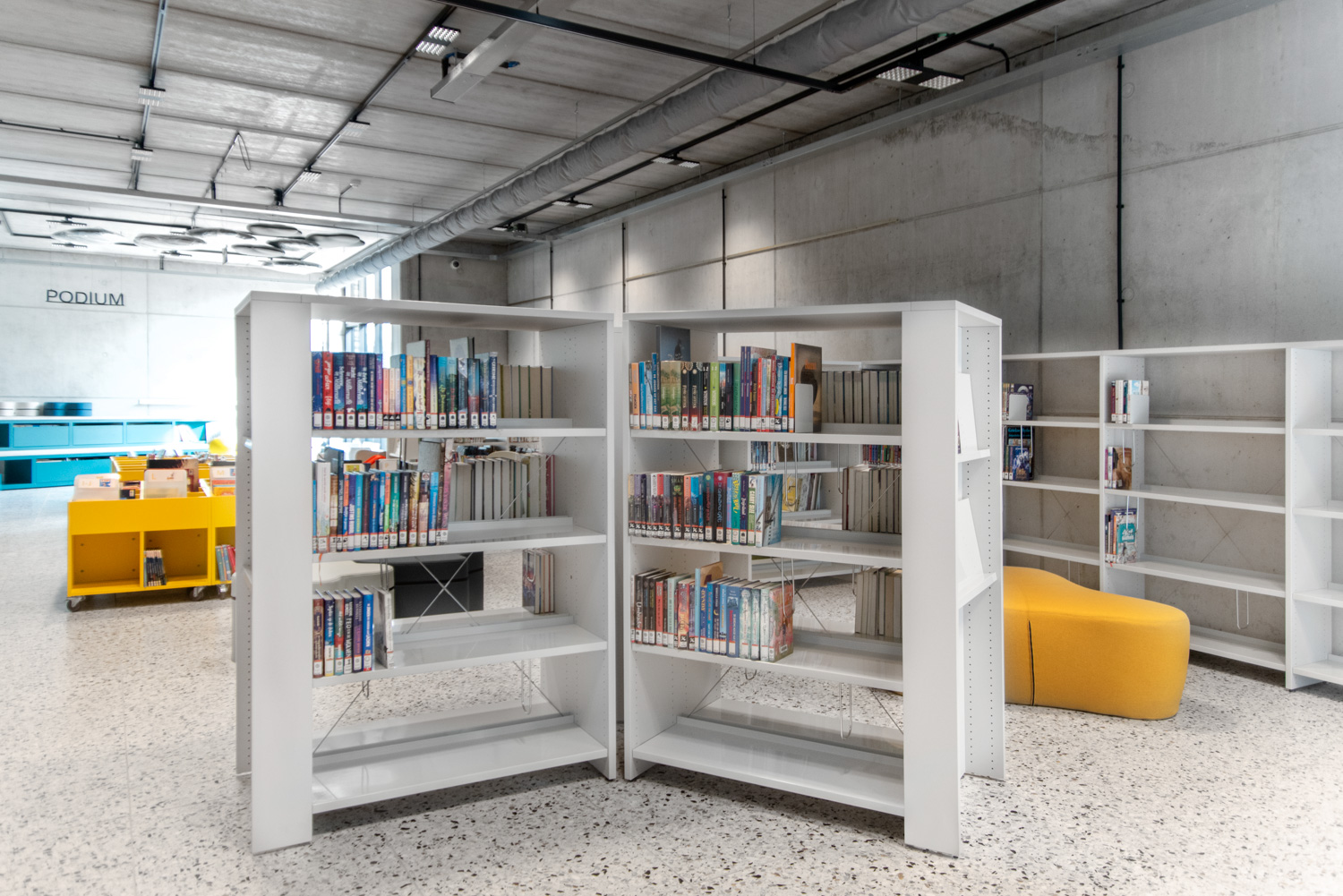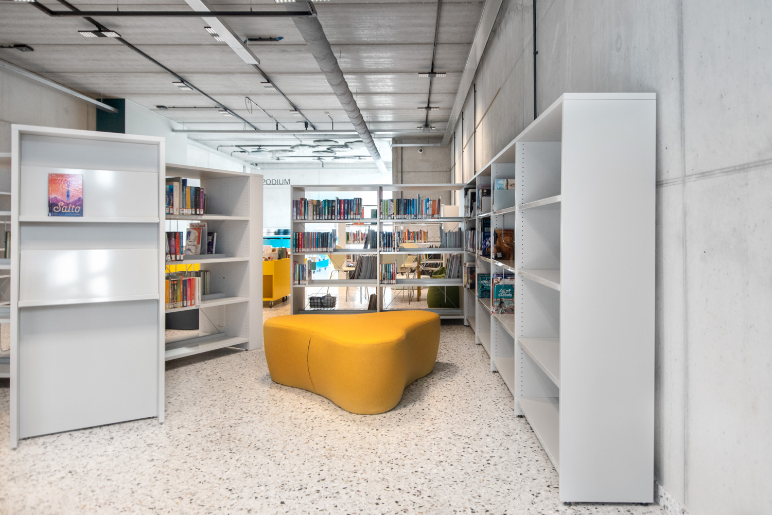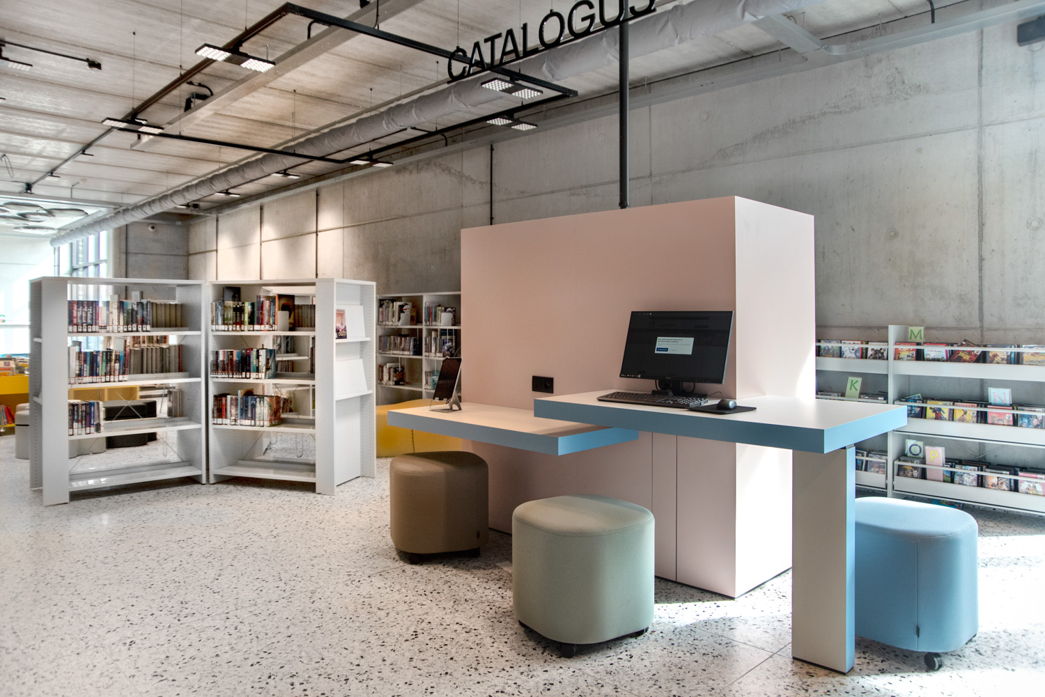 Überall in der Bibliothek sind die Regale weiß gehalten, um die Aufmerksamkeit auf den Inhalt - die Bücher - zu richten. Die zeitgenössische Farbpalette des Gebäudes spiegelt sich in den Möbeln wider.