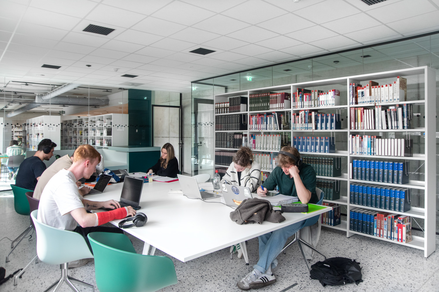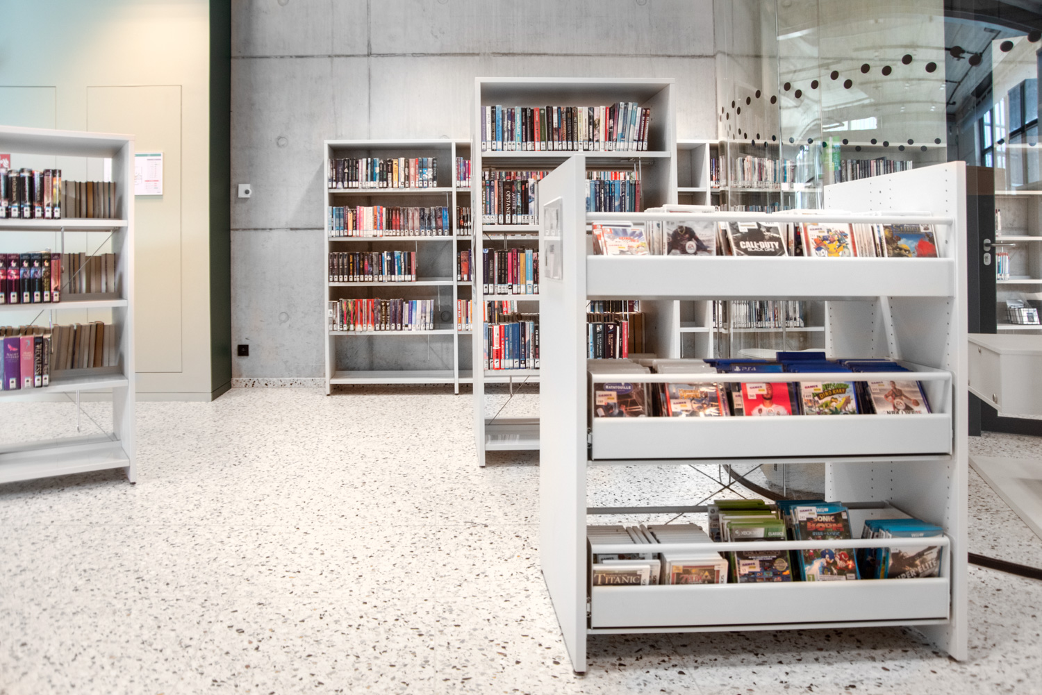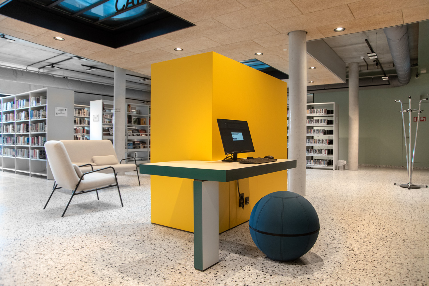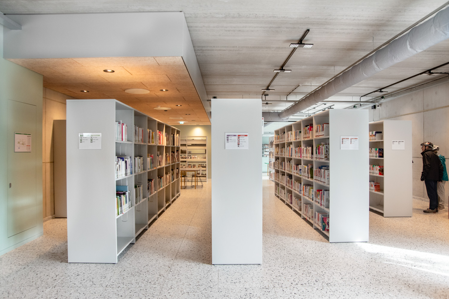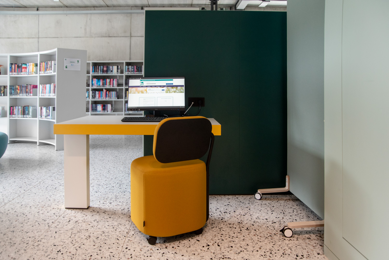 Überall in der Bibliothek sind die Regale weiß gehalten, um die Aufmerksamkeit auf den Inhalt - die Bücher - zu richten. Die zeitgenössische Farbpalette des Gebäudes spiegelt sich in den Möbeln wider.