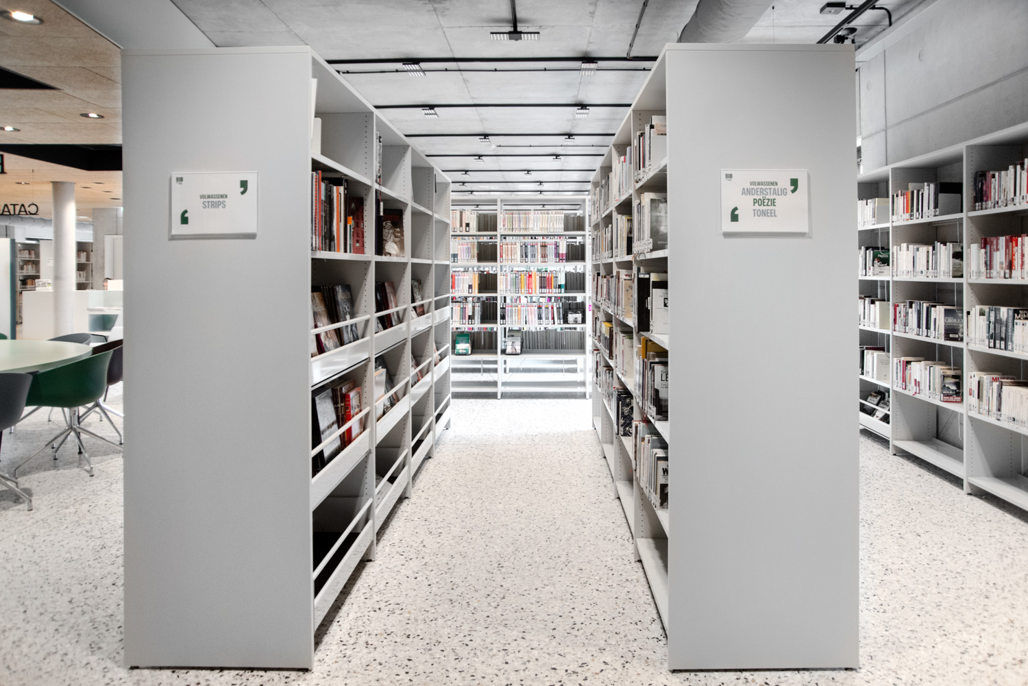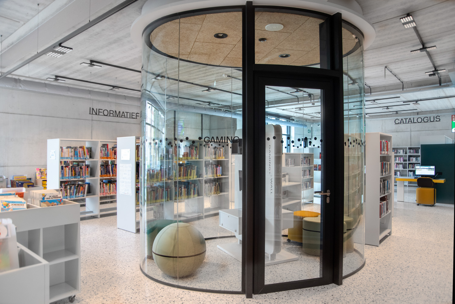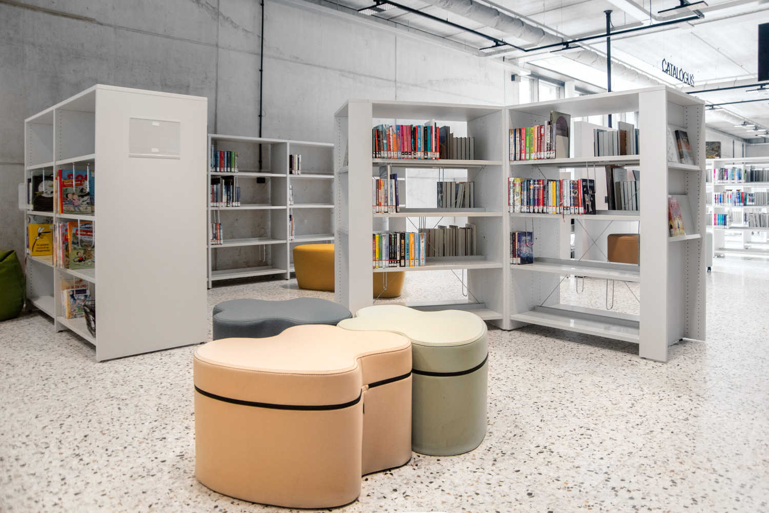 Licht und Raum sind die zentralen Elemente der neuen Bibliothek in Geraardsbergen. Die Bibliothek ist mehr als nur ein Ort zum Ausleihen von Büchern; sie ist ein Raum zum Lesen, Studieren, Spielen und vieles mehr. Die Besucher können aus einer Vielzahl von Sitzgelegenheiten wählen: Tische und Stühle zum Arbeiten oder Studieren, gemütliche und bequeme Lesesessel zum Entspannen und Poufs zum schnellen Nachschlagen in einem Buch.