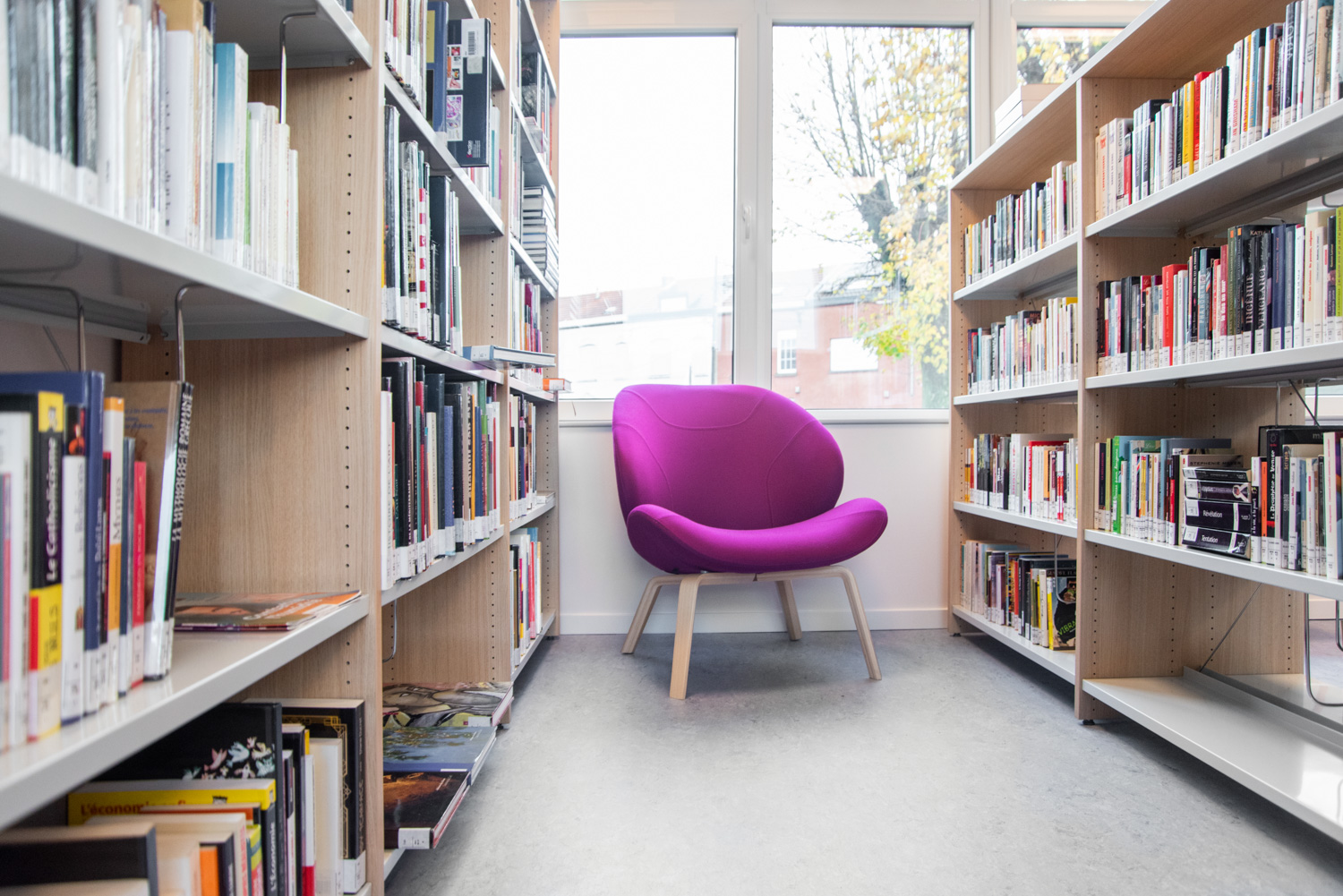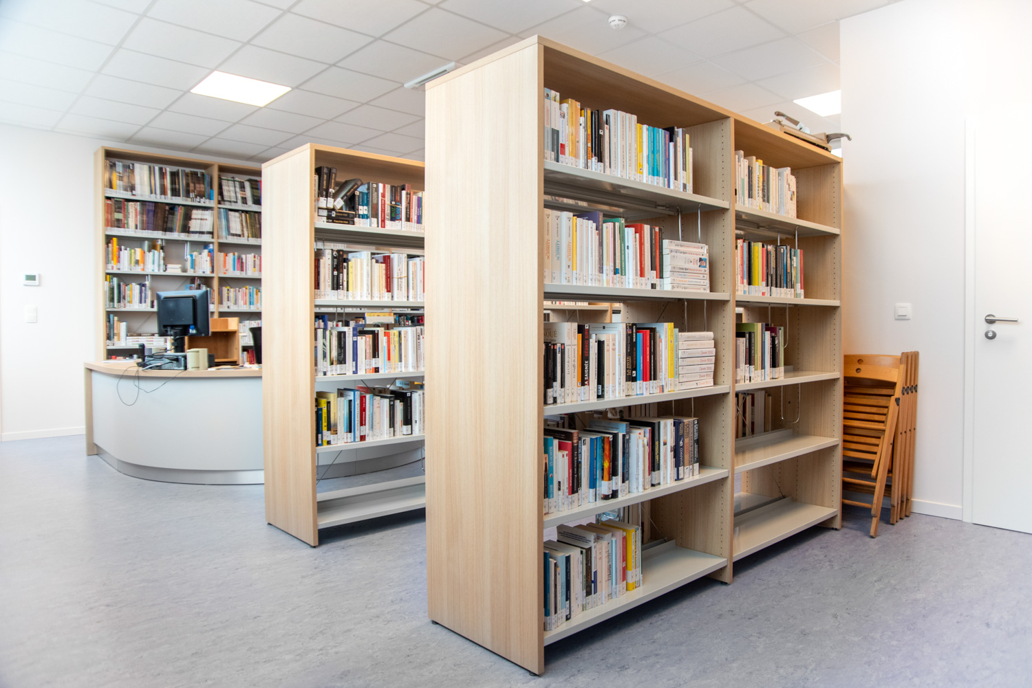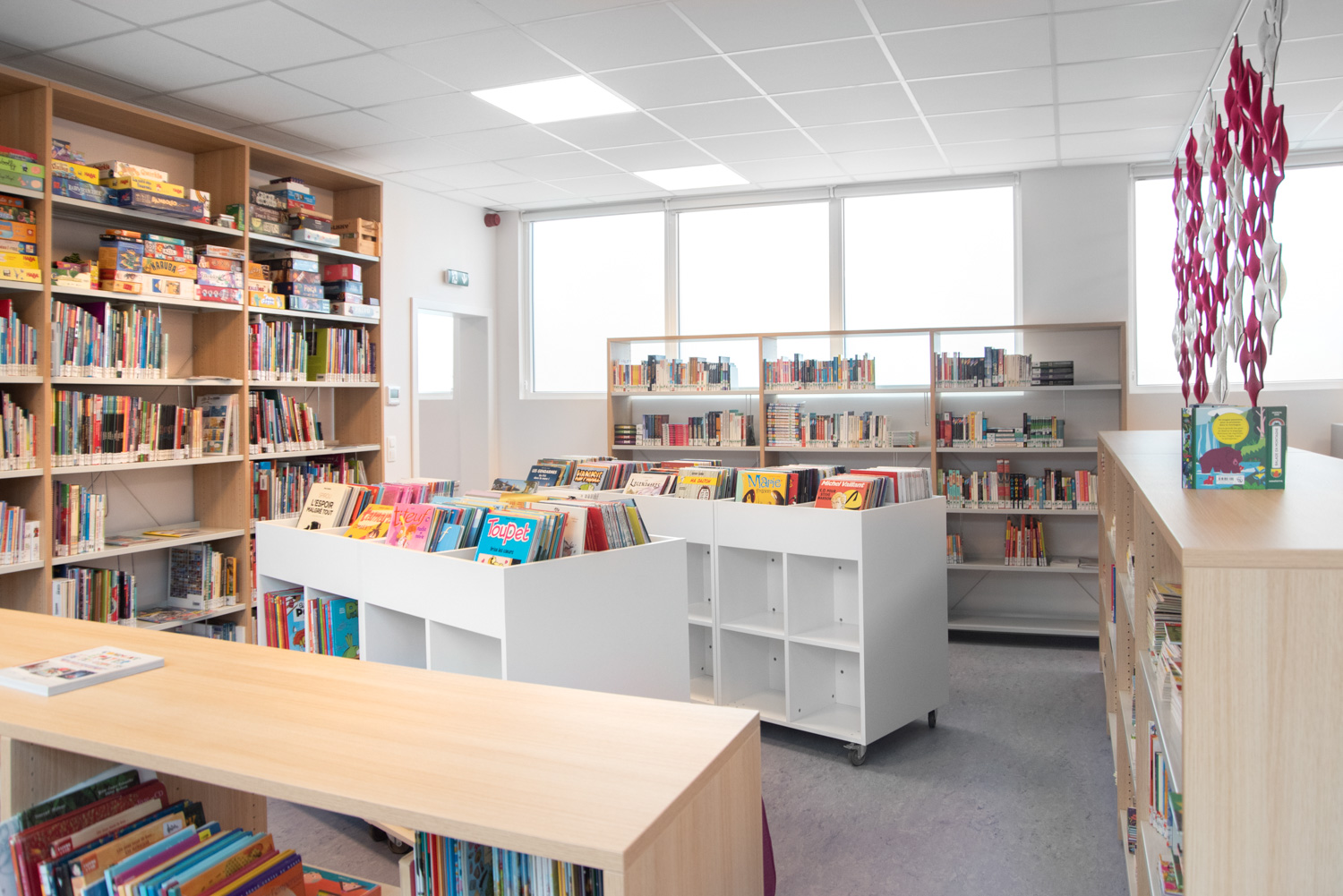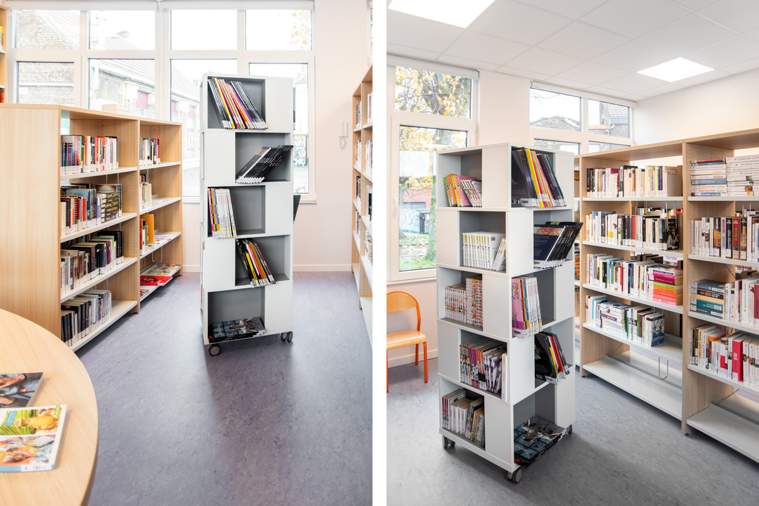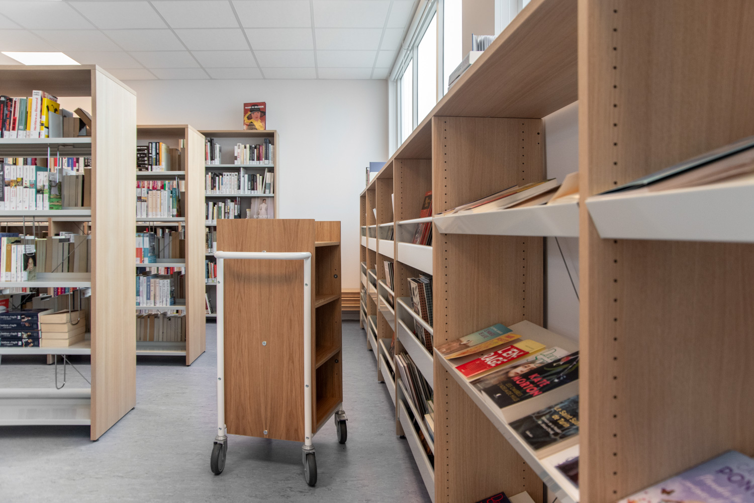Eine Gelegenheit zur Neugestaltung der Bibliothek, um sie angenehmer und funktioneller zu machen, ergab sich, als Asbest aus dem Gebäude entfernt werden musste. Es gibt nun weniger Regale als zuvor, was eine bessere Zirkulation im Raum ermöglicht. Die Bibliothek ist in zwei verschiedene Bereiche unterteilt, die durch eine Eingangszone getrennt sind: eine Seite für Jugendliche und eine Seite für Erwachsene. Die Räume sind durch die gleiche Verwendung von Farben und Materialien optisch miteinander verbunden.