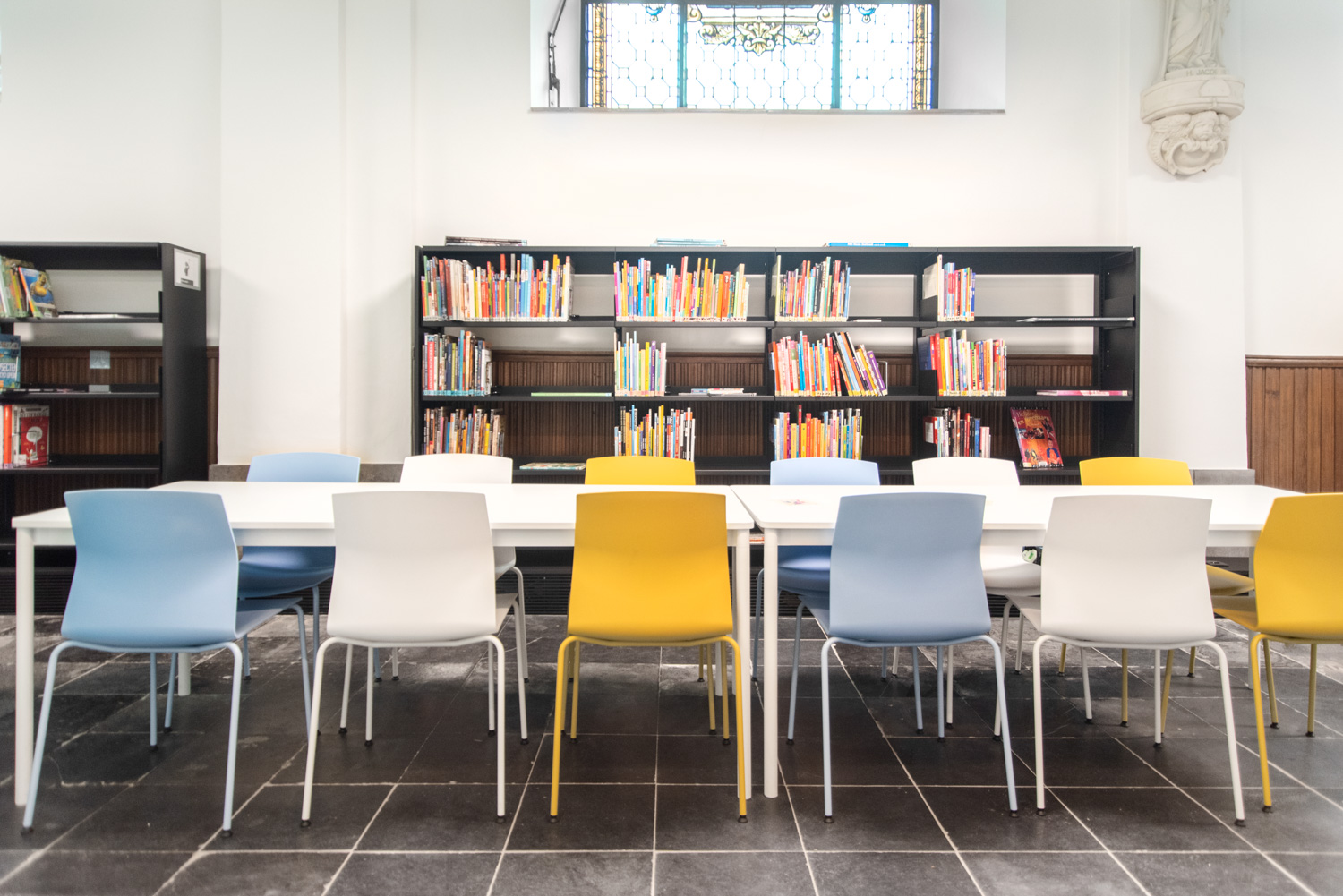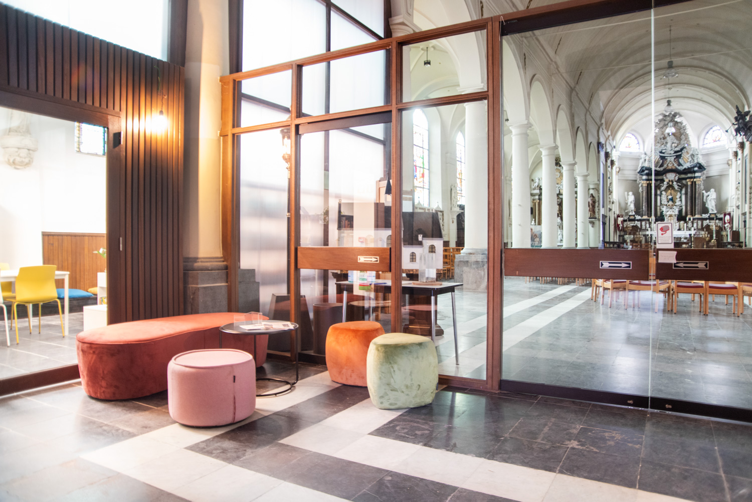 Die Räume sind geschmackvoll und respektvoll im Einklang mit dem Gebäude gestaltet: Die Bögen wurden bewahrt und das charakteristische, fließende Licht der großen Glasfenster, das für Kirchen typisch ist, wird durch Glaswände erhalten, die die Bibliothek von den kirchlichen Aktivitäten trennen.