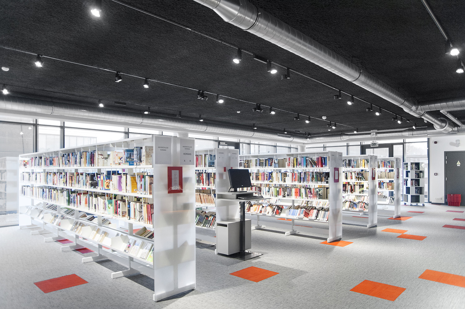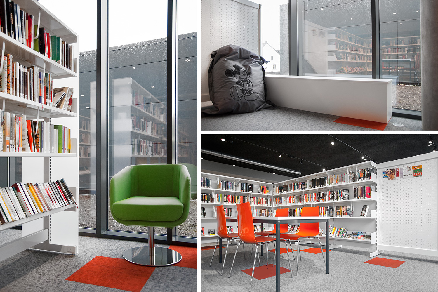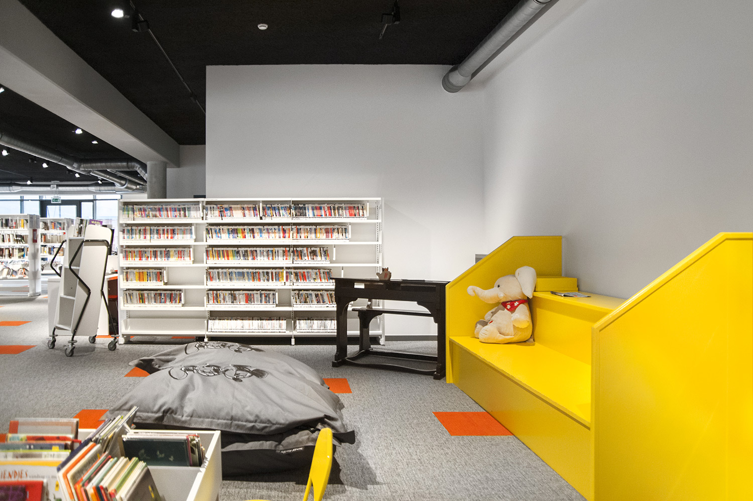 Besondere Erwähnung fanden das ergonomische Regalsystem, die Kinderecke und die Sitzmöbel, die Lesezonen und Arbeitsplätze. Die schwarze Decke bildet einen Kontrast zum weißen Mobiliar, das dem Raum dank begrenzter Höhe und geradlinigem Design eine angemessene Gestalt gibt.