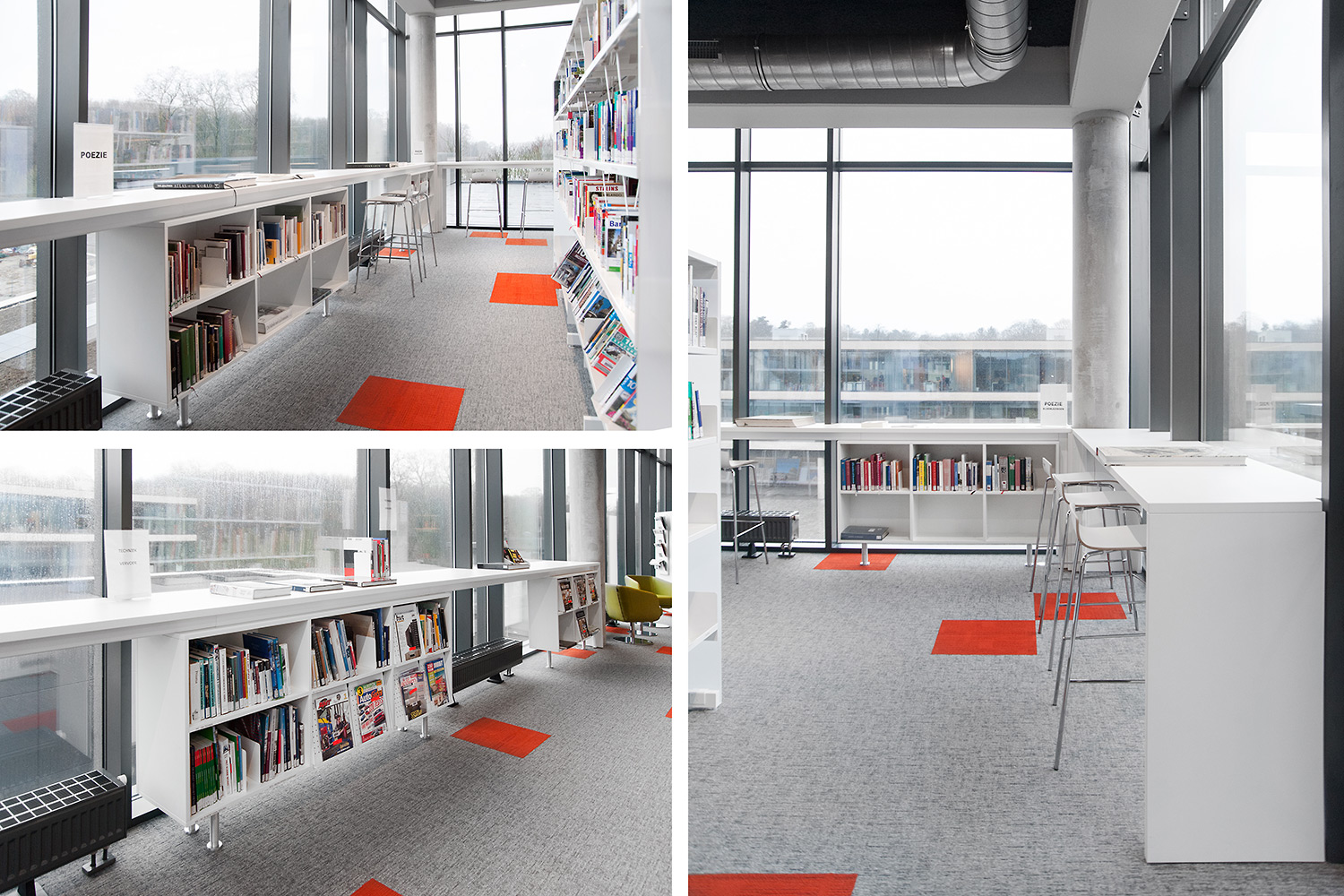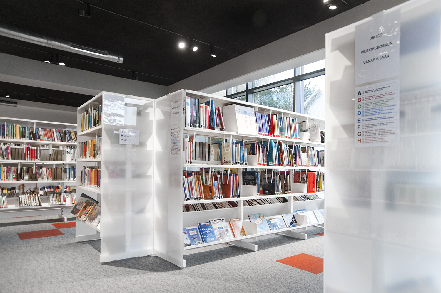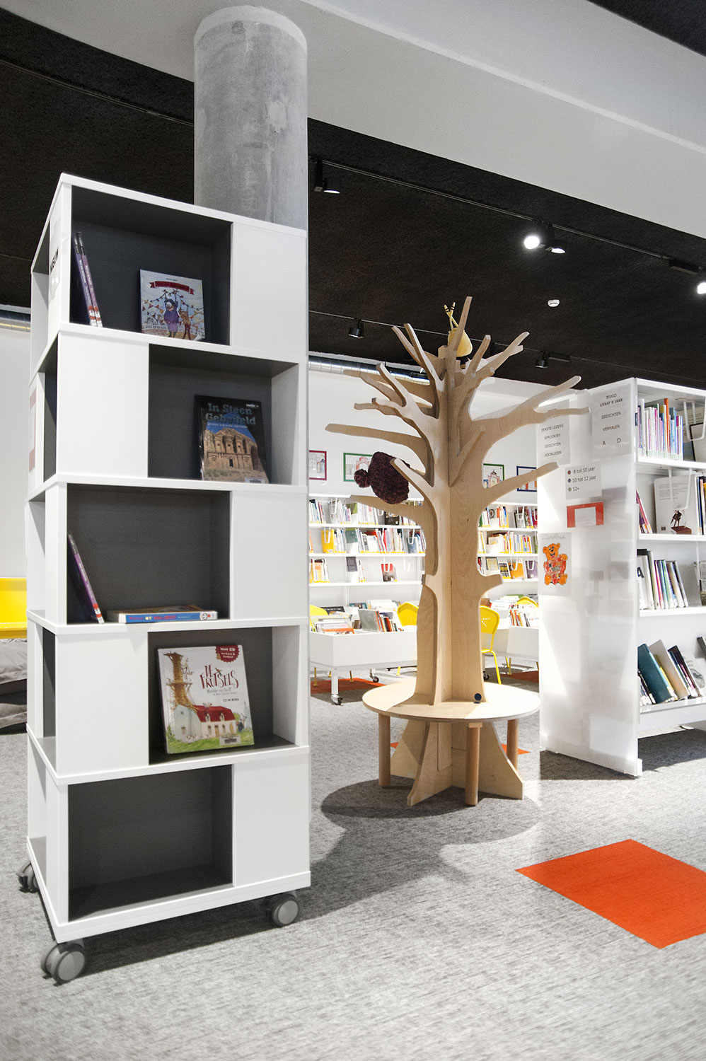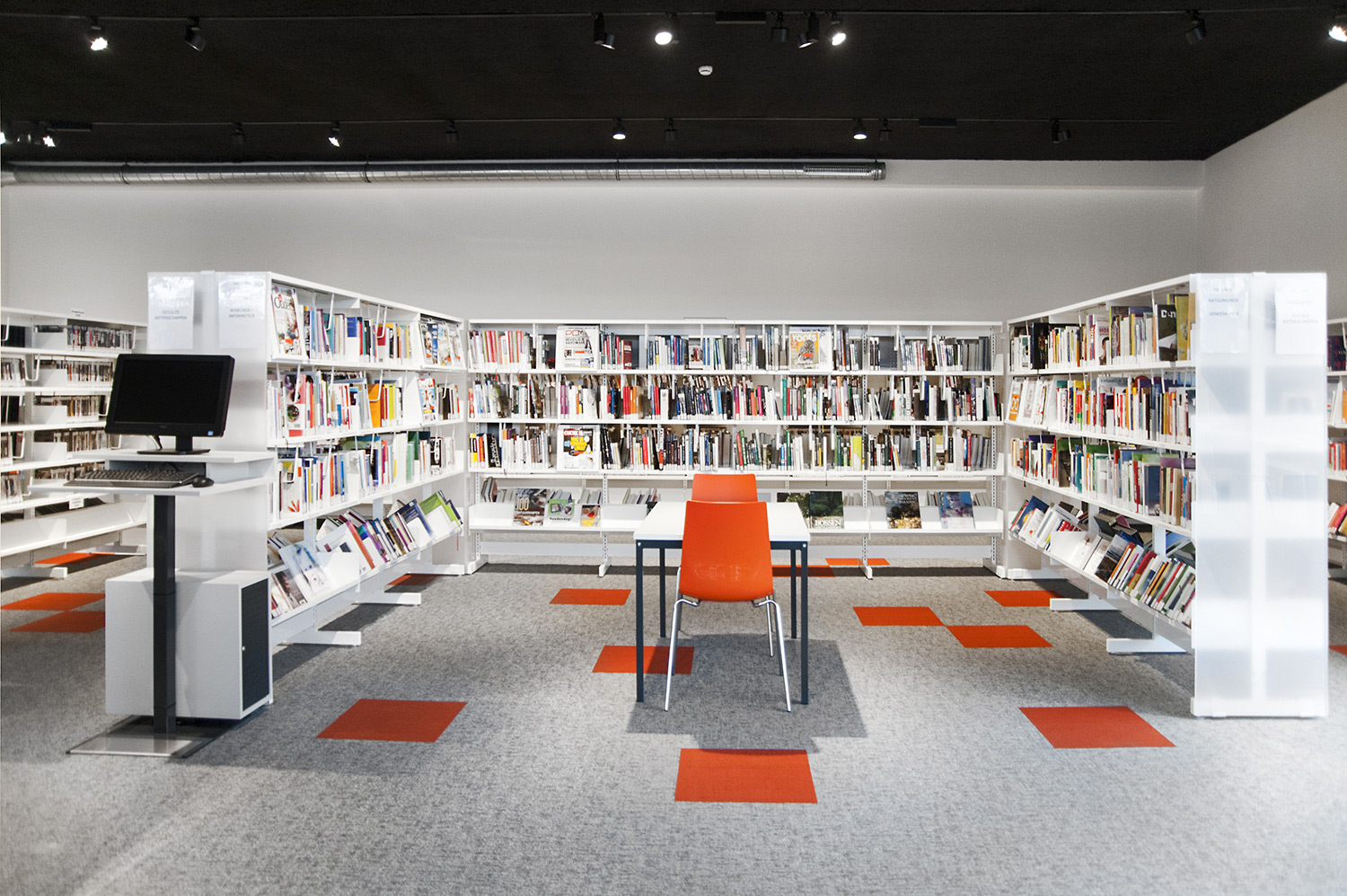 Besondere Erwähnung fanden das ergonomische Regalsystem, die Kinderecke und die Sitzmöbel, die Lesezonen und Arbeitsplätze. Die schwarze Decke bildet einen Kontrast zum weißen Mobiliar, das dem Raum dank begrenzter Höhe und geradlinigem Design eine angemessene Gestalt gibt.