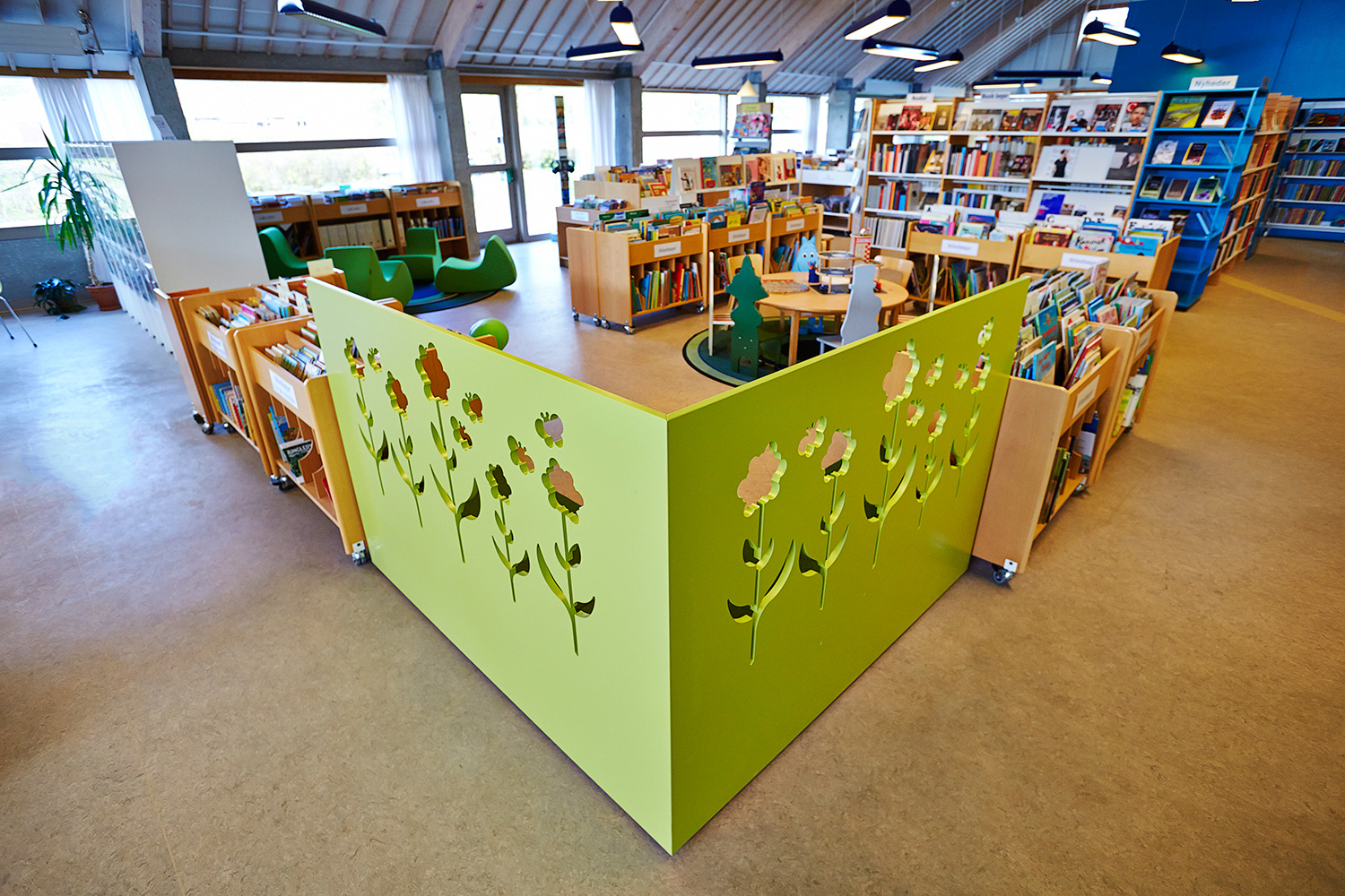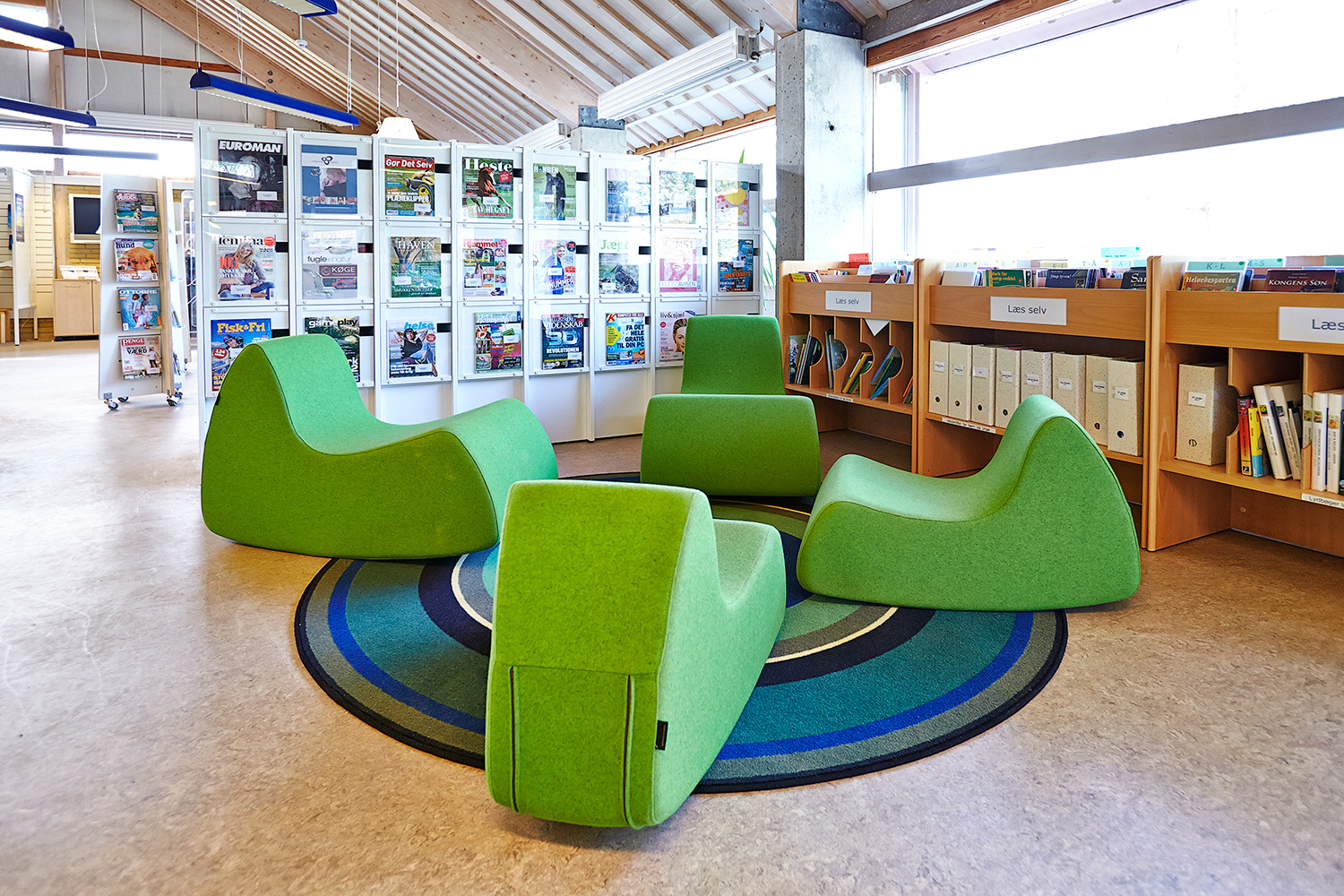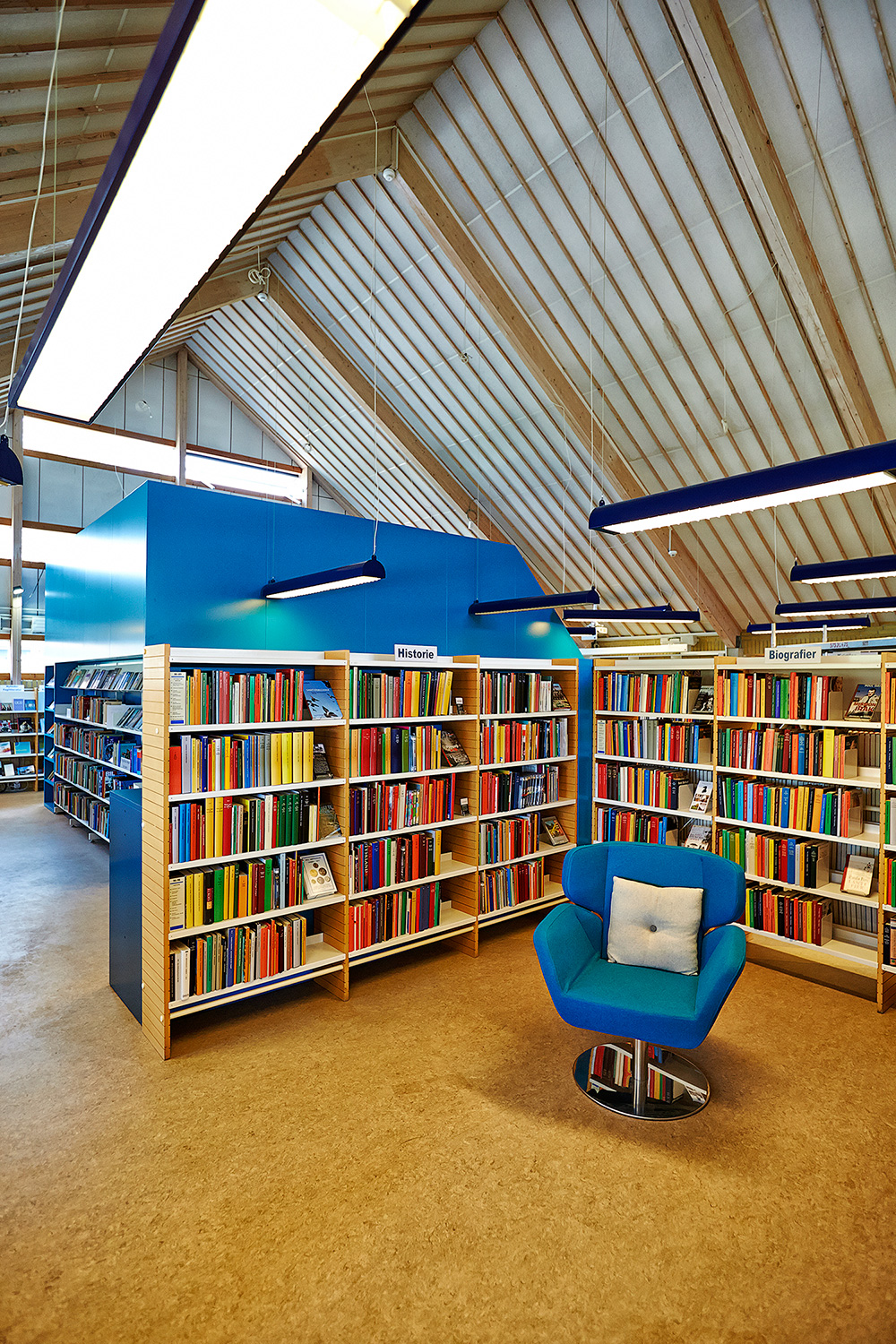 Die Bibliothek wurde bei ihrer Umwandlung von einer Kreis- zur Ortsbibliothek neu eingerichtet mit dem Fokus auf Diversität und kreative Möglichkeiten für die Bücherunterbringung und -präsentation. Unsere Innenarchitektin Lykke Jørgin übernahm eine Idee des Architekturbüros Signal.