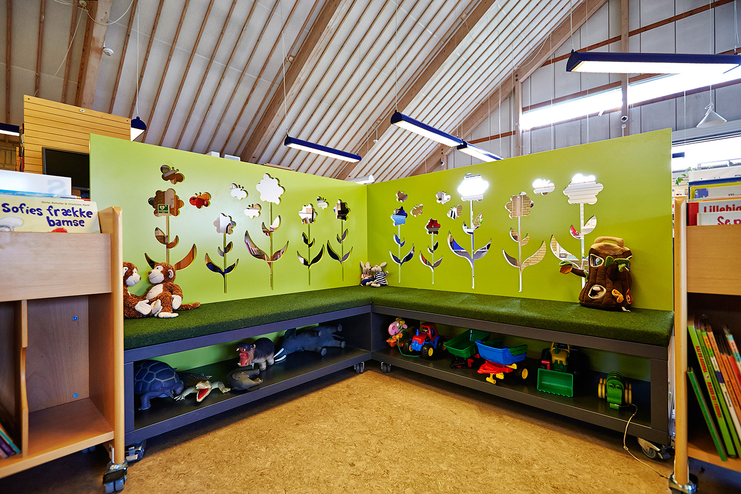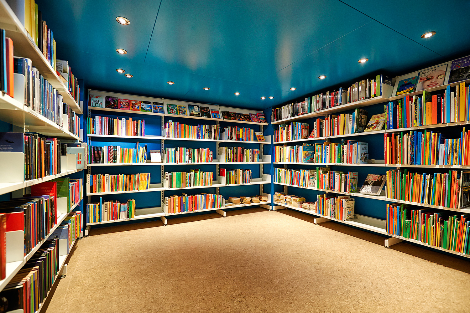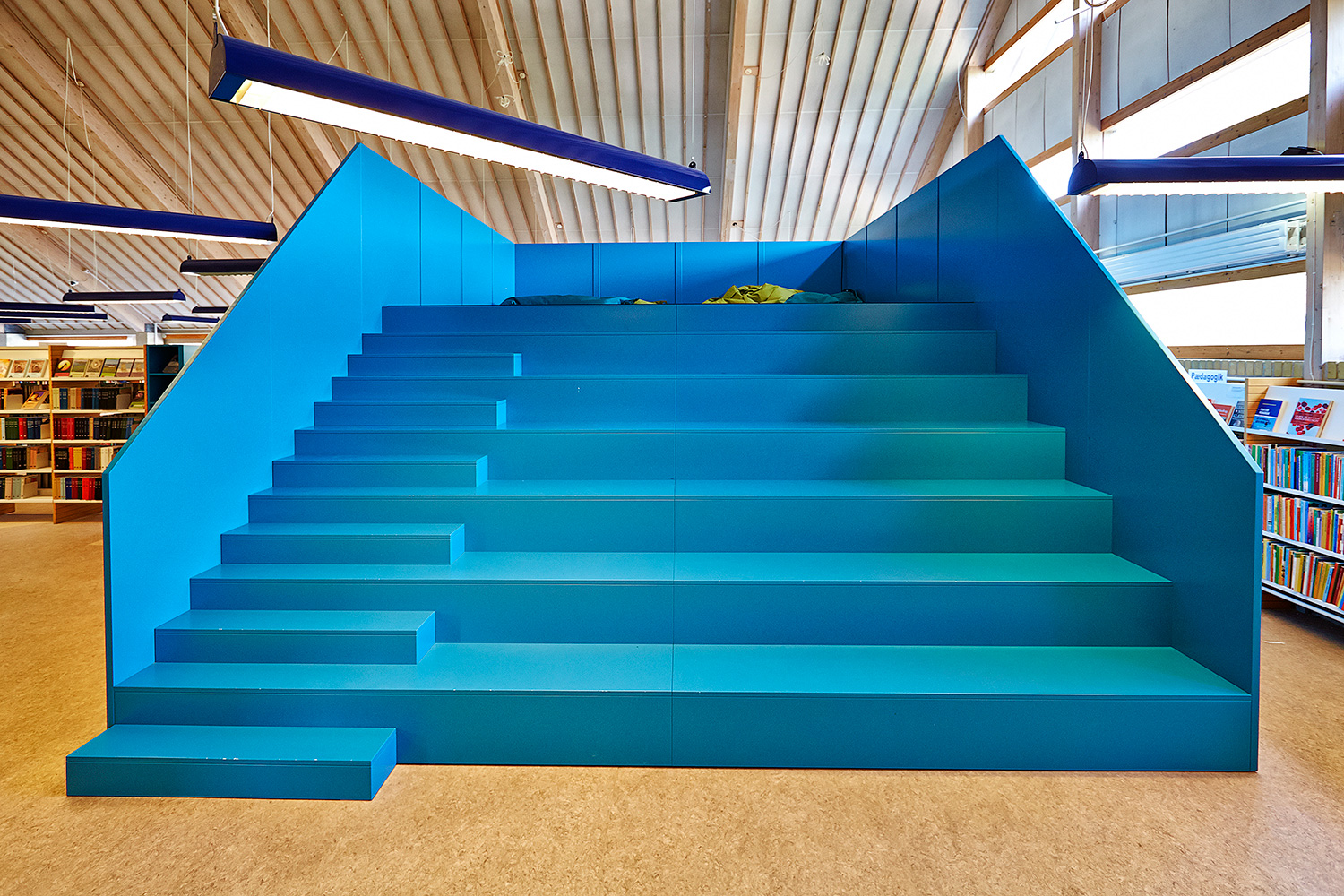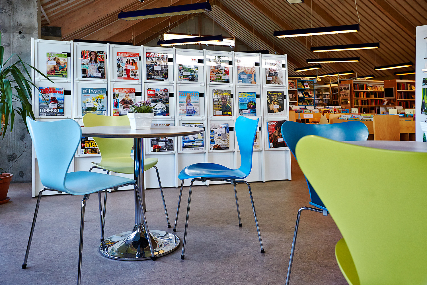 Die Bibliothek wurde bei ihrer Umwandlung von einer Kreis- zur Ortsbibliothek neu eingerichtet mit dem Fokus auf Diversität und kreative Möglichkeiten für die Bücherunterbringung und -präsentation. Unsere Innenarchitektin Lykke Jørgin übernahm eine Idee des Architekturbüros Signal.