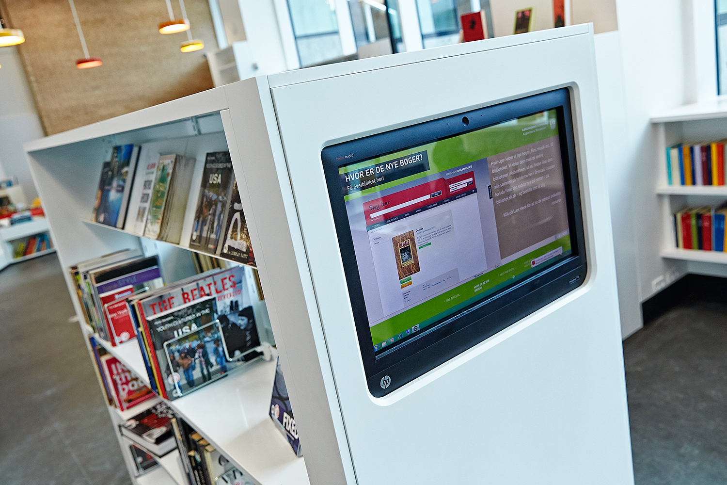 Zum Anderen wurde für ein erhöhtes Nutzungserlebnis in Einrichtung und Regale Informationstechnologie integriert. Dazu wurden in die Displaywand am Eingang und an jedem Regalende Bildschirme eingebaut sowie iPads zur Verfügung gestellt, die den Benutzern helfen sollen mehr zu lernen und zu entdecken.