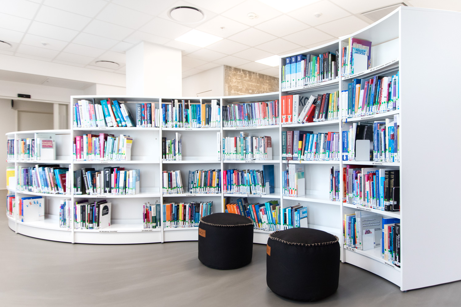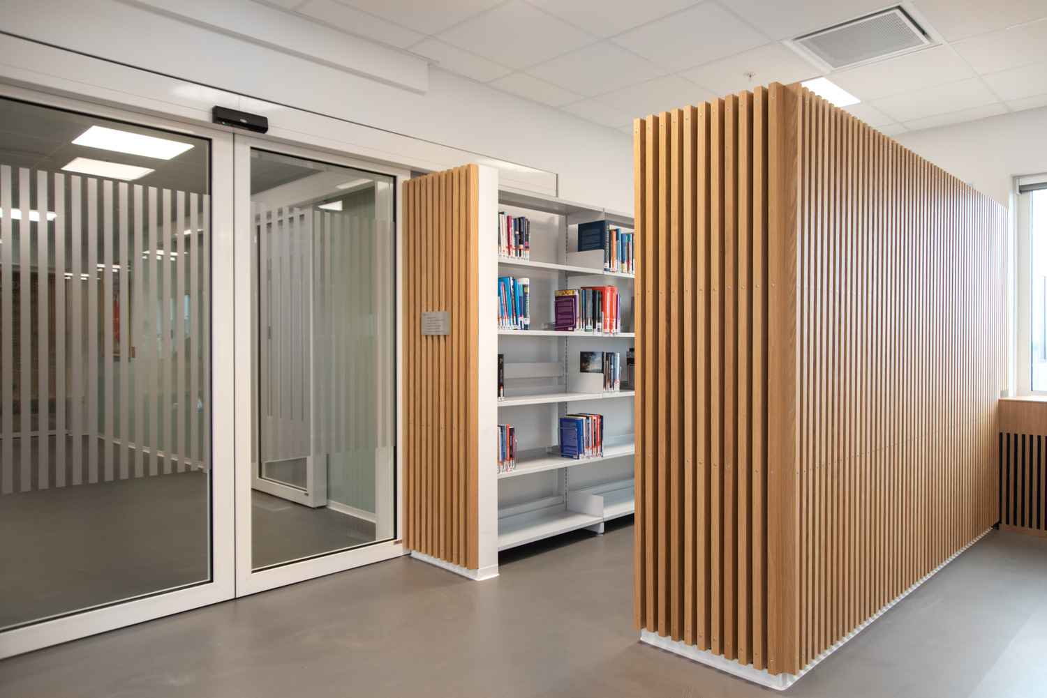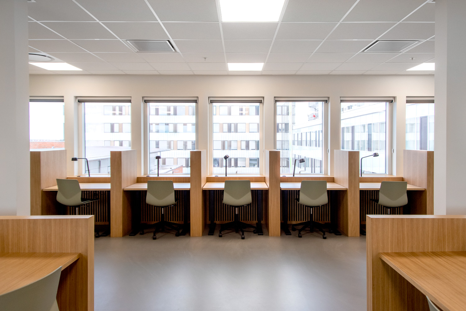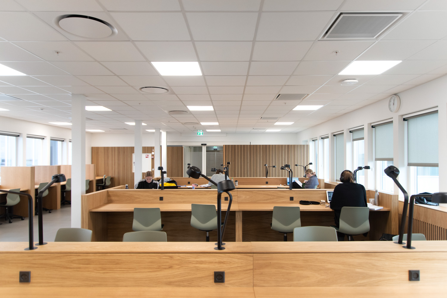 Das Holz bildet einen warmen Kontrast zum Glas- und Betongebäude. Im Laufe der Jahre bekommt das Holz etwas Patina, was zu einem "echten" und einzigartigen Ausdruck führt. Wir haben die runden Regalsysteme sowie die großen Lerntische aus Eiche geliefert, an denen die Studenten entweder zusammen oder einzeln sitzen können. Die gesamte Verkabelung wurde schön versteckt und in den Tischen versteckt.
