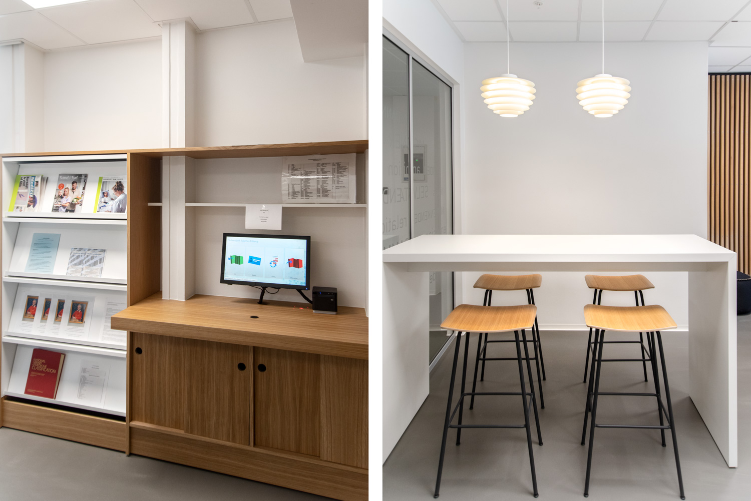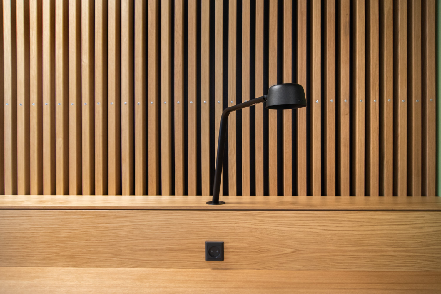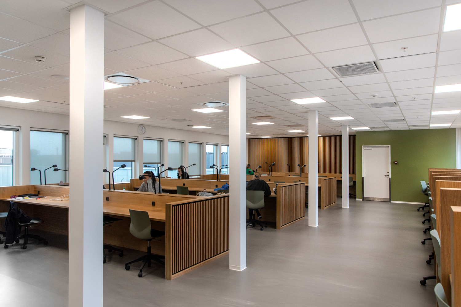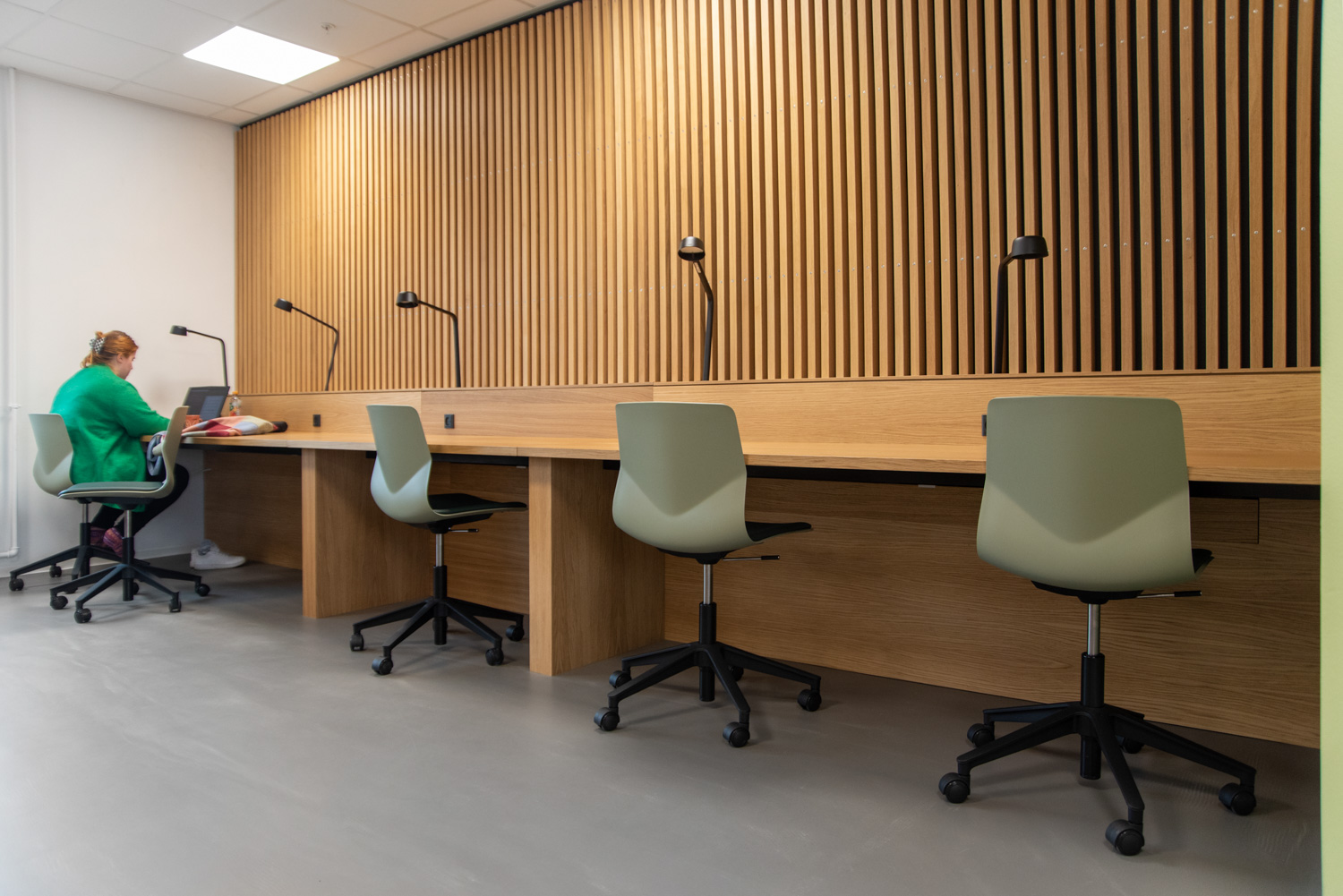 Die Trennwände zwischen den Tischen lassen Raum für Ruhe und Absorption. Die Schüler können in einer schönen und komfortablen Umgebung arbeiten, in der die warmen Materialien und das natürliche Licht eine schöne Wirkung haben.