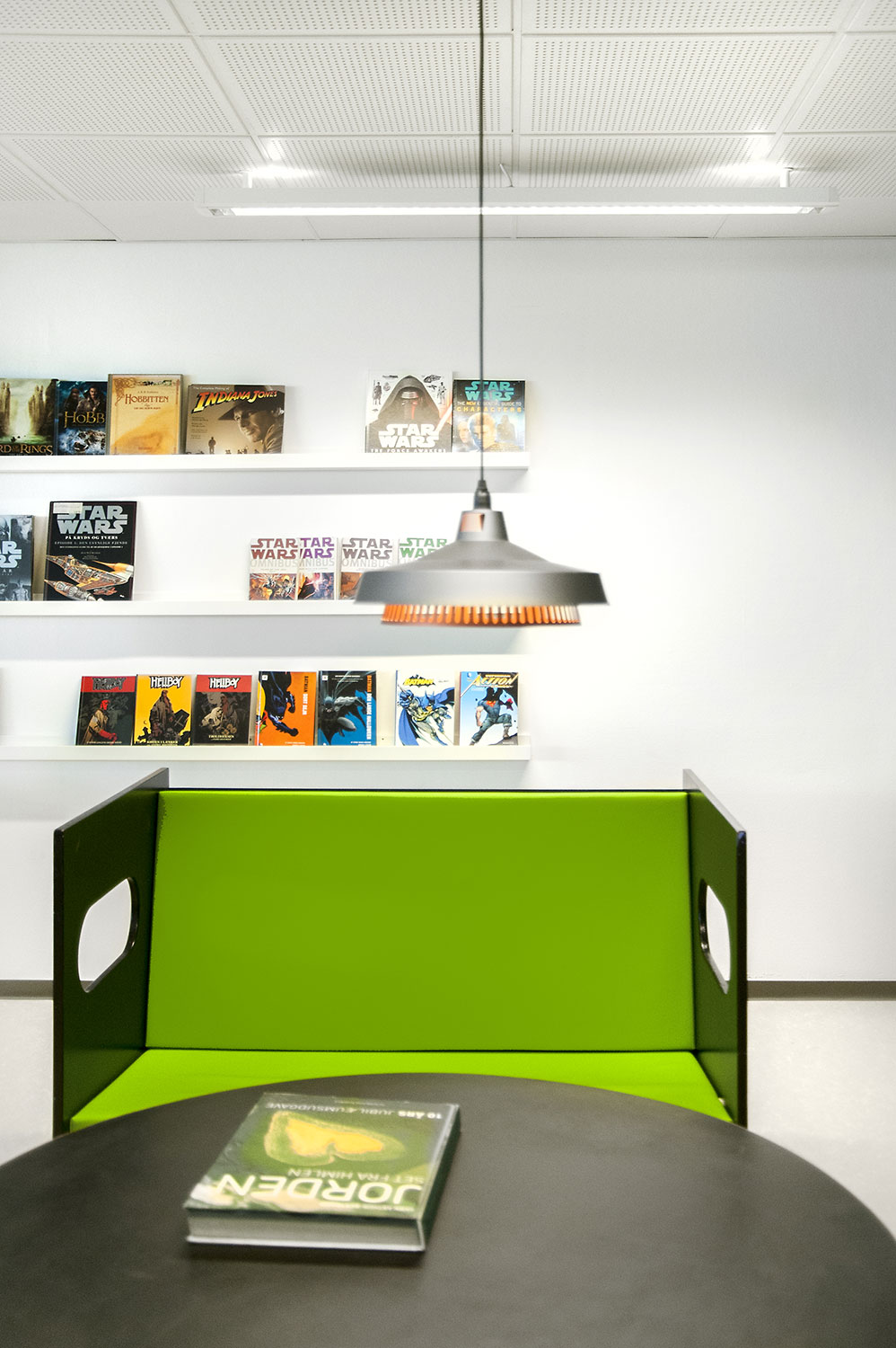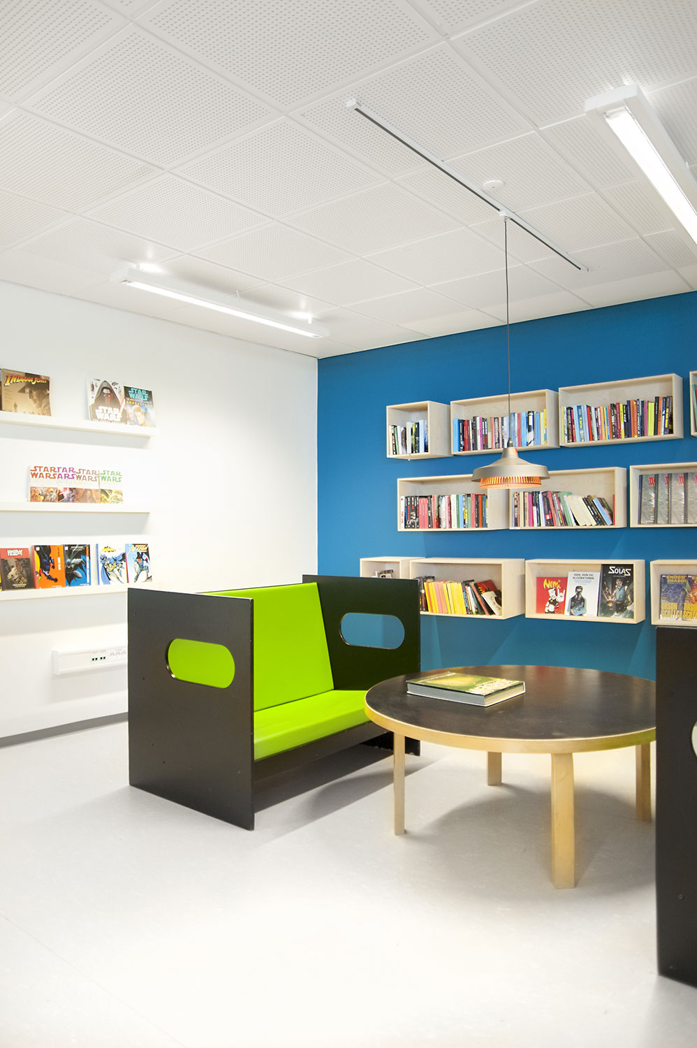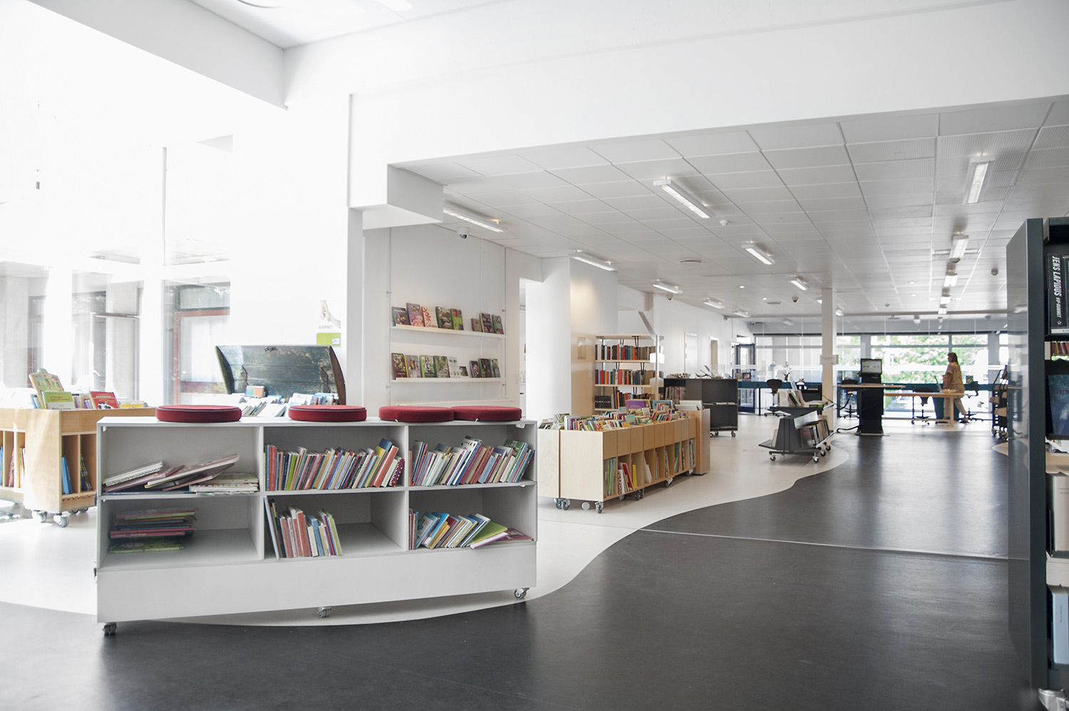 Die Einrichtung ist eine Kombination aus bereits vorhandenem und neuem Mobiliar. Einige Retro-Möbel, restauriert und neu gepolstert, verleihen der Bibliothek Charakter.
