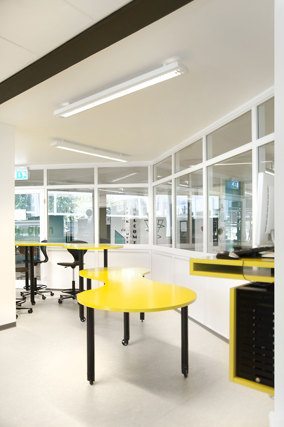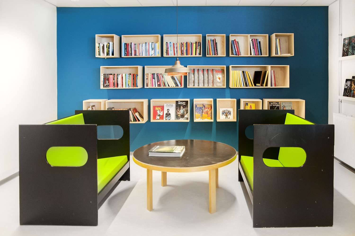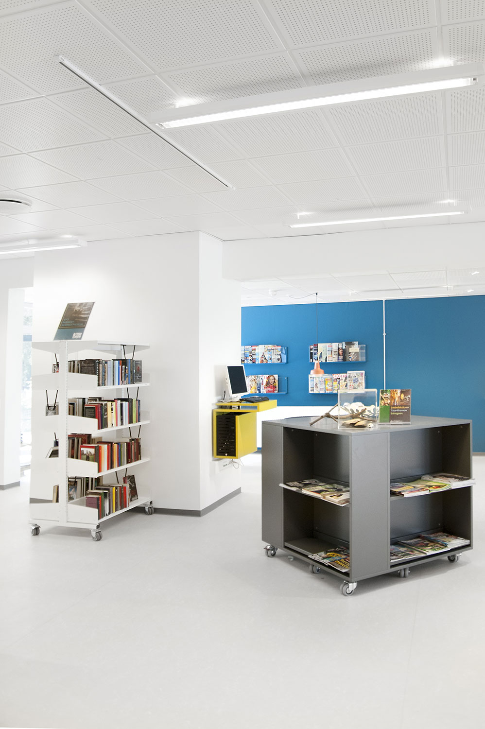 Die Einrichtung ist eine Kombination aus bereits vorhandenem und neuem Mobiliar. Einige Retro-Möbel, restauriert und neu gepolstert, verleihen der Bibliothek Charakter.