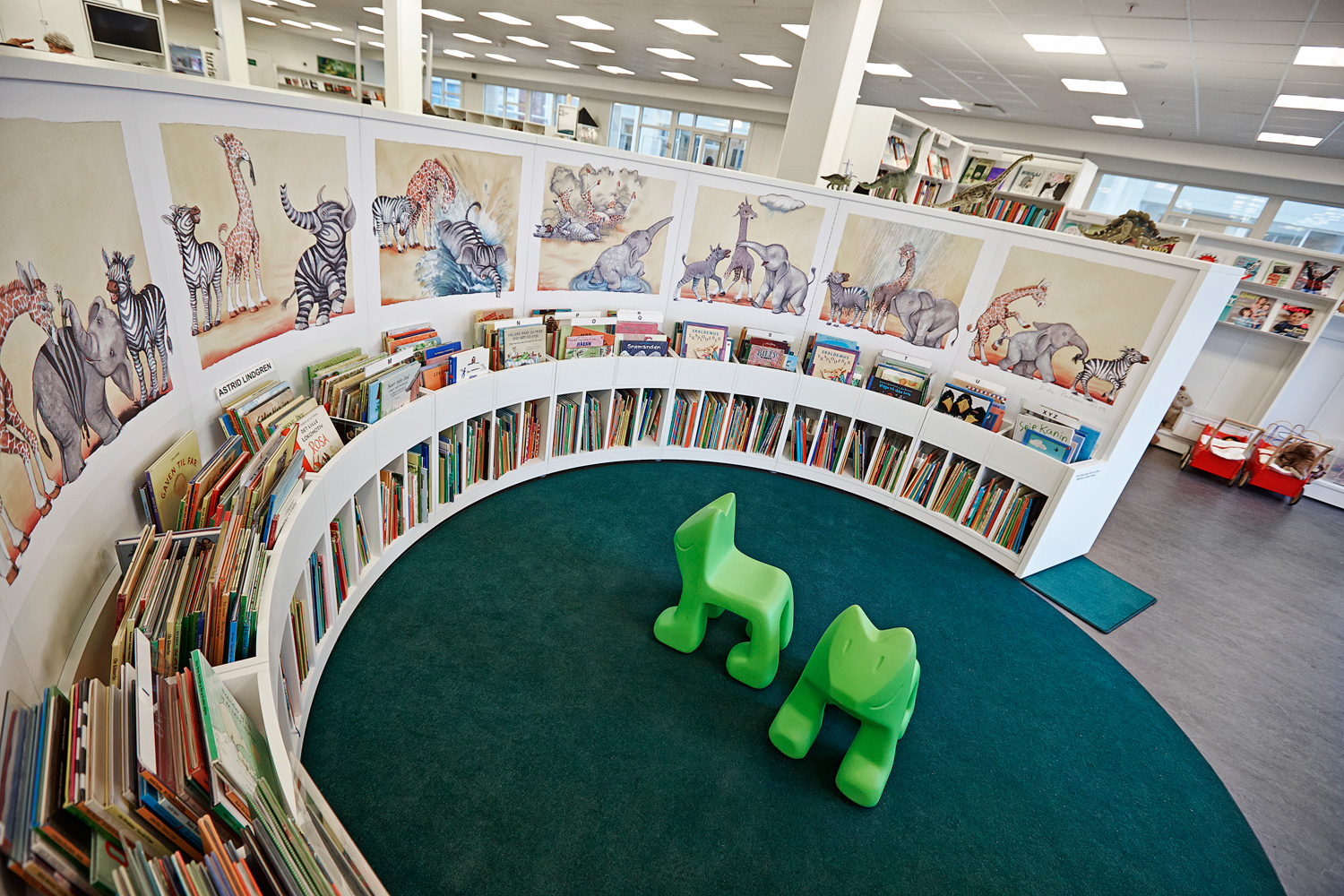 Durch kreative und kluge Platzeinteilung konnte eine geräumige und einladende Bibliothek mit besonderen Bereichen für Ruhe und Lesen sowie Gespräche und Diskussionen geschaffen werden. Und dazu gibt es noch die Kinderecke mit ihren runden Regalen und Illustrationen lokaler Künstler.