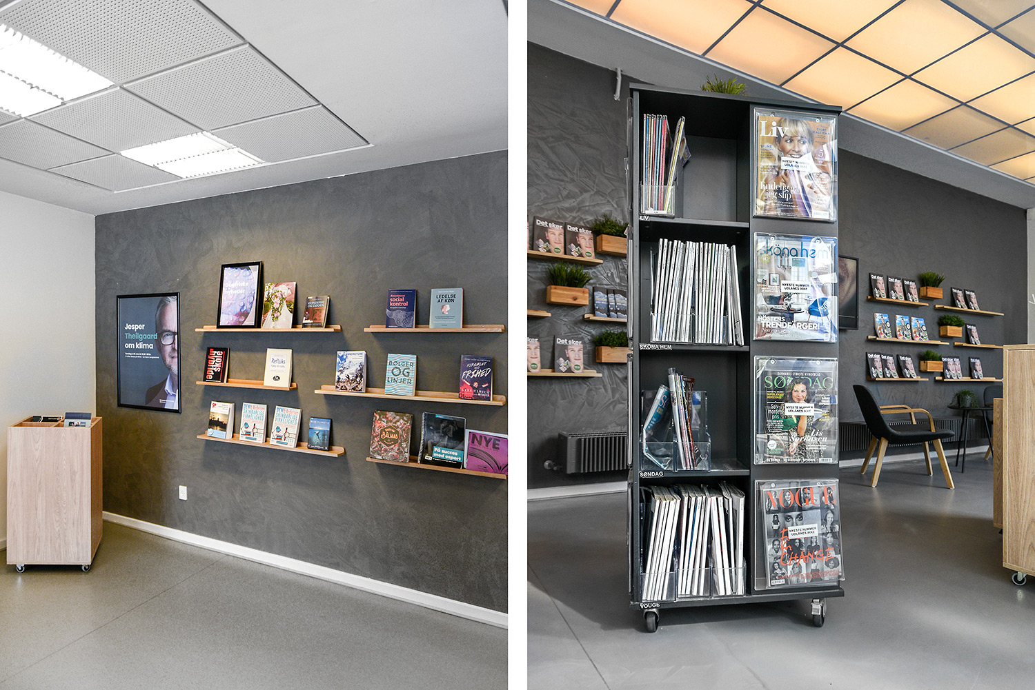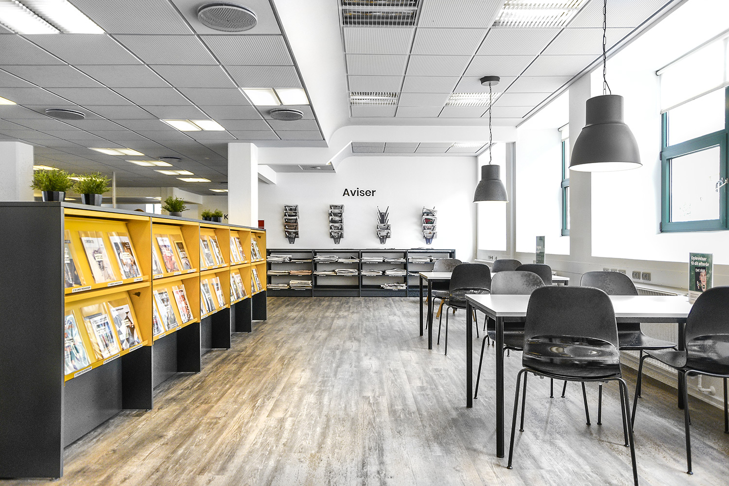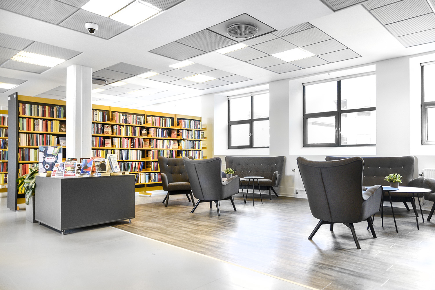 Im der neu gestalteten Horsens Library wurden die älteren, gelben Regale wiederverwendet. Durch die Einhausung der Regale mit anthrazitgrauen Holzpanelen ergibt sich ein moderneres Aussehen. Gleichzeitig wurden Ausstellungspodien in Grau und Eiche hinzugefügt, Bereiche mit Holzböden angelegt und Wände mit Waldbildern foliert. In der Kinderstation wurden die Wände mit Hütten und Bäume ergänzt.