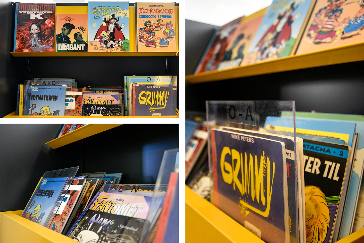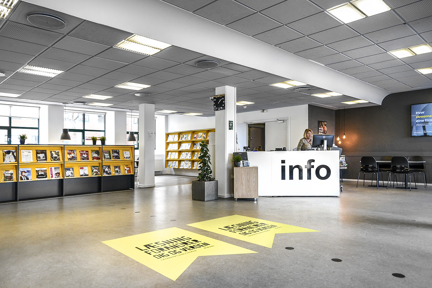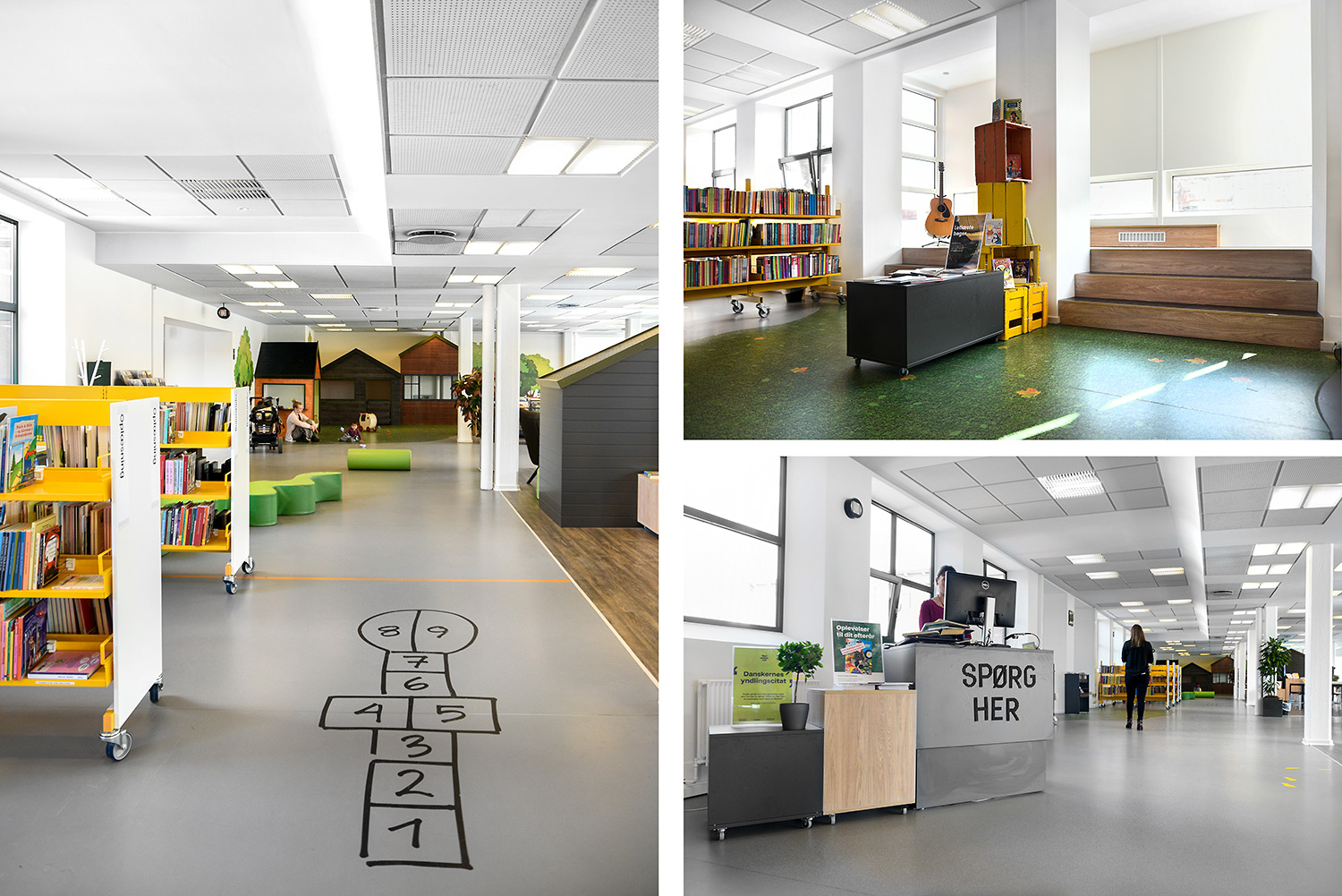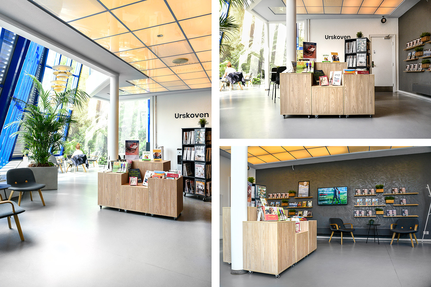Im der neu gestalteten Horsens Library wurden die älteren, gelben Regale wiederverwendet. Durch die Einhausung der Regale mit anthrazitgrauen Holzpanelen ergibt sich ein moderneres Aussehen. Gleichzeitig wurden Ausstellungspodien in Grau und Eiche hinzugefügt, Bereiche mit Holzböden angelegt und Wände mit Waldbildern foliert. In der Kinderstation wurden die Wände mit Hütten und Bäume ergänzt.