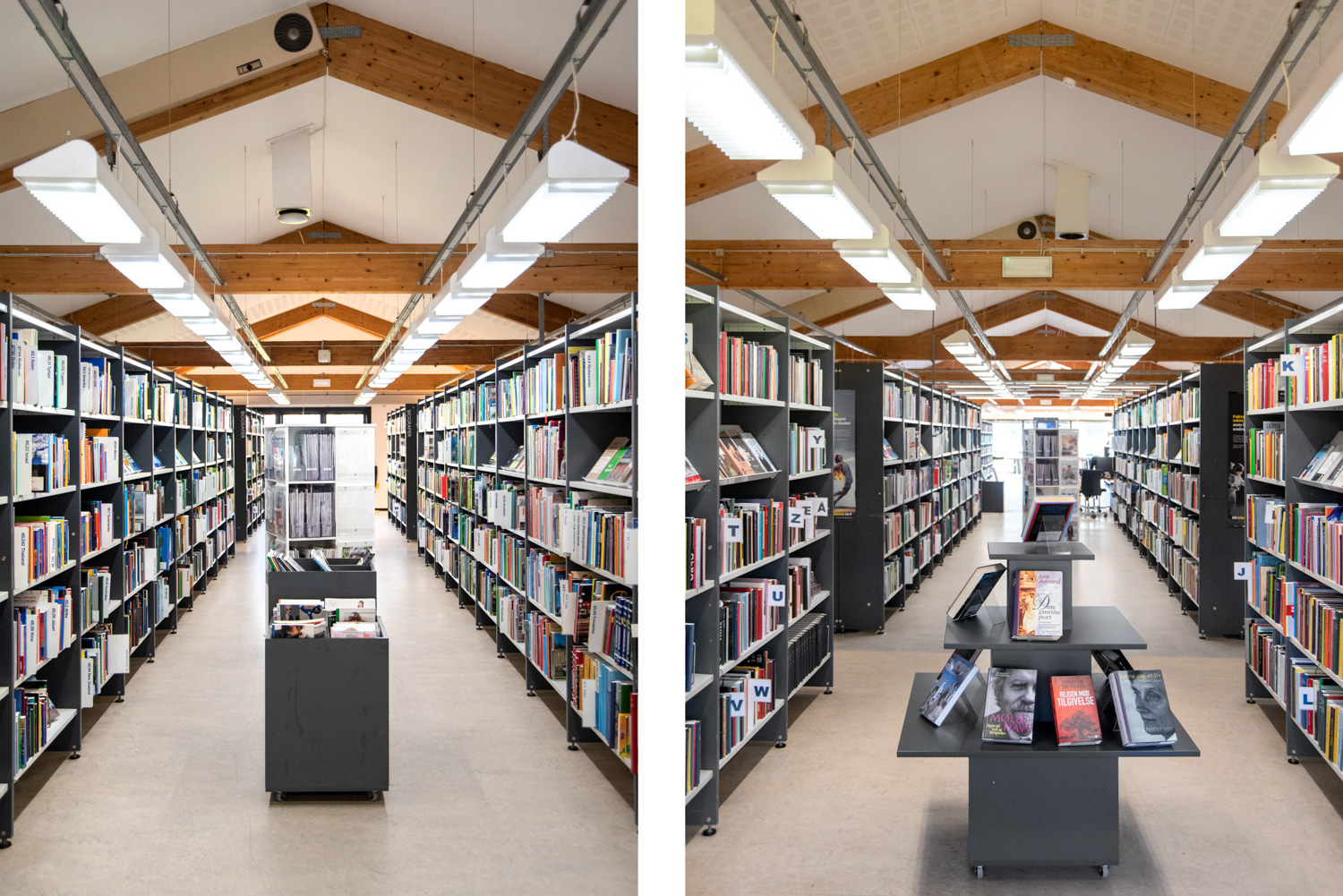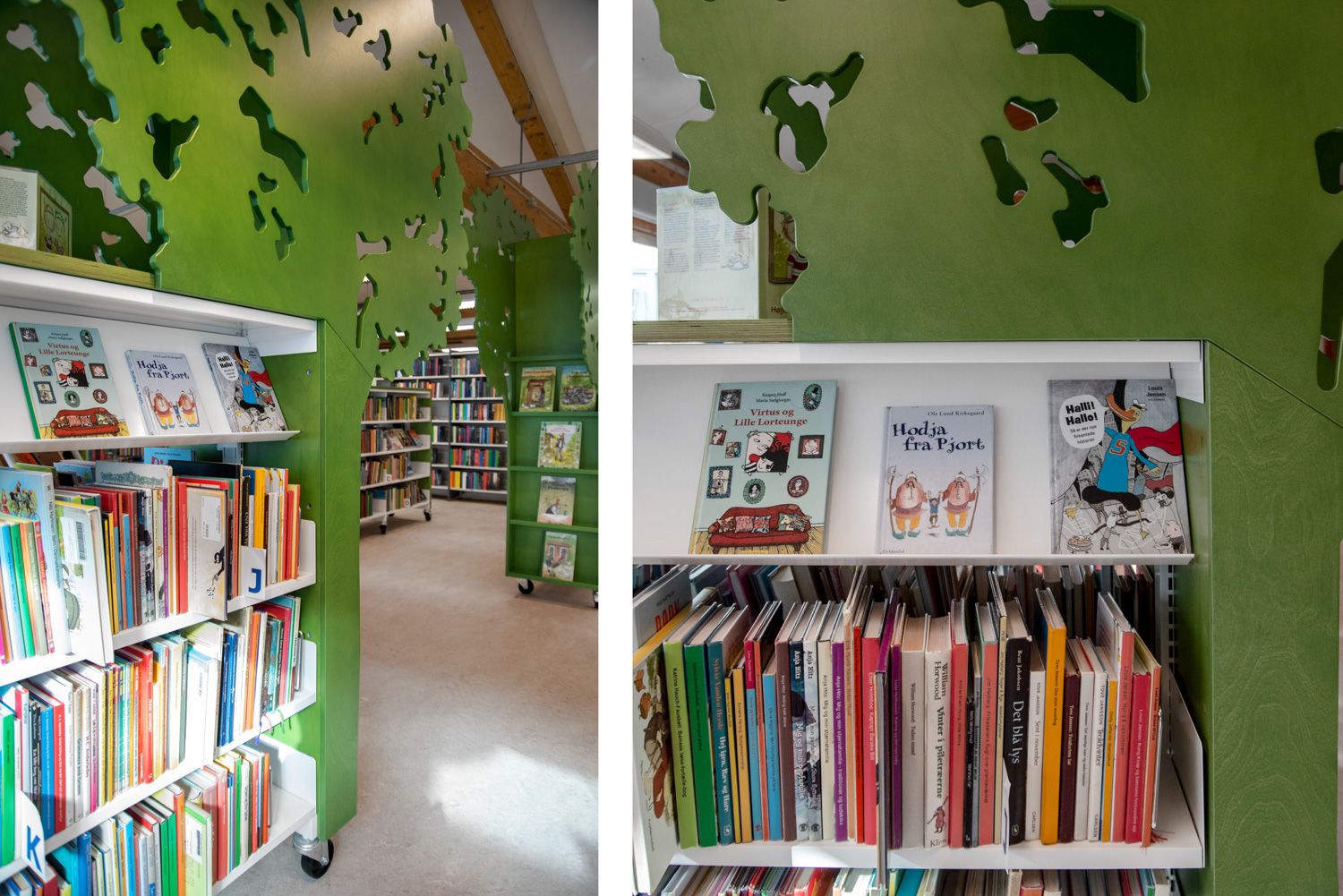 Vor der Renovierung wurde die Kinderabteilung von hohen Regalsystemen dominiert, die Bücher für Kinder jeden Alters enthielten, die alle miteinander vermischt waren. Nach der Renovierung haben die unteren Regalsysteme die höheren ersetzt, wodurch ein Raum im Raum geschaffen wurde, Bücher für verschiedene Zielgruppen wurden getrennt und maßgefertigte Bibliotheksmöbel konzentrieren sich auf Spiel, Natur und Fantasie.