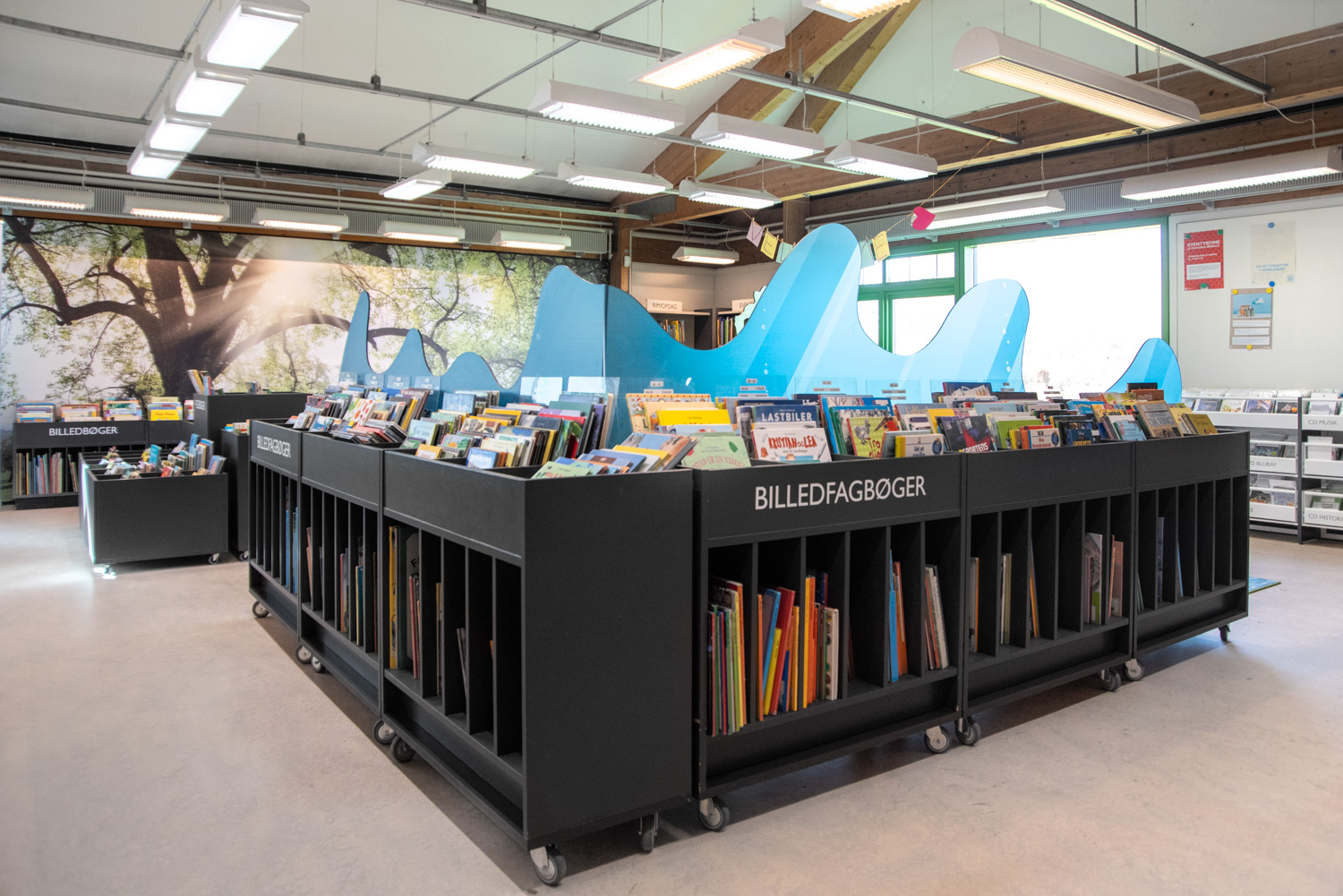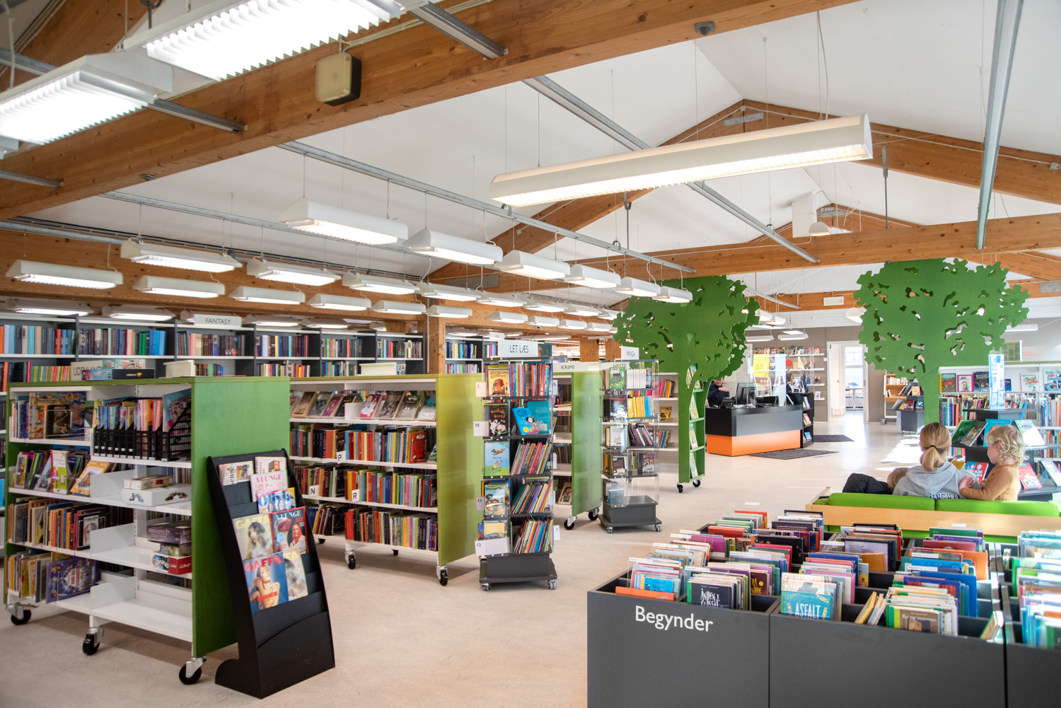 Die renovierte Kinderabteilung der Humlebæk-Bibliothek wurde 2021 fertiggestellt. Ziel war es, mehr Aufenthaltspläte hinzuzufügen und Naturelemente in die Bibliothek aufzunehmen.