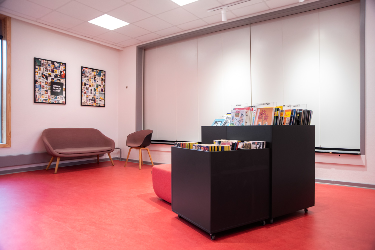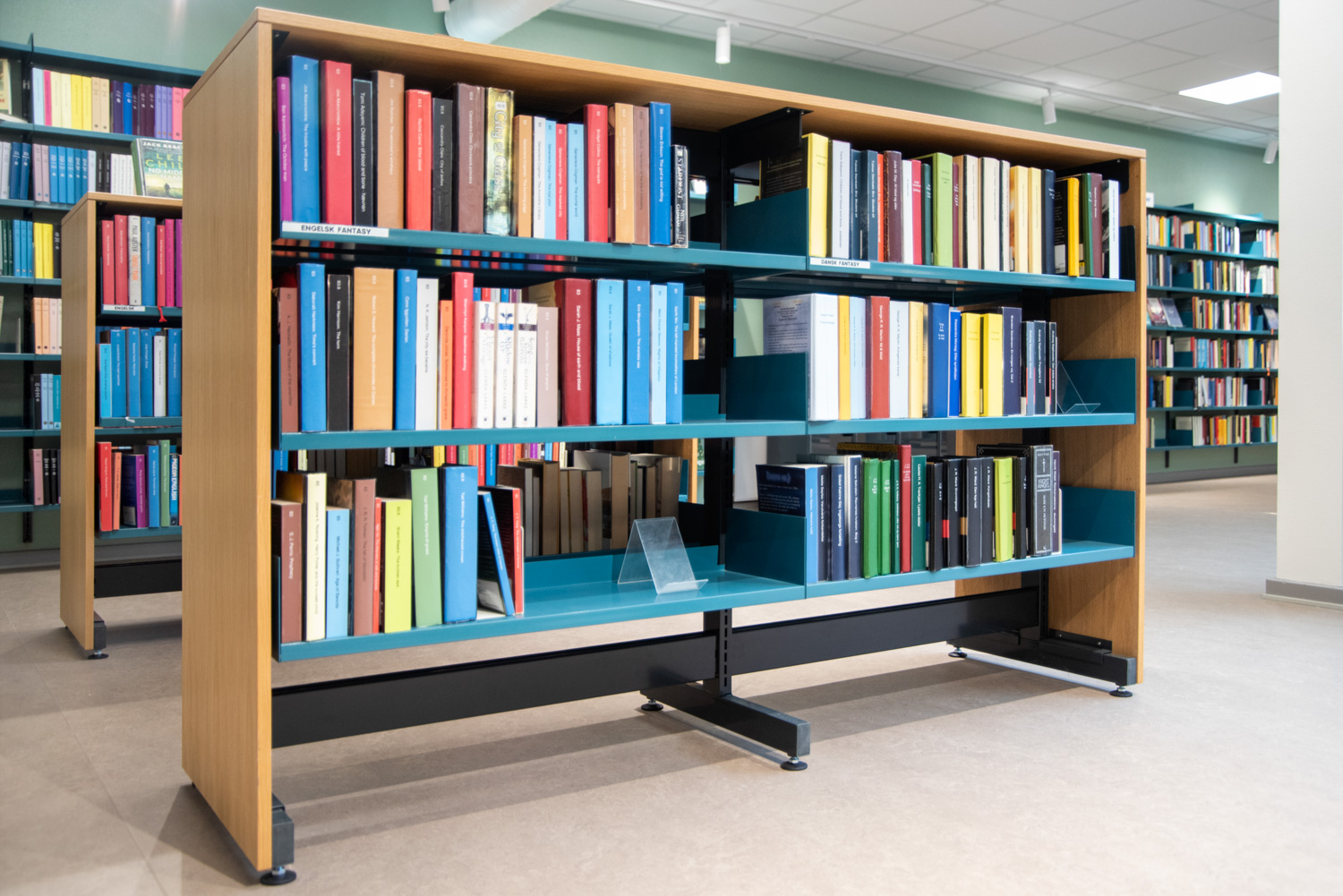 Die Bibliothek basiert auf den Werten Recycling und Nachhaltigkeit, weshalb das Gebäude renoviert und die alten Regalsysteme recycelt wurden. Ein Architekt war für die Renovierung verantwortlich, während Lammhults Biblioteksdesign für die Auswahl der Wandfarben und des gesamten Innenraums verantwortlich war. Durch die Modernisierung der Regalsysteme mit neuen Paneelen und die strategische Platzierung der blauen und Leseregale auf den neuen roten Böden wirkt die