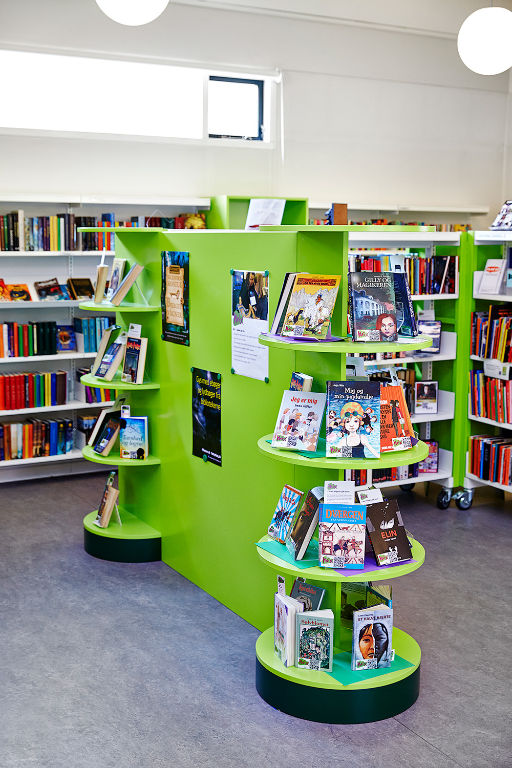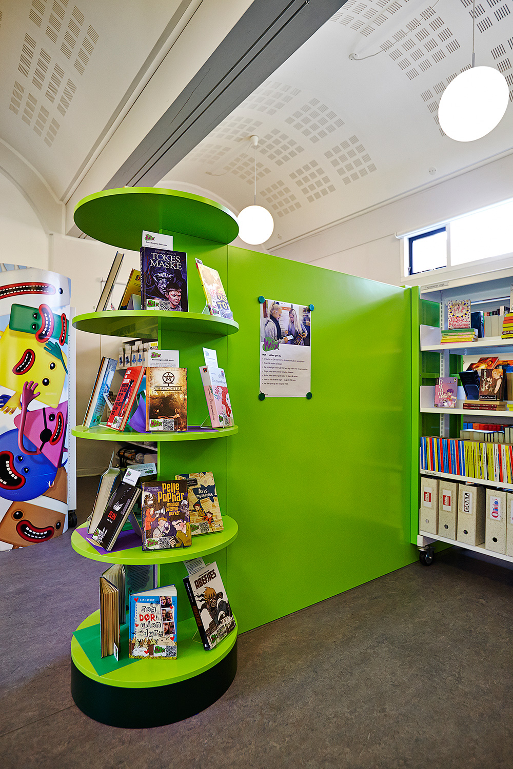 In der Zone zwischen Eingang und Kleinkindbereich gibt es einen Kinder- und Jugendbereich. Die vorhandenen Regale wurden zwecks optimaler Nutzung des Tageslichtes umgestellt. Ebenfalls sind neue Aufenthaltszonen wie maßgefertigte Lesenischen entstanden. Neben den Lesenischen umfassen die Sonderanfertigungen auch Display-Möbel.