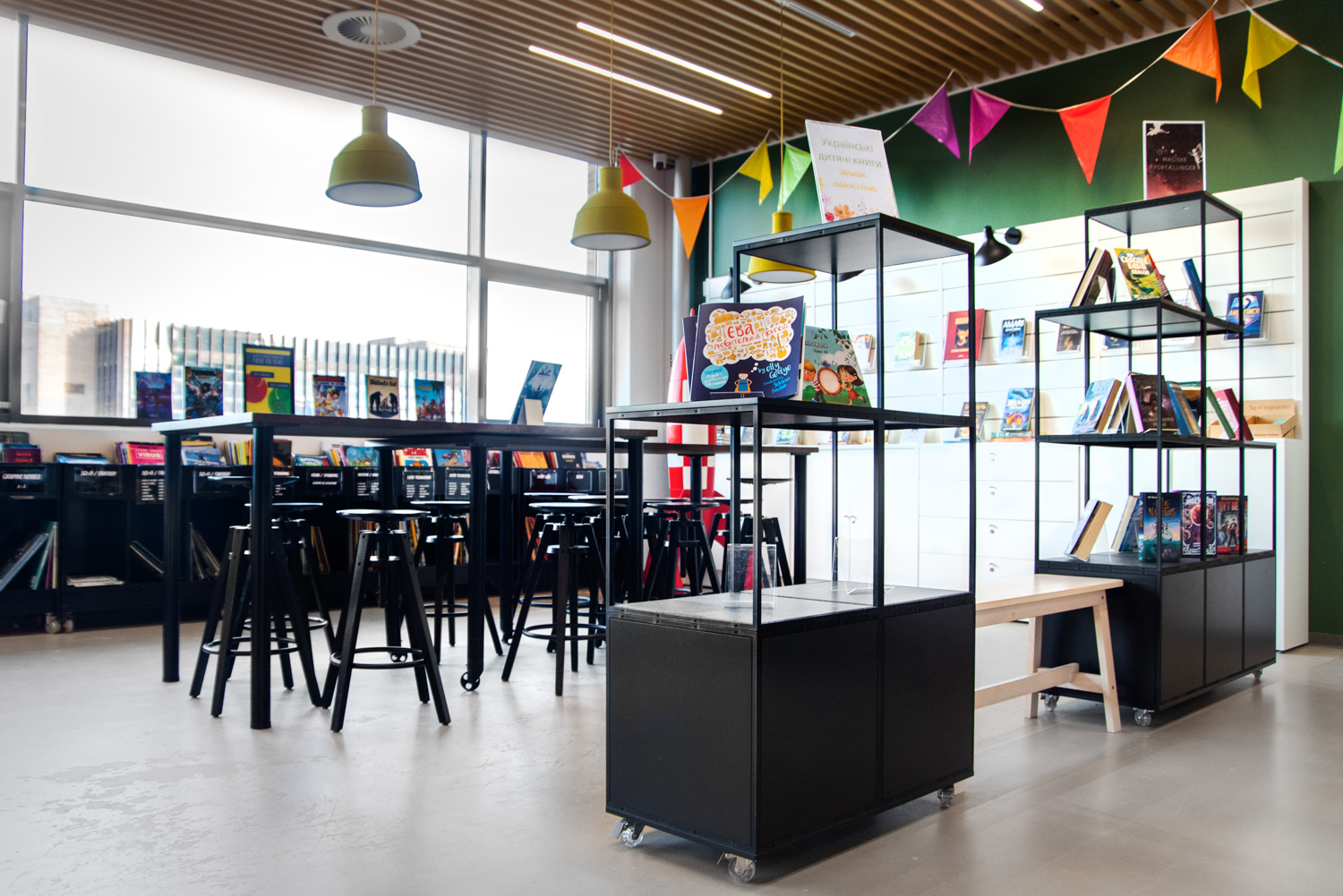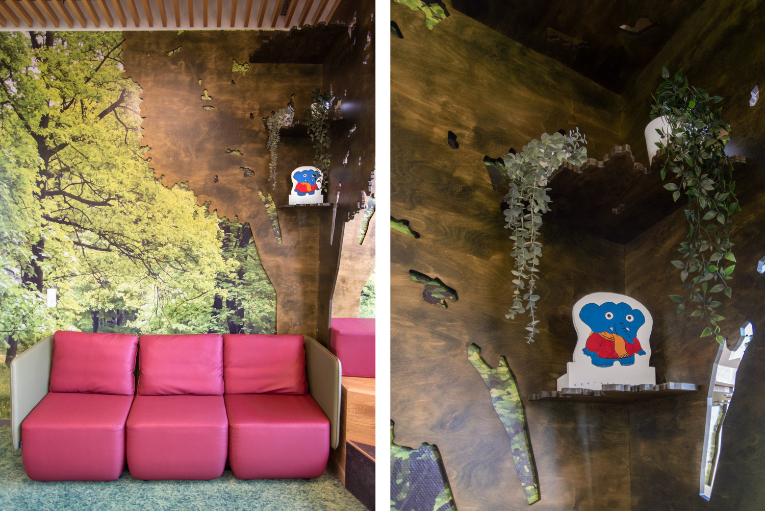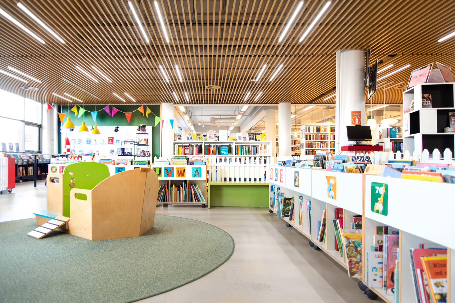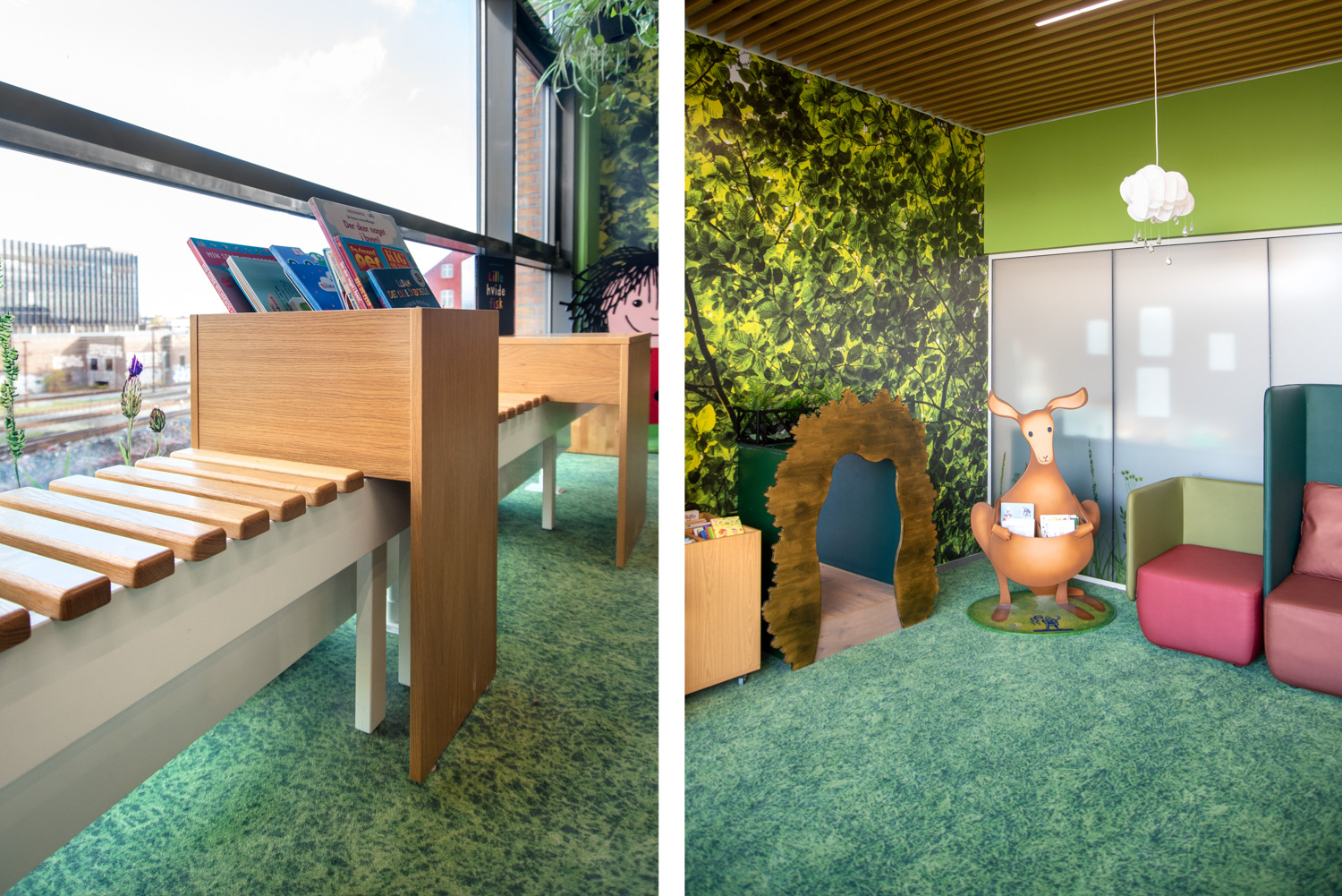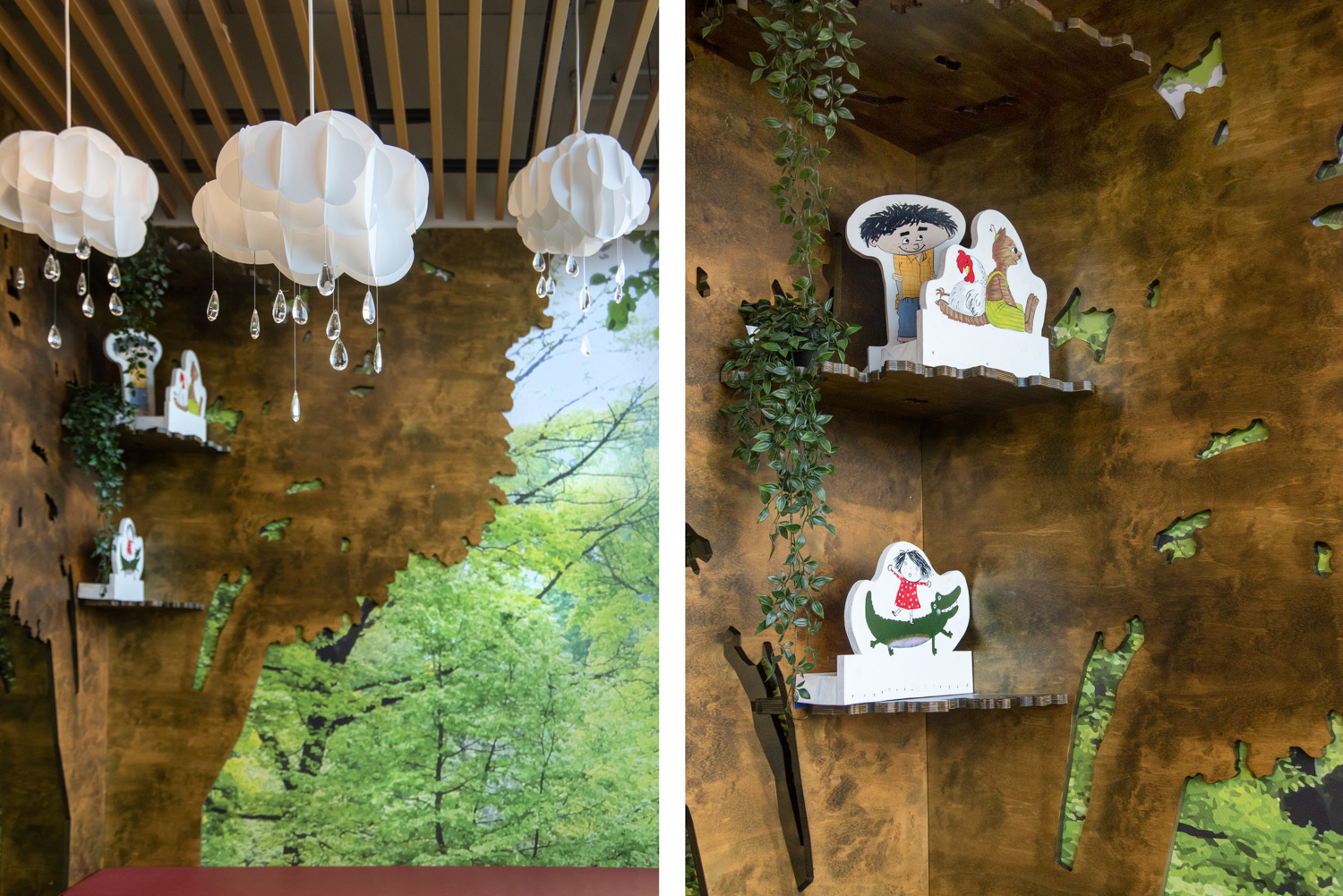Ein Zaun markiert den Eingang zum Kinderbereich, der auch ein Puzzle zwischen neuen und alten Möbeln war. Zwischen den Krippen wurden Zonen für Entspannen, Spielen und kreative Veranstaltungen geschaffen. Besonders fällt der "Garten" für die Kleinen auf. Geht man zwischen den kleinen Häusern am Waldrand hindurch, befindet man sich inmitten eines Gartens, der von Gras, Bäumen, Blumen und anderen schönen Dingen aus der Natur umgeben ist. Die Szenografie ist mit der Präsentation von Büchern verflochten, sodass Literatur Teil des Erlebnisses wird.