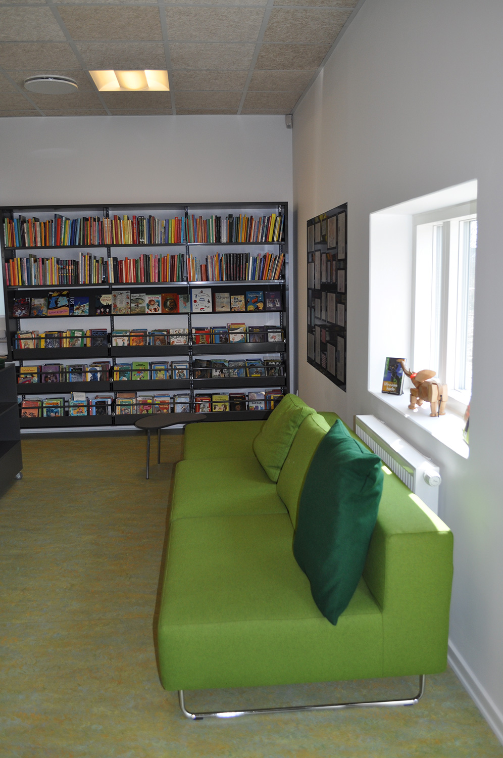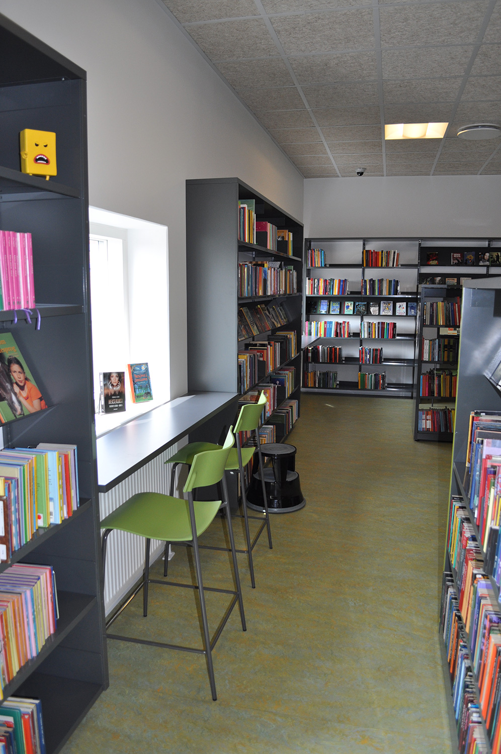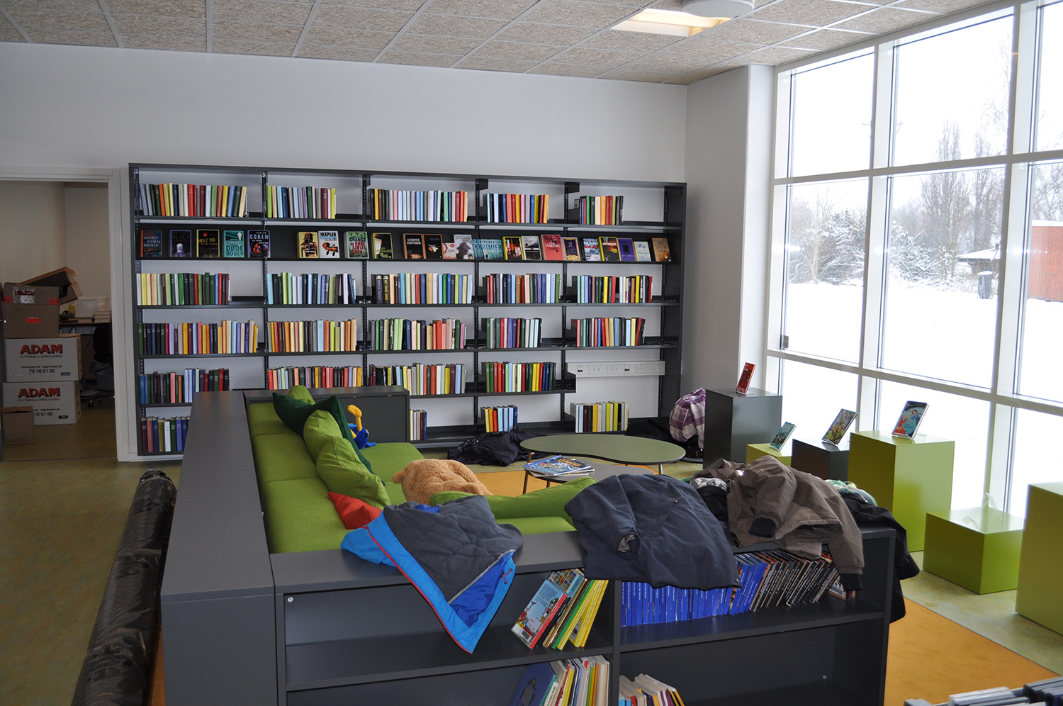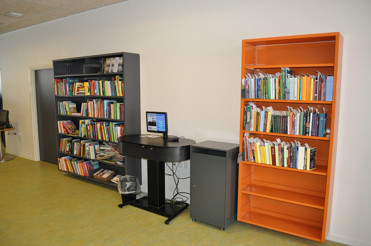 Die Regale sind individuell angepasst, es gibt integrierte Computertische und viele andere maßgeschneiderte Lösungen. Zum Beispiel farbige Wände zwischen den Regalen, die Freude ausstrahlen, und abgeschiedene Bereiche für die Benutzer.